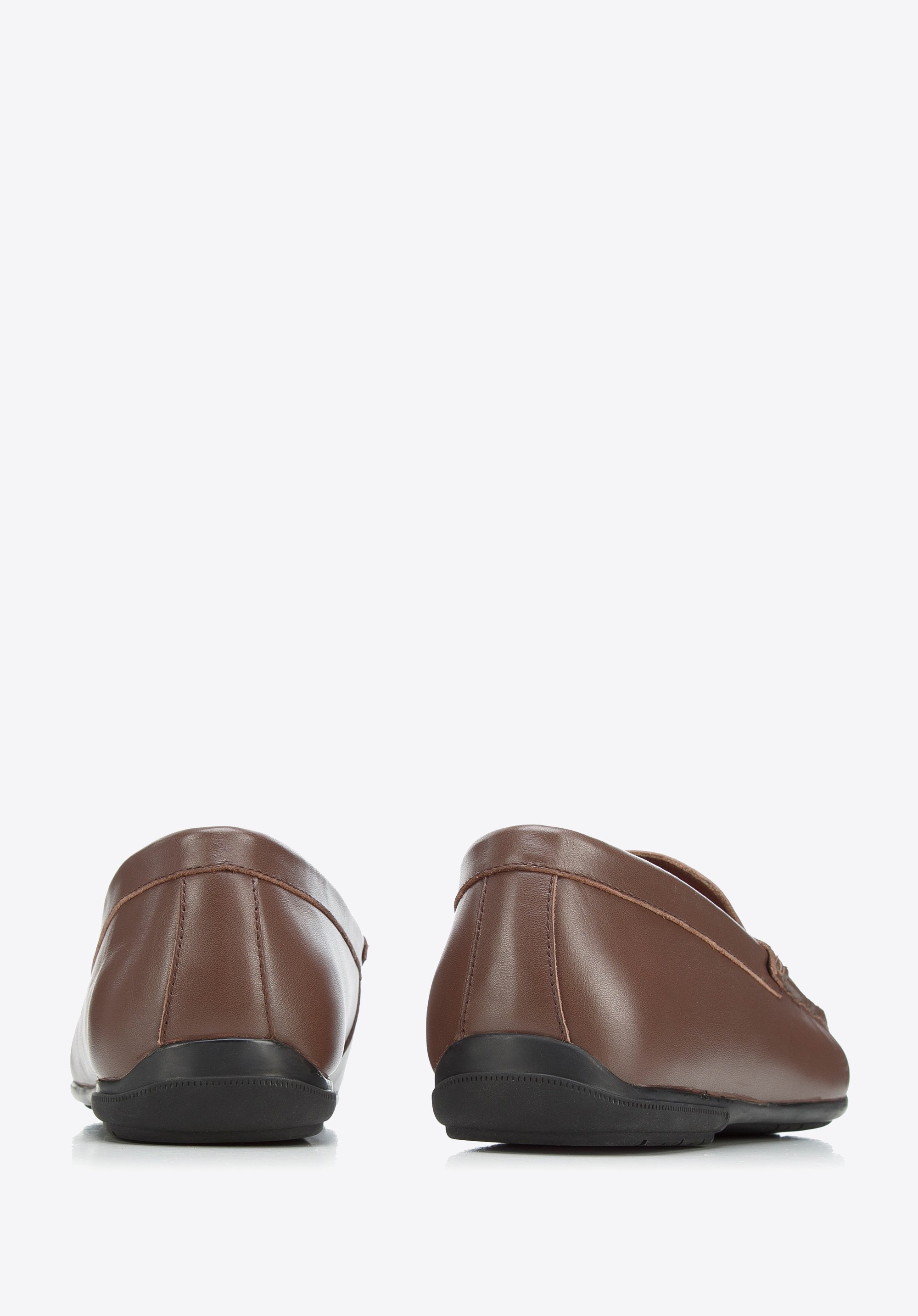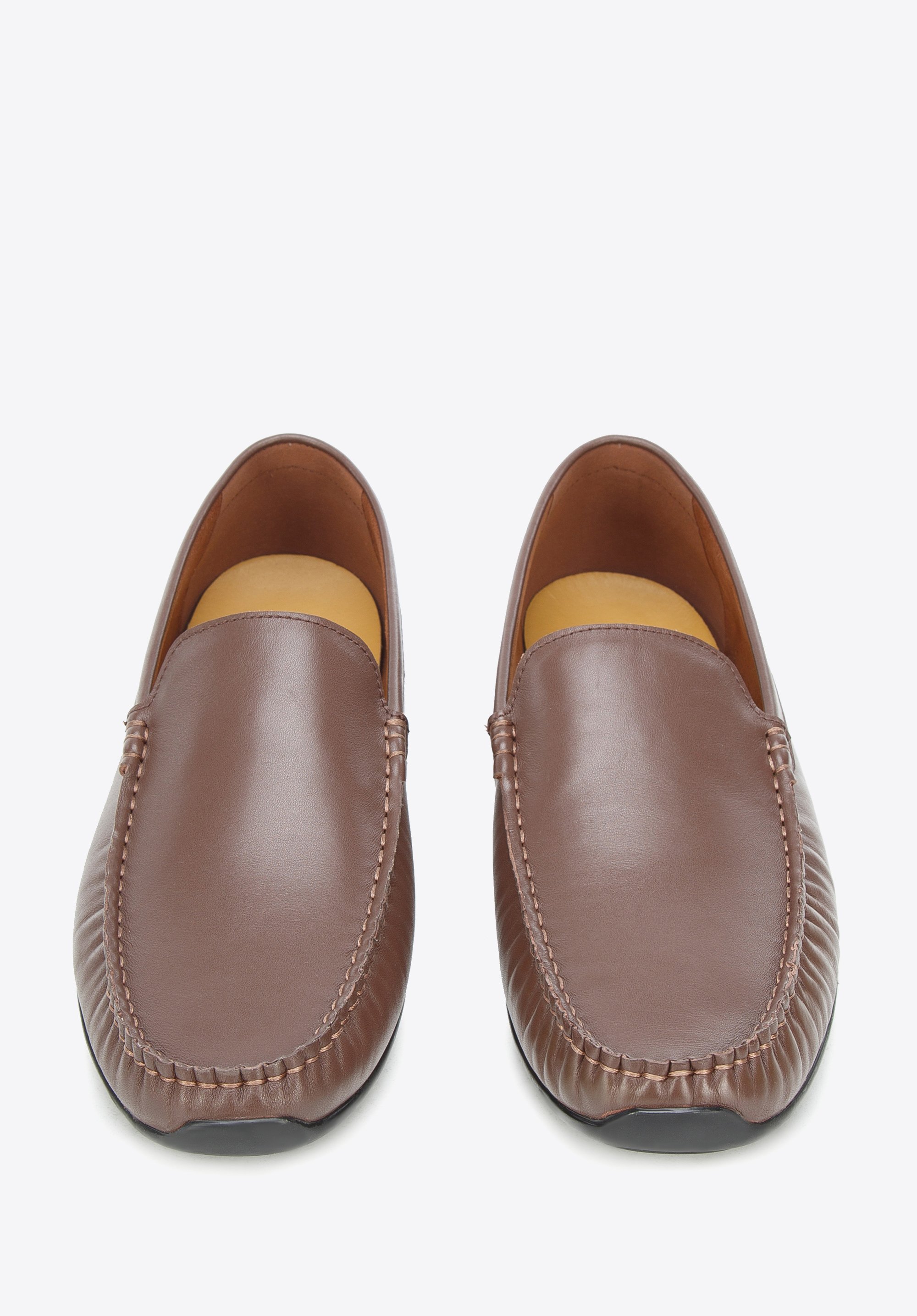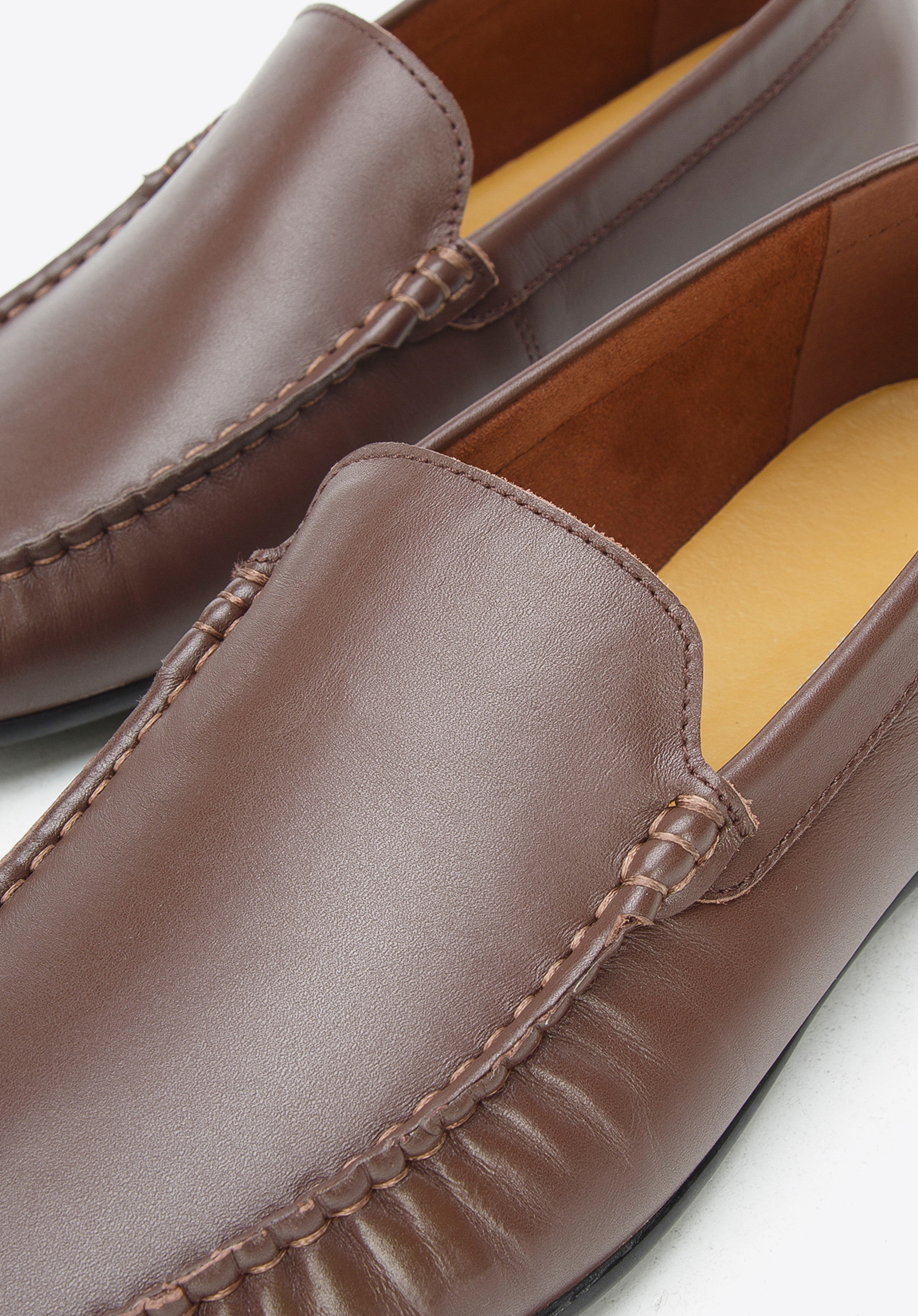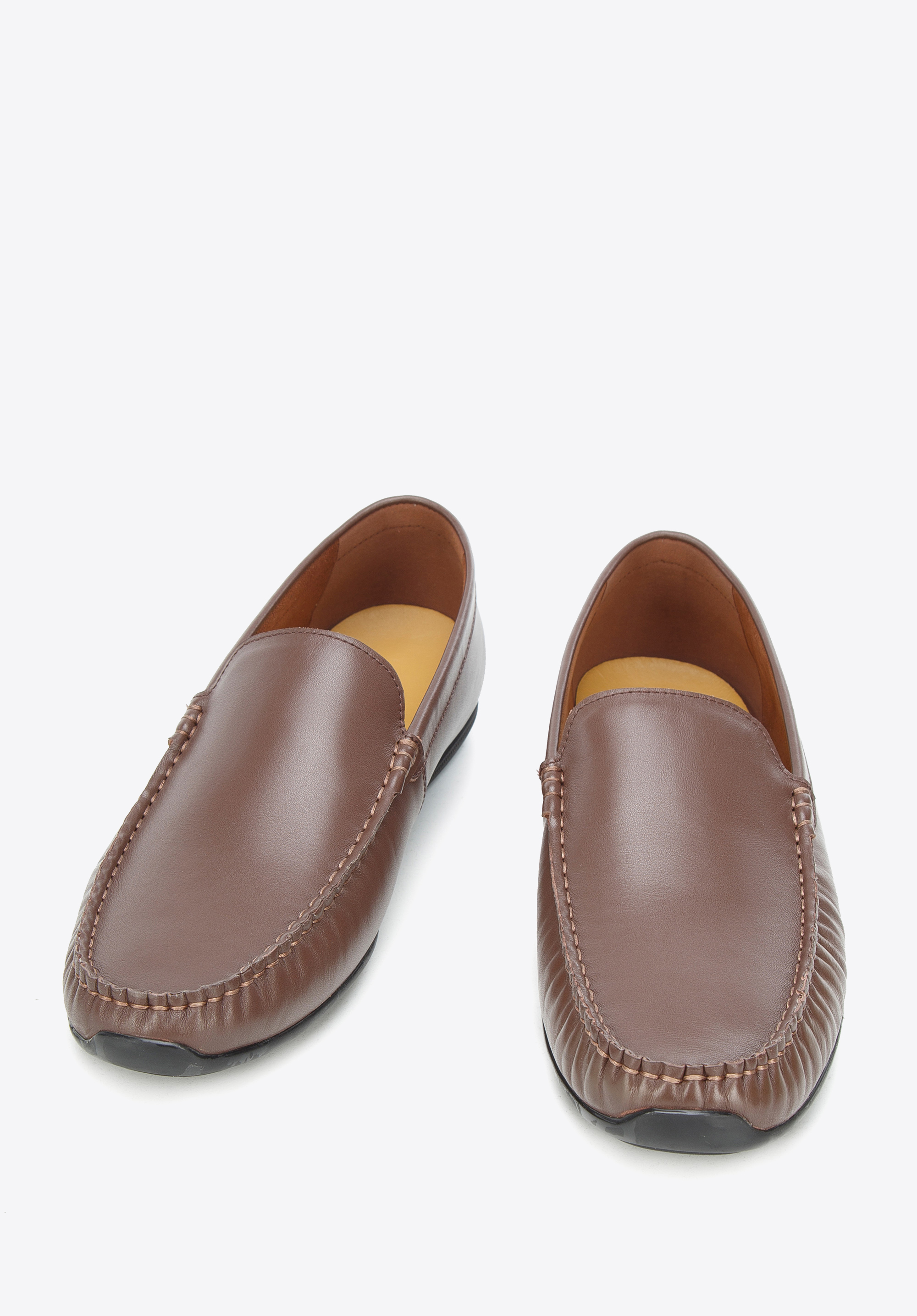 Te stylowe męskie mokasyny to świetny dodatek dla każdego eleganckiego mężczyzny. Wykonane zostały z miękkiej skóry naturalnej, która świetnie dopasowuje się do stopy, a skórzana wkładka zadba o komfort stóp przez cały dzień. Buty mają typową dla mokasynów samochodowych zaokrągloną gumową podeszwę bez zaznaczonego obcasa – elastyczną i prezentującą się stylowo. Klasyczny fason mokasynów z obszytym noskiem sprawdzi się do wielu eleganckich, jak i codziennych ubrań. Możesz je włożyć na przykład do dżinsów i koszuli, ale także do letniego, nieformalnego garnituru z bawełny czy lnu. Klasyczne męskie mokasyny skórzane to stylowy dodatek, który warto mieć w szafie.