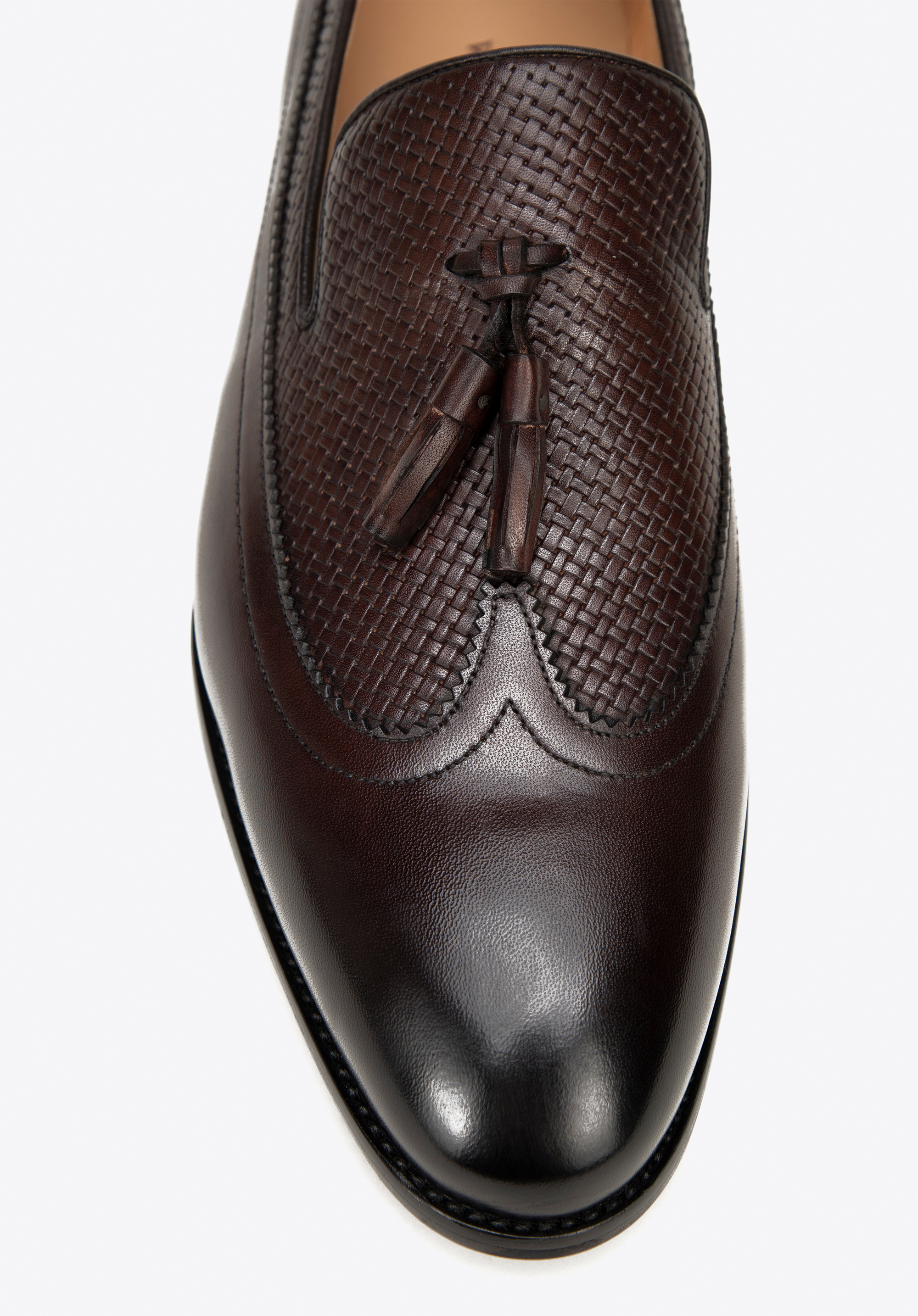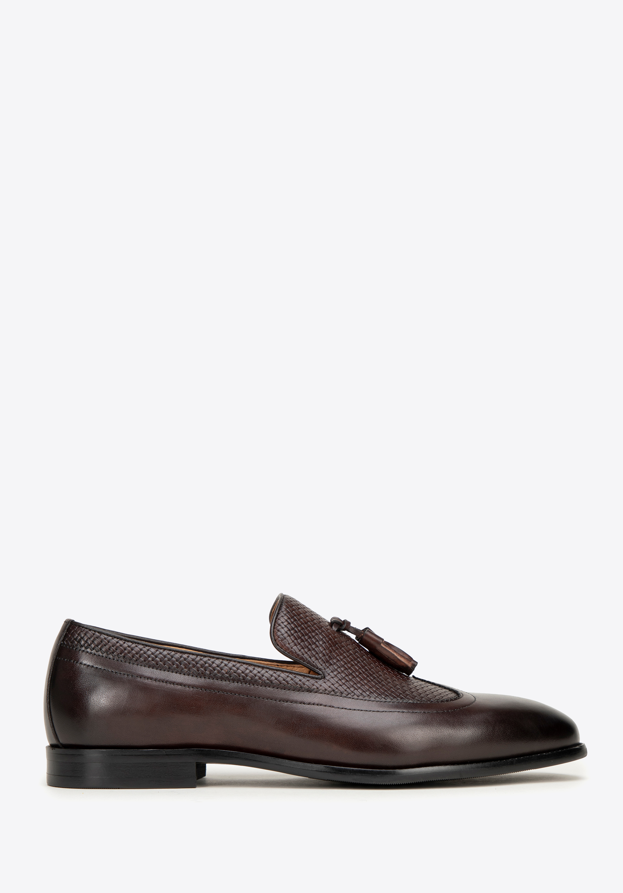 Męskie mokasyny skórzane z plecionką i chwostem sprawdzą się w biurze, podczas biznesowych spotkań oraz w eleganckich stylizacjach smart casual. Naturalna skóra licowa, miękka wyściółka i stabilna podeszwa zapewniają komfort przez wiele godzin, a dekoracyjne detale podkreślają wyrafinowany charakter.