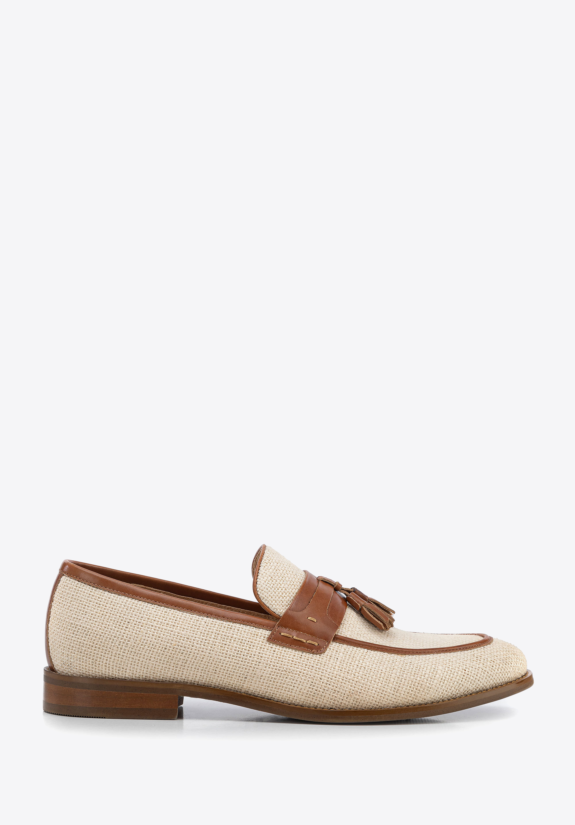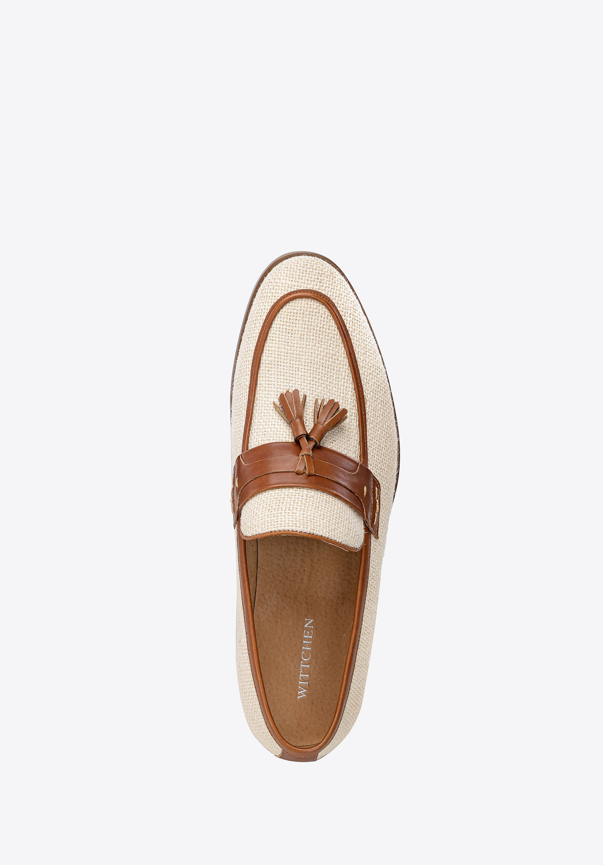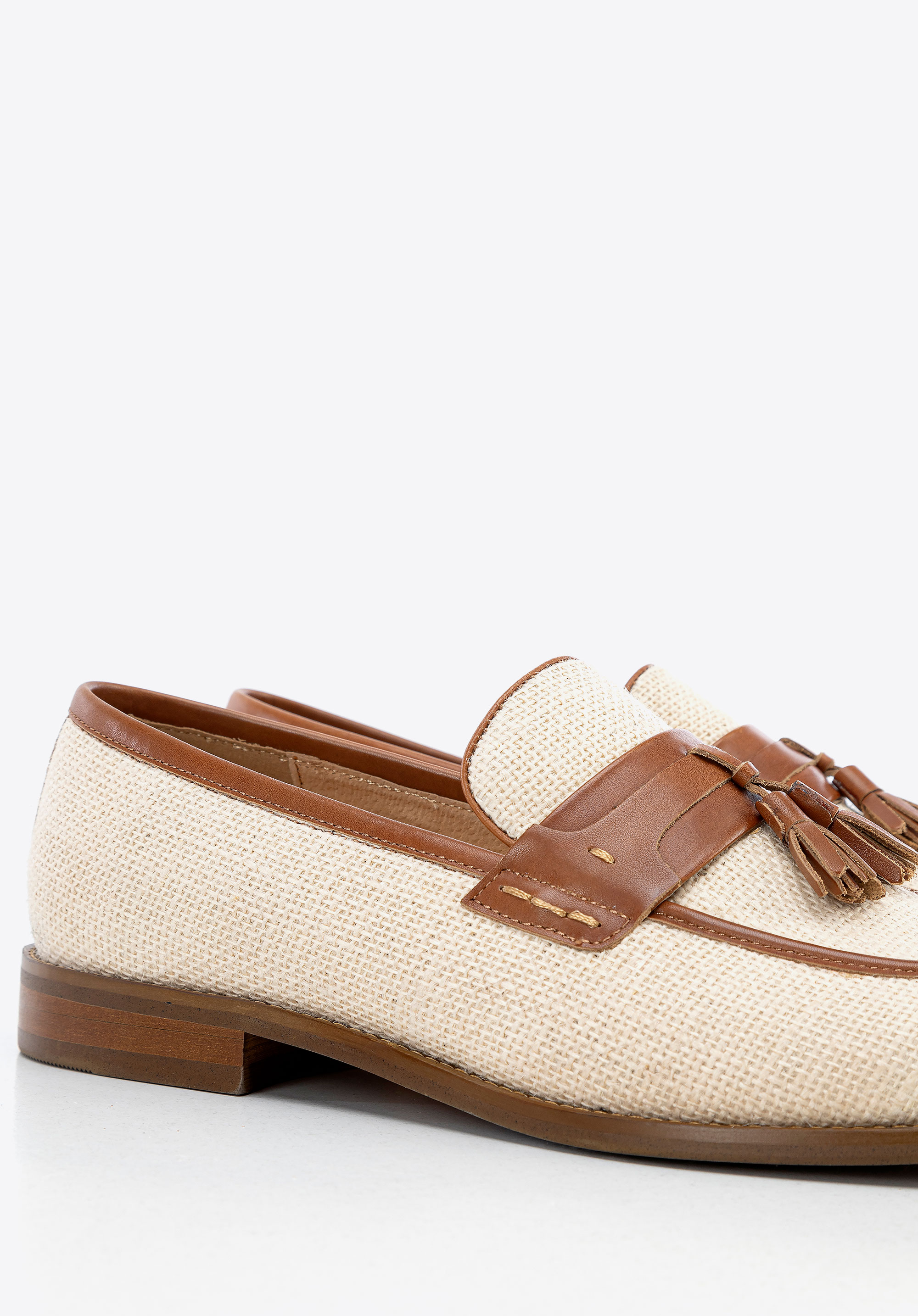 Eleganckie męskie mokasyny, które doskonale łączą ponadczasową klasykę z nowoczesnym stylem. Starannie wykonane z wysokiej jakości skóry bydlęcej i lnu, zapewniają wygodę oraz niezrównaną trwałość na co dzień. Charakterystyczny migdałowy nosek i płaski obcas nadają mokasynom elegancki wygląd, jednocześnie zachowując ich subtelną, uniwersalną formę. Wsuwany fason, wzbogacony o dwa stylowe chwosty, to idealne połączenie elegancji i casualowego charakteru.