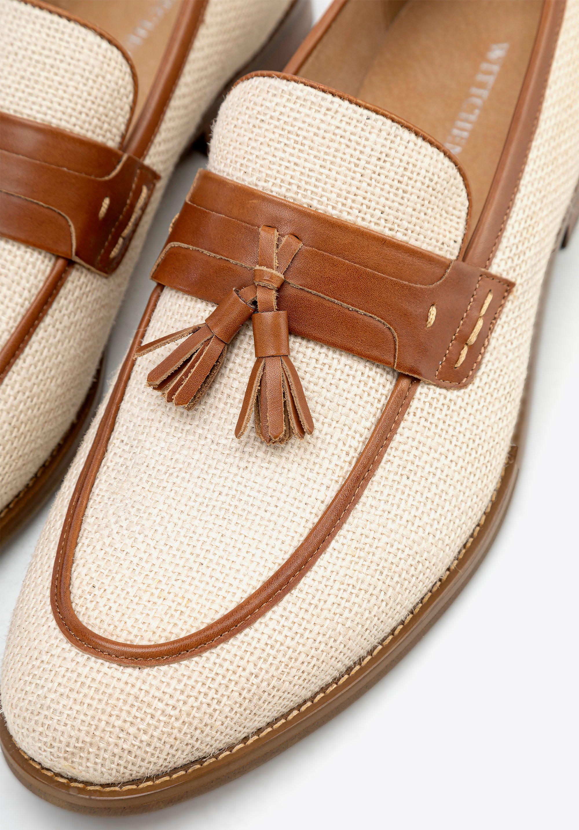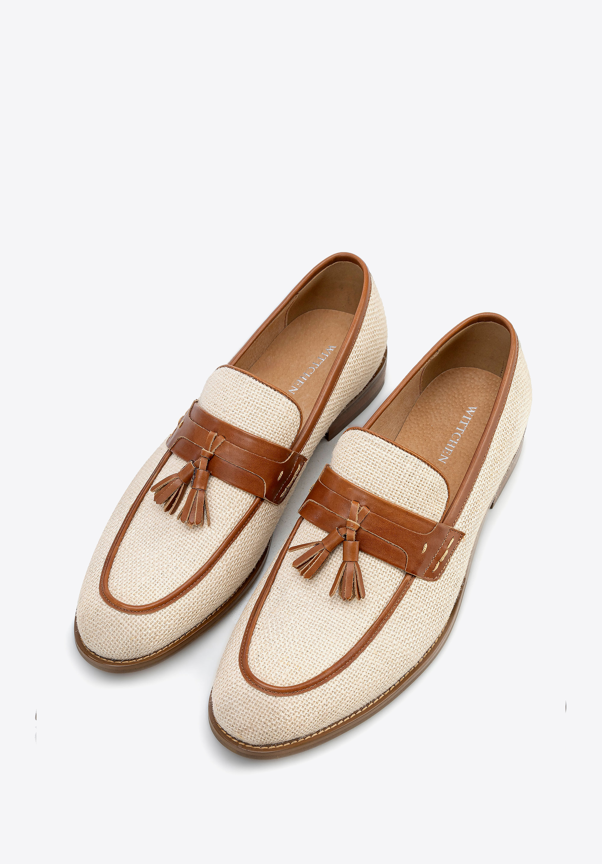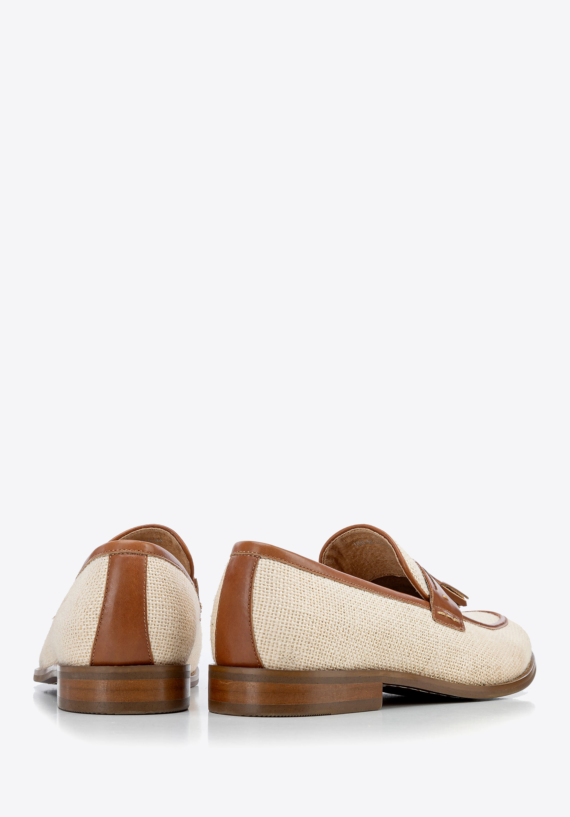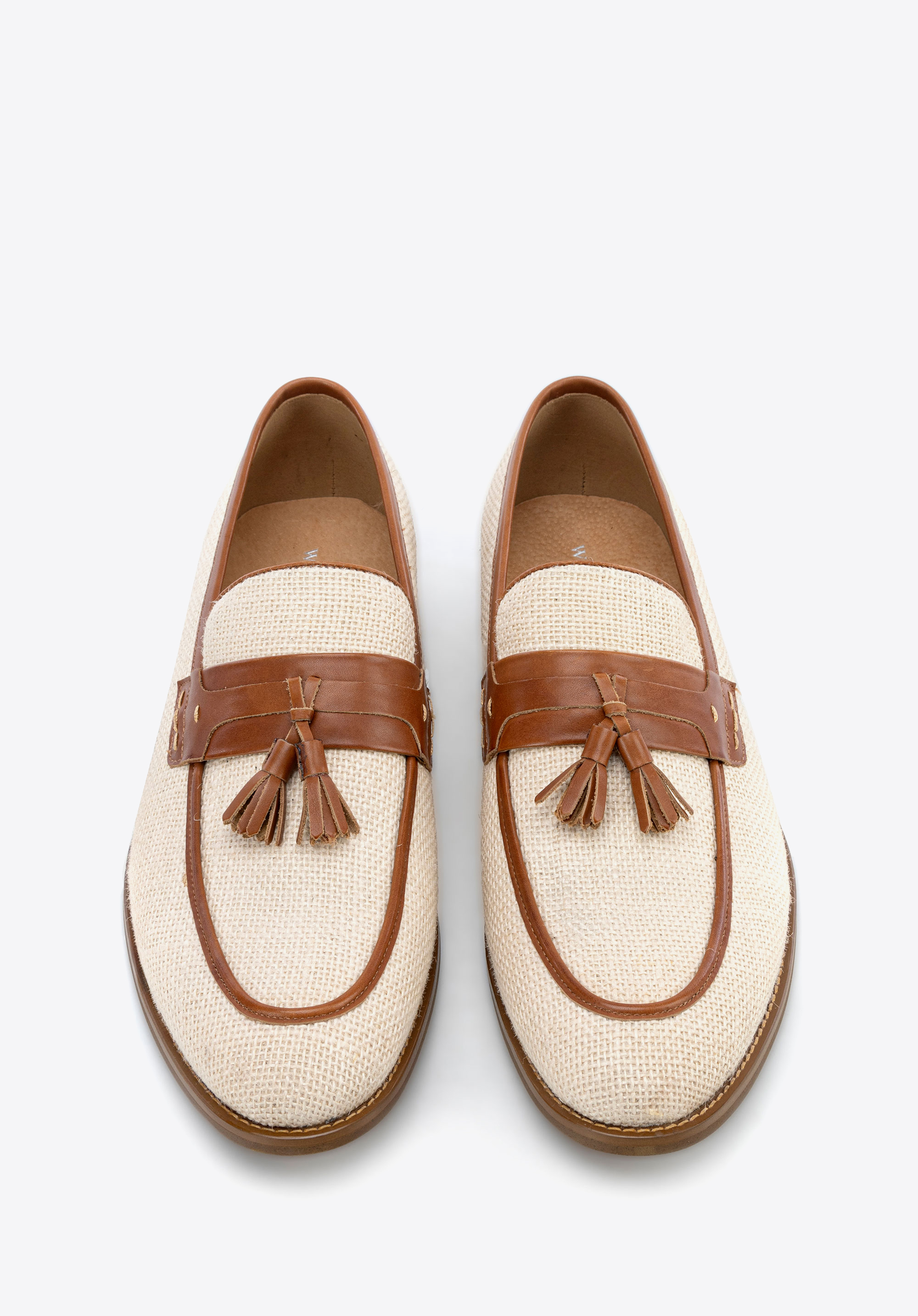 Eleganckie męskie mokasyny, które doskonale łączą ponadczasową klasykę z nowoczesnym stylem. Starannie wykonane z wysokiej jakości skóry bydlęcej i lnu, zapewniają wygodę oraz niezrównaną trwałość na co dzień. Charakterystyczny migdałowy nosek i płaski obcas nadają mokasynom elegancki wygląd, jednocześnie zachowując ich subtelną, uniwersalną formę. Wsuwany fason, wzbogacony o dwa stylowe chwosty, to idealne połączenie elegancji i casualowego charakteru.