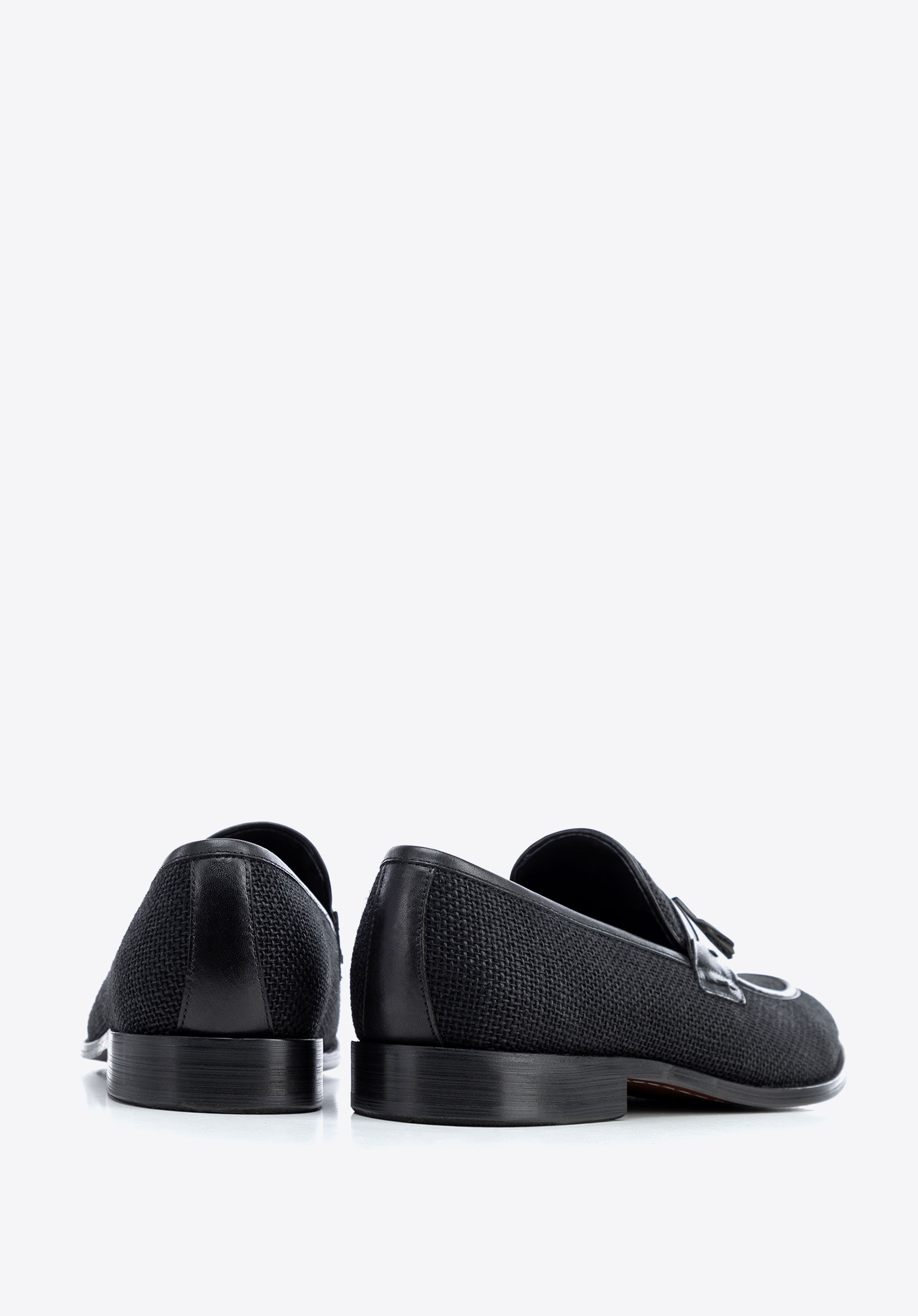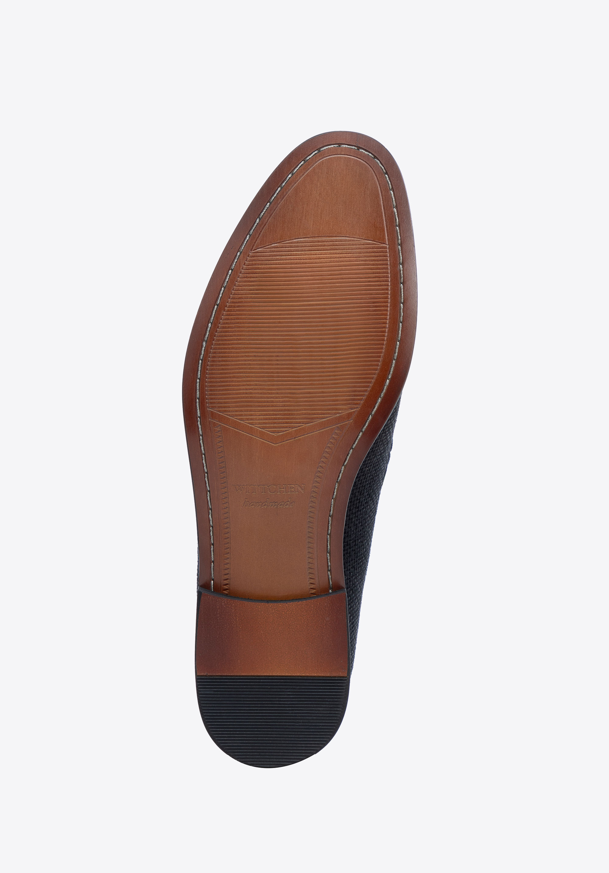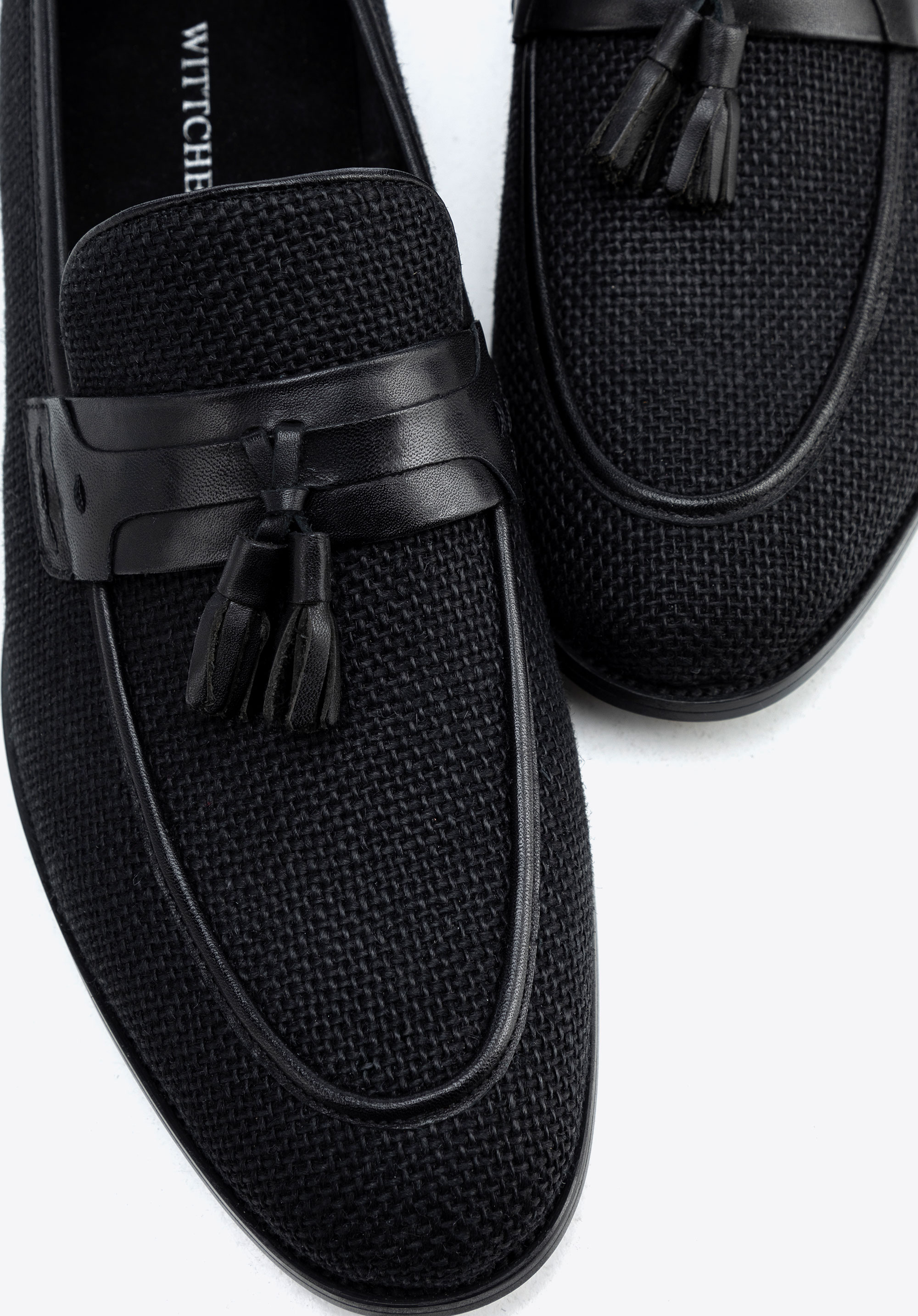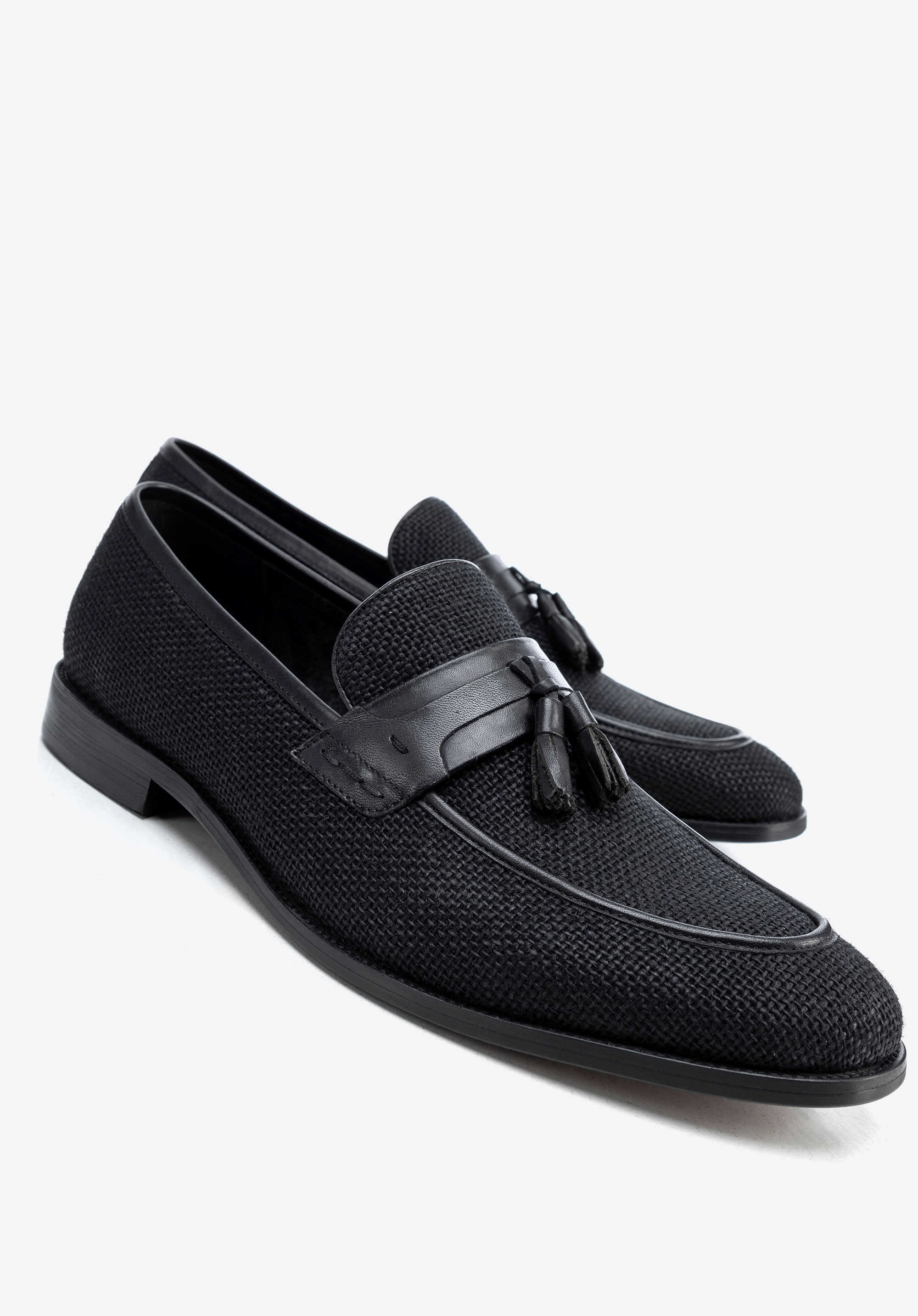 Eleganckie męskie mokasyny, które doskonale łączą ponadczasową klasykę z nowoczesnym stylem. Starannie wykonane z wysokiej jakości skóry bydlęcej i lnu, zapewniają wygodę oraz niezrównaną trwałość na co dzień. Charakterystyczny migdałowy nosek i płaski obcas nadają mokasynom elegancki wygląd, jednocześnie zachowując ich subtelną, uniwersalną formę. Wsuwany fason, wzbogacony o dwa stylowe chwosty, to idealne połączenie elegancji i casualowego charakteru.