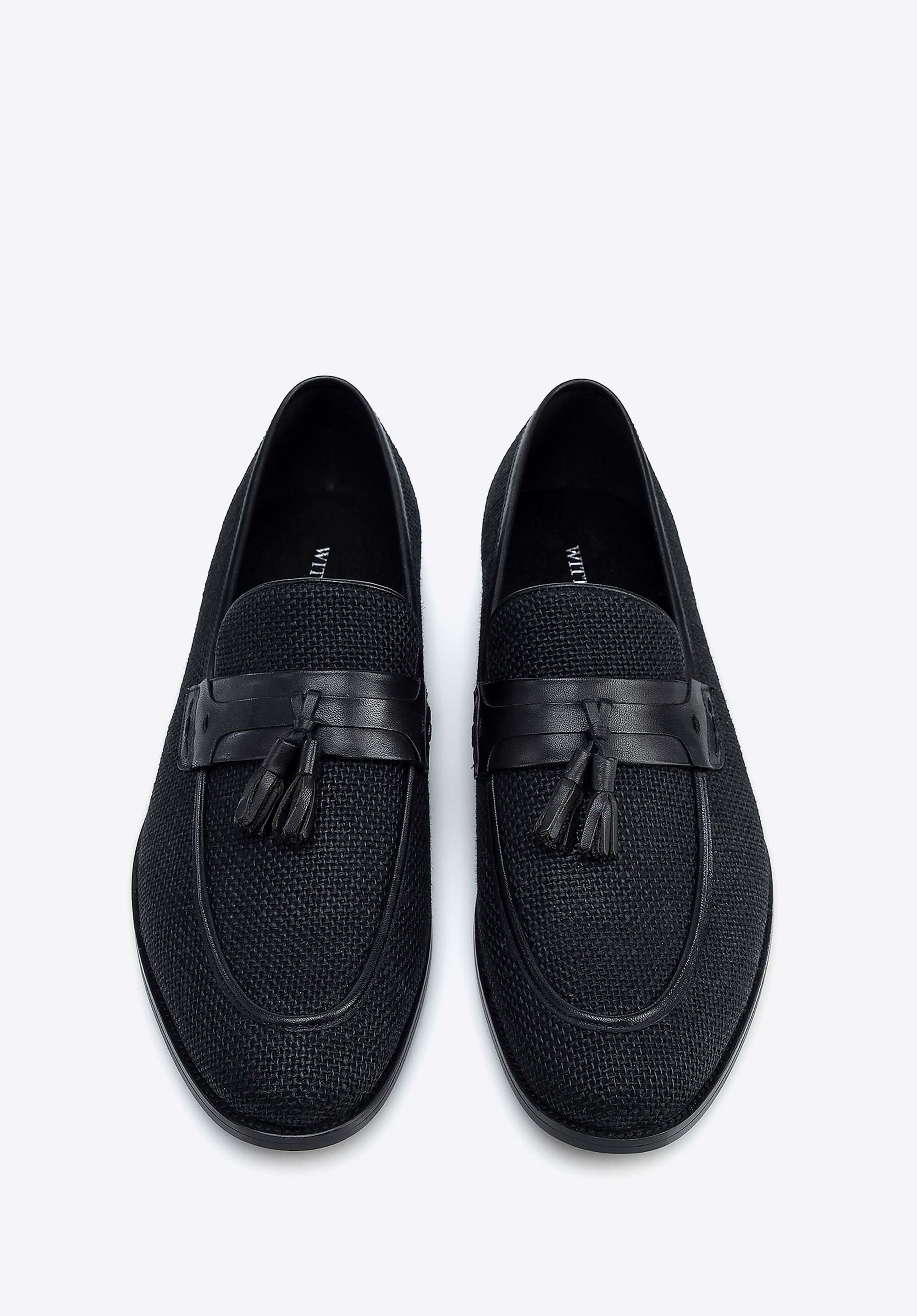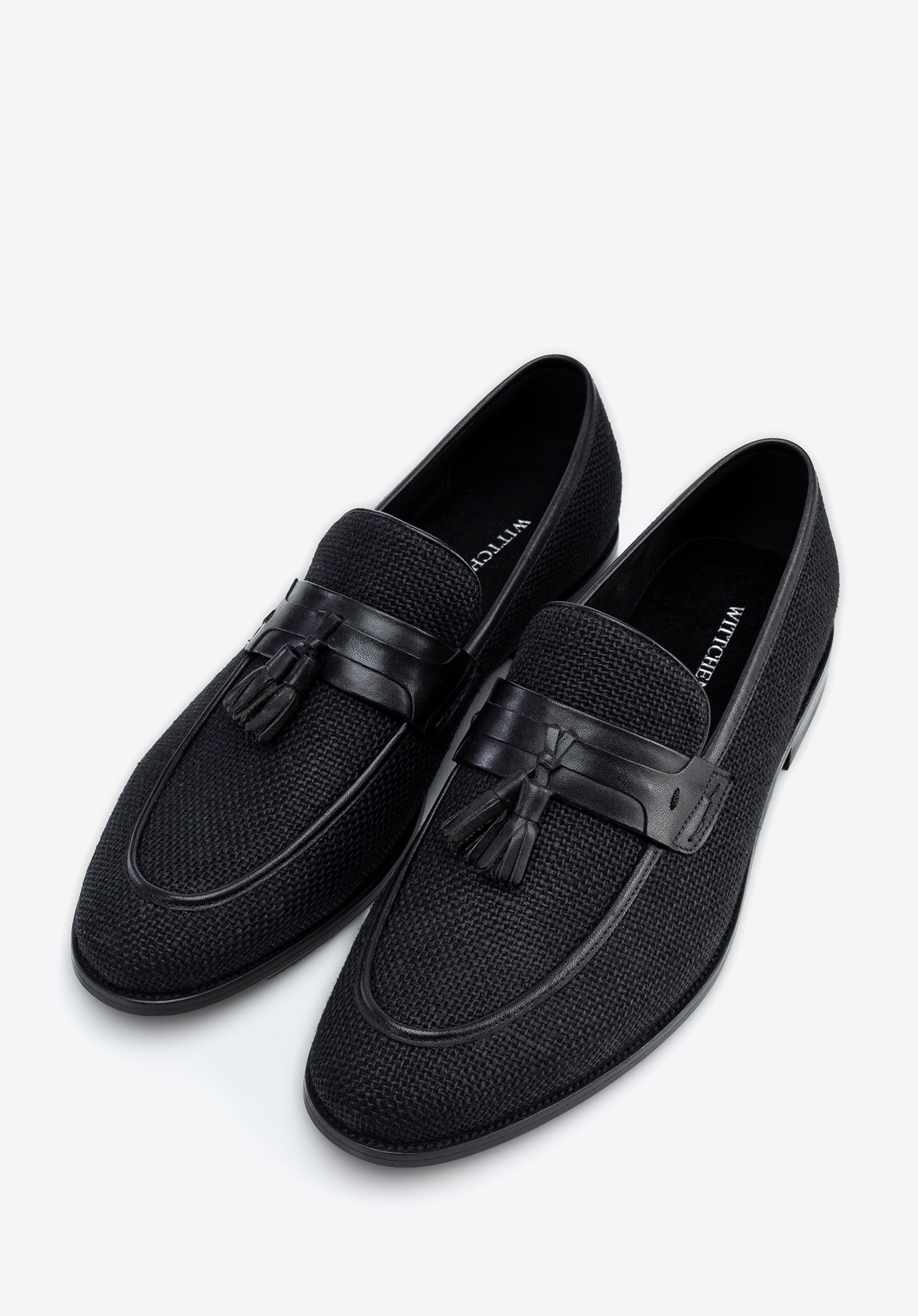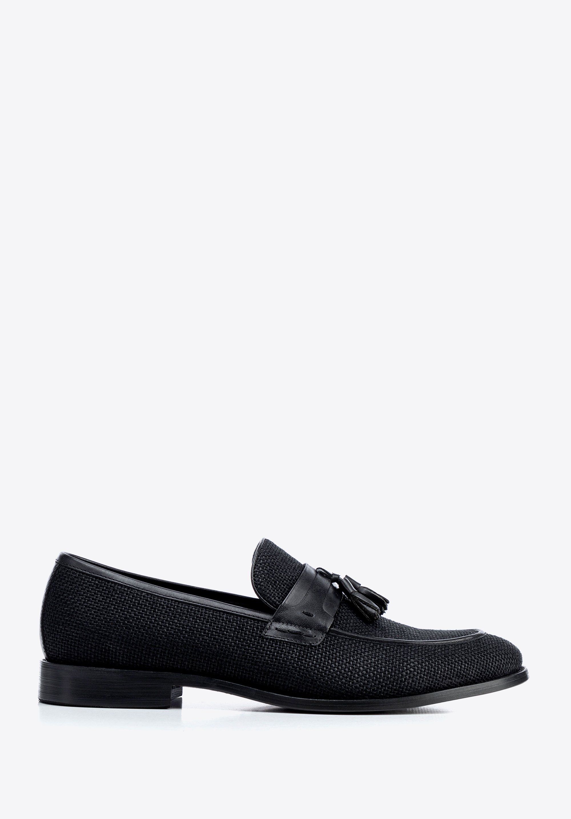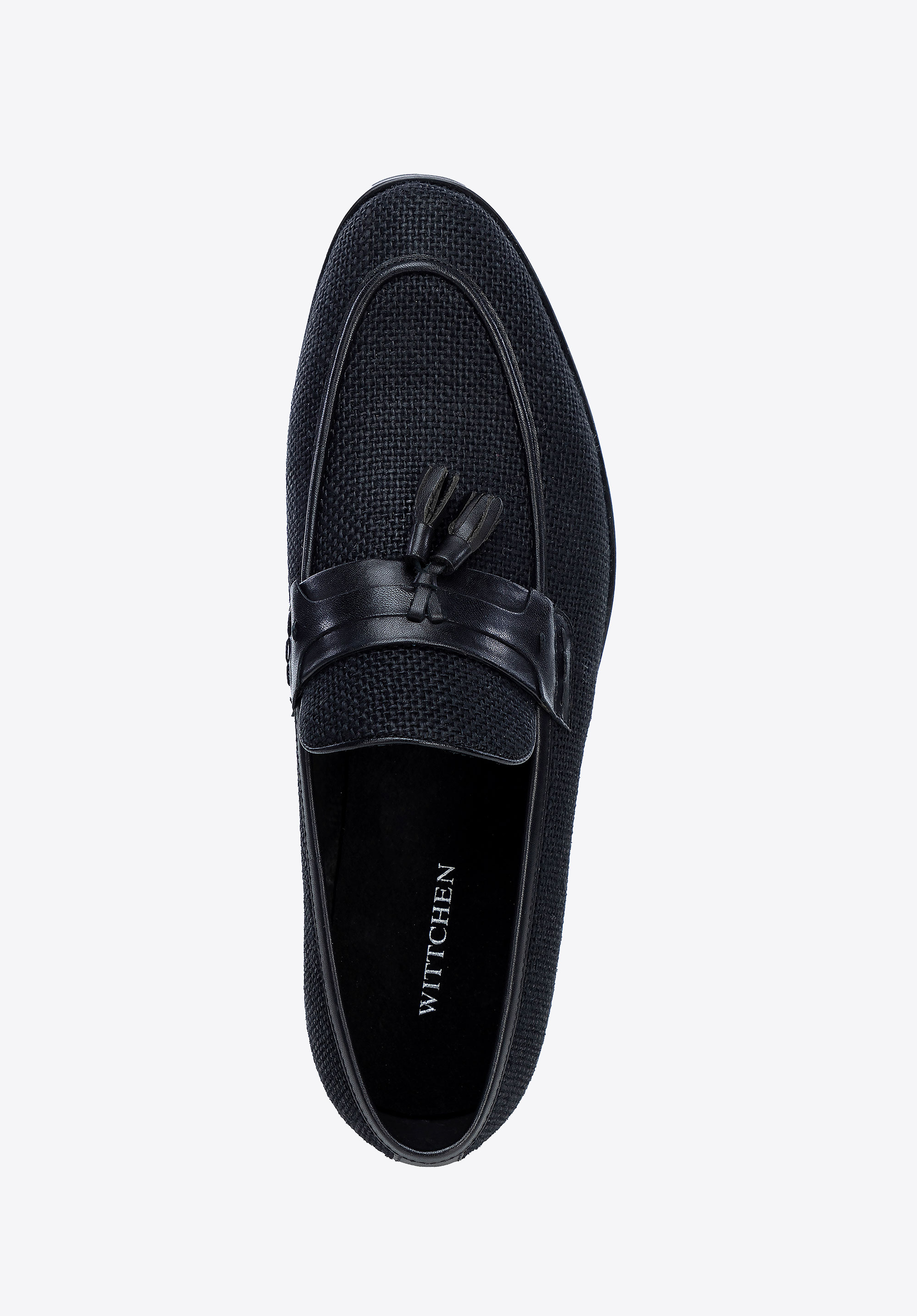 Eleganckie męskie mokasyny, które doskonale łączą ponadczasową klasykę z nowoczesnym stylem. Starannie wykonane z wysokiej jakości skóry bydlęcej i lnu, zapewniają wygodę oraz niezrównaną trwałość na co dzień. Charakterystyczny migdałowy nosek i płaski obcas nadają mokasynom elegancki wygląd, jednocześnie zachowując ich subtelną, uniwersalną formę. Wsuwany fason, wzbogacony o dwa stylowe chwosty, to idealne połączenie elegancji i casualowego charakteru.