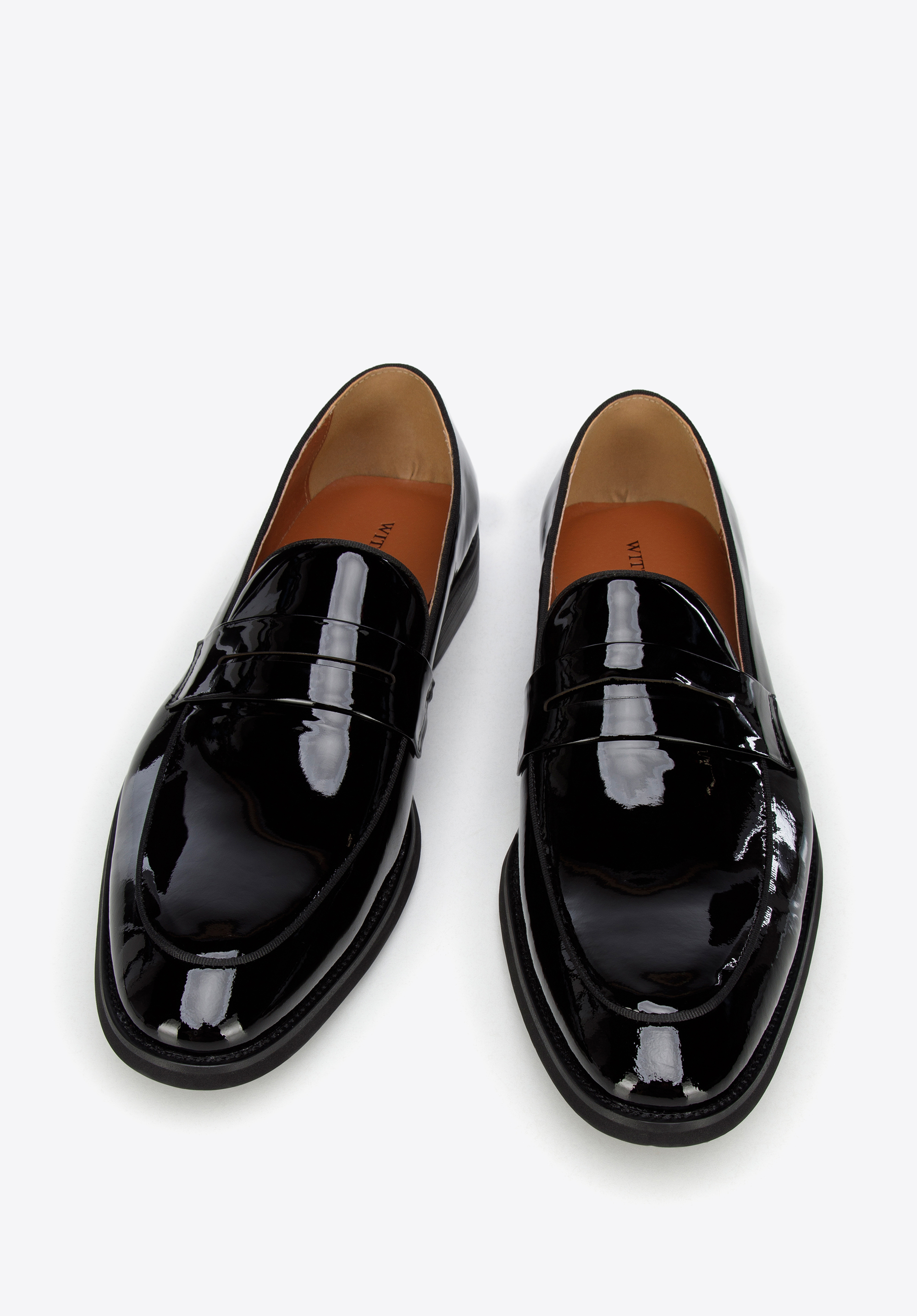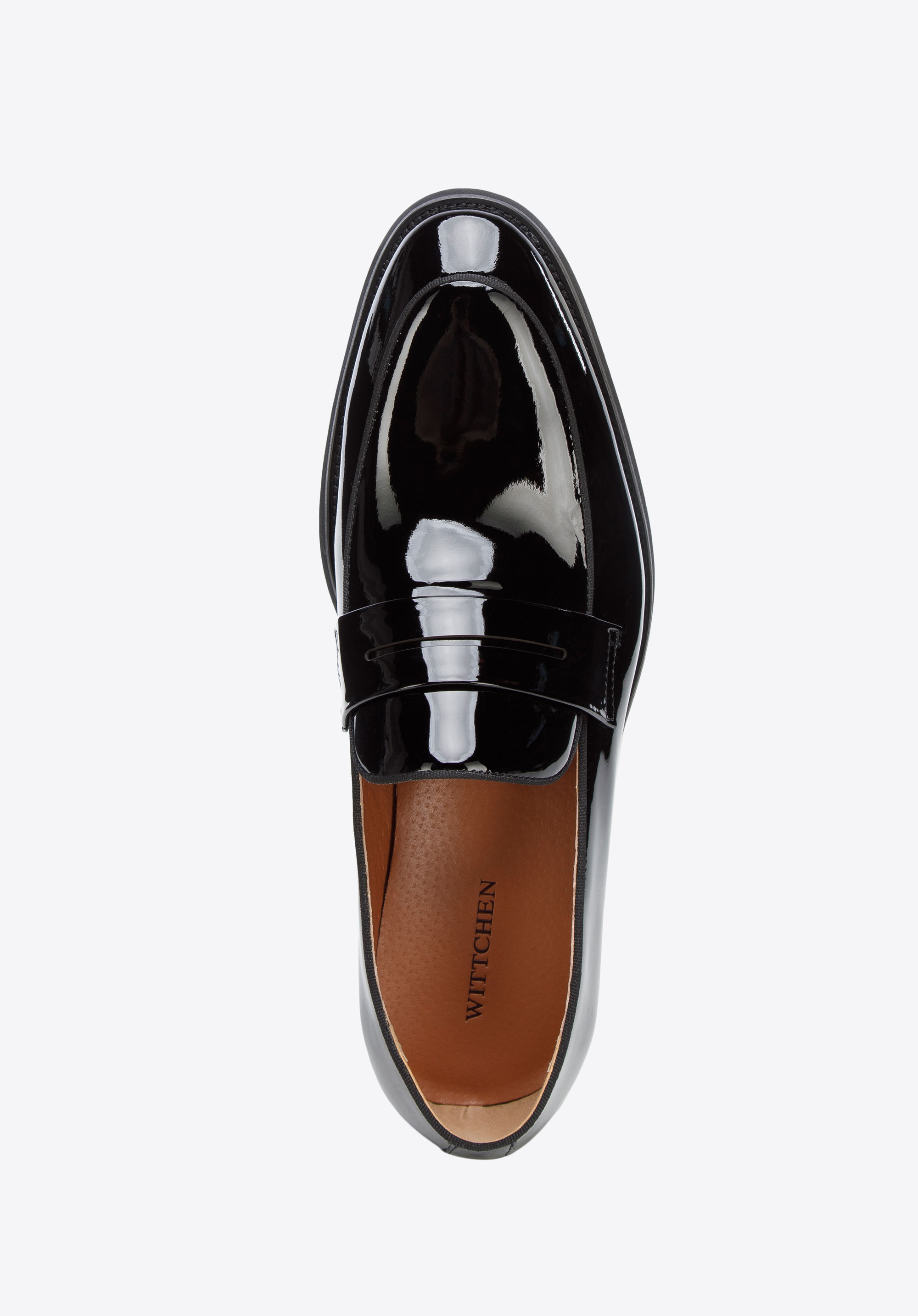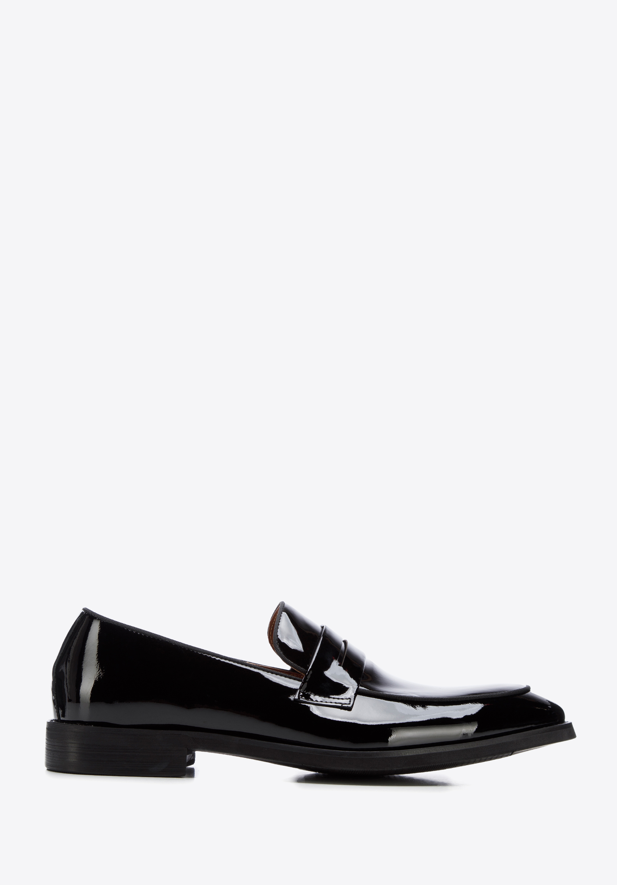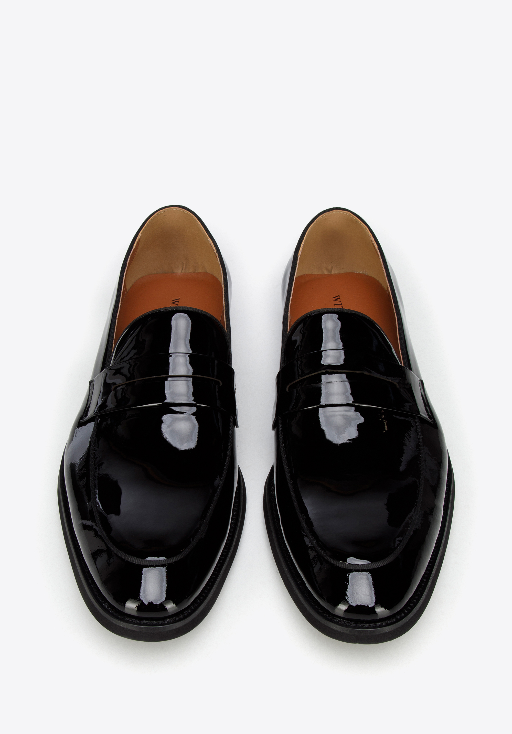 Męskie mokasyny z lakierowanej skóry sprawdzą się na uroczystościach, kolacjach i w stylizacjach, w których chcesz podkreślić elegancję nowoczesnym połyskiem. Lakierowana skóra, pensówkowy detal z przodu, skórzana wkładka i lekka podeszwa zapewniają wygodę oraz wyrazisty, dopracowany wygląd.
