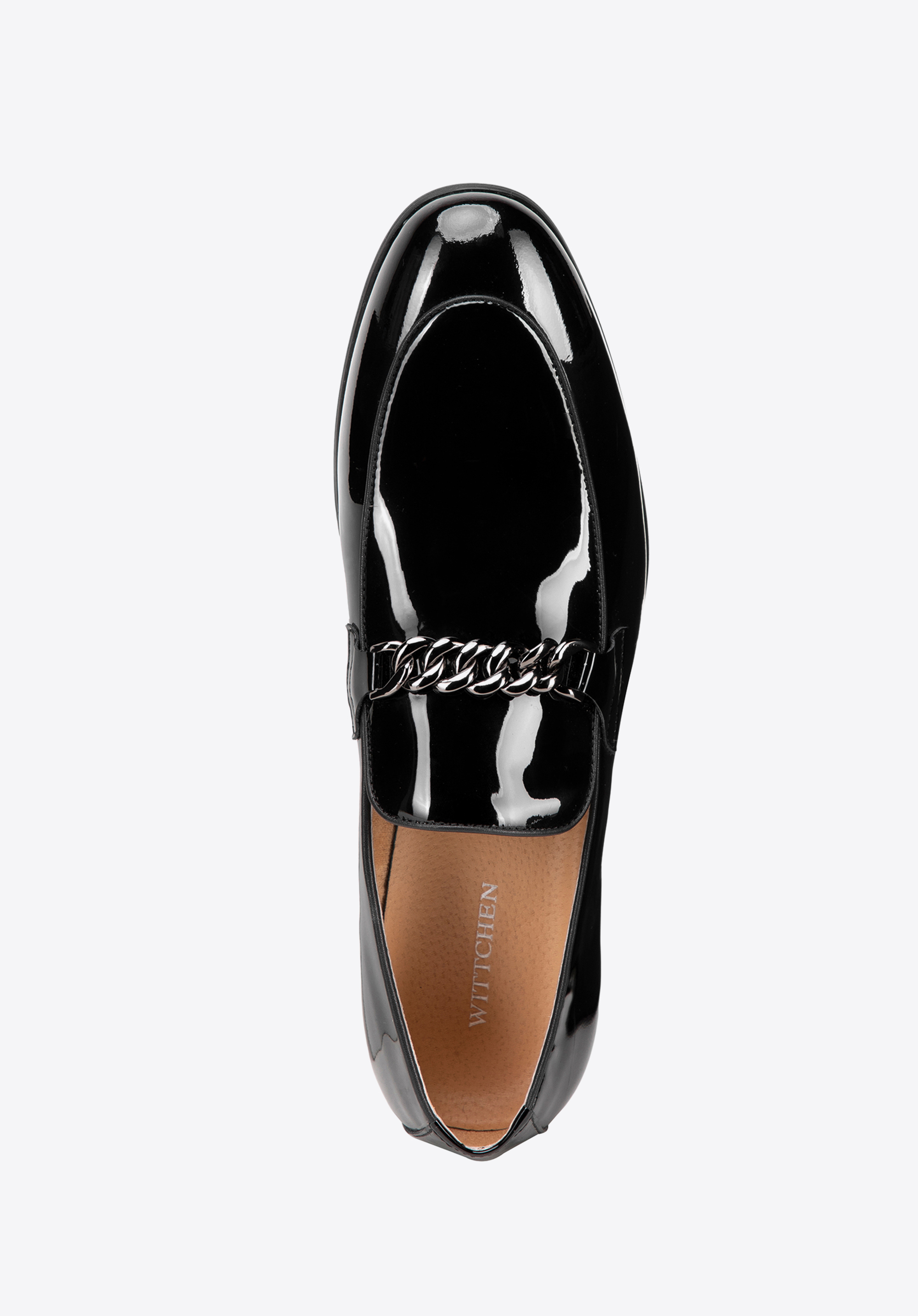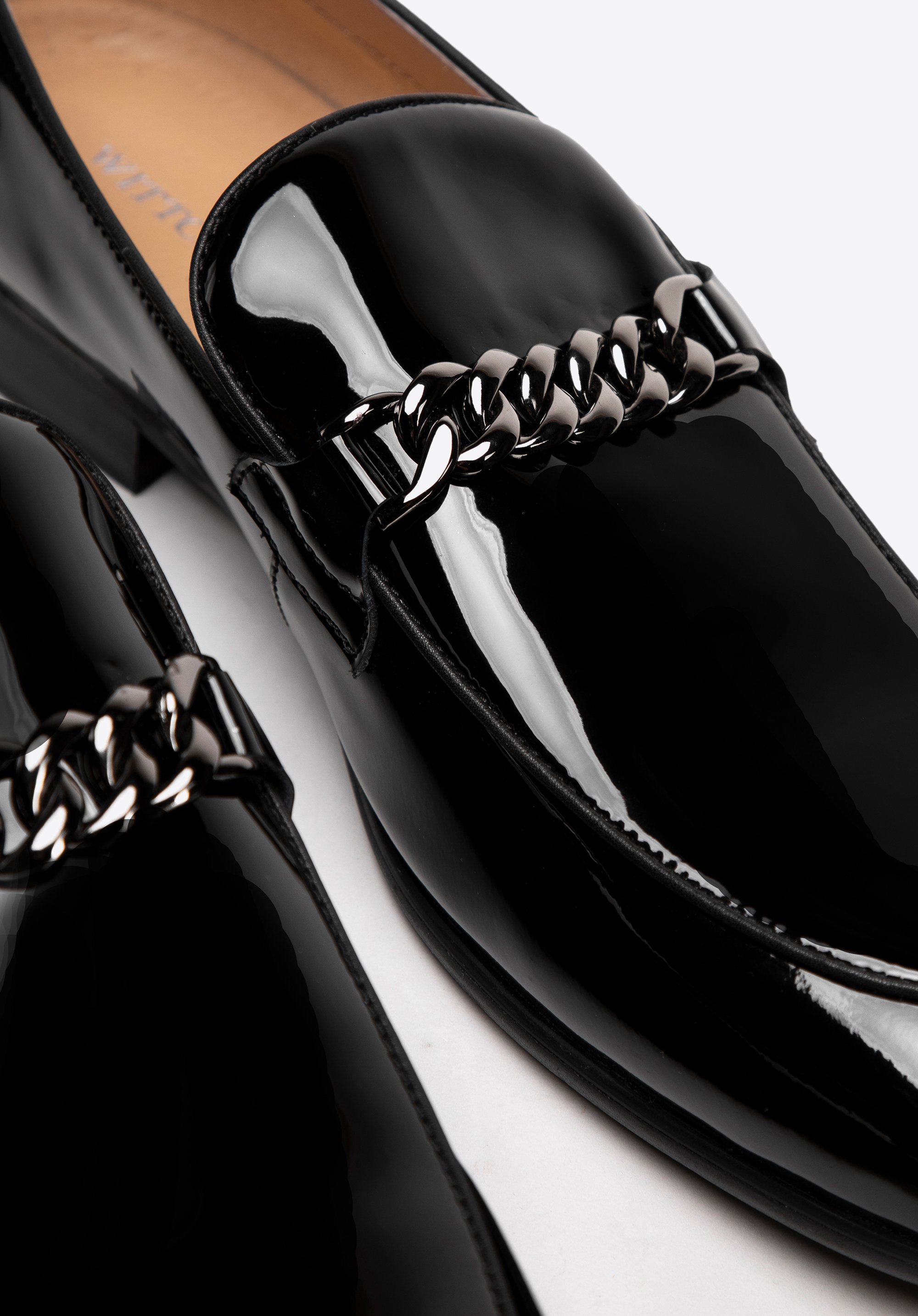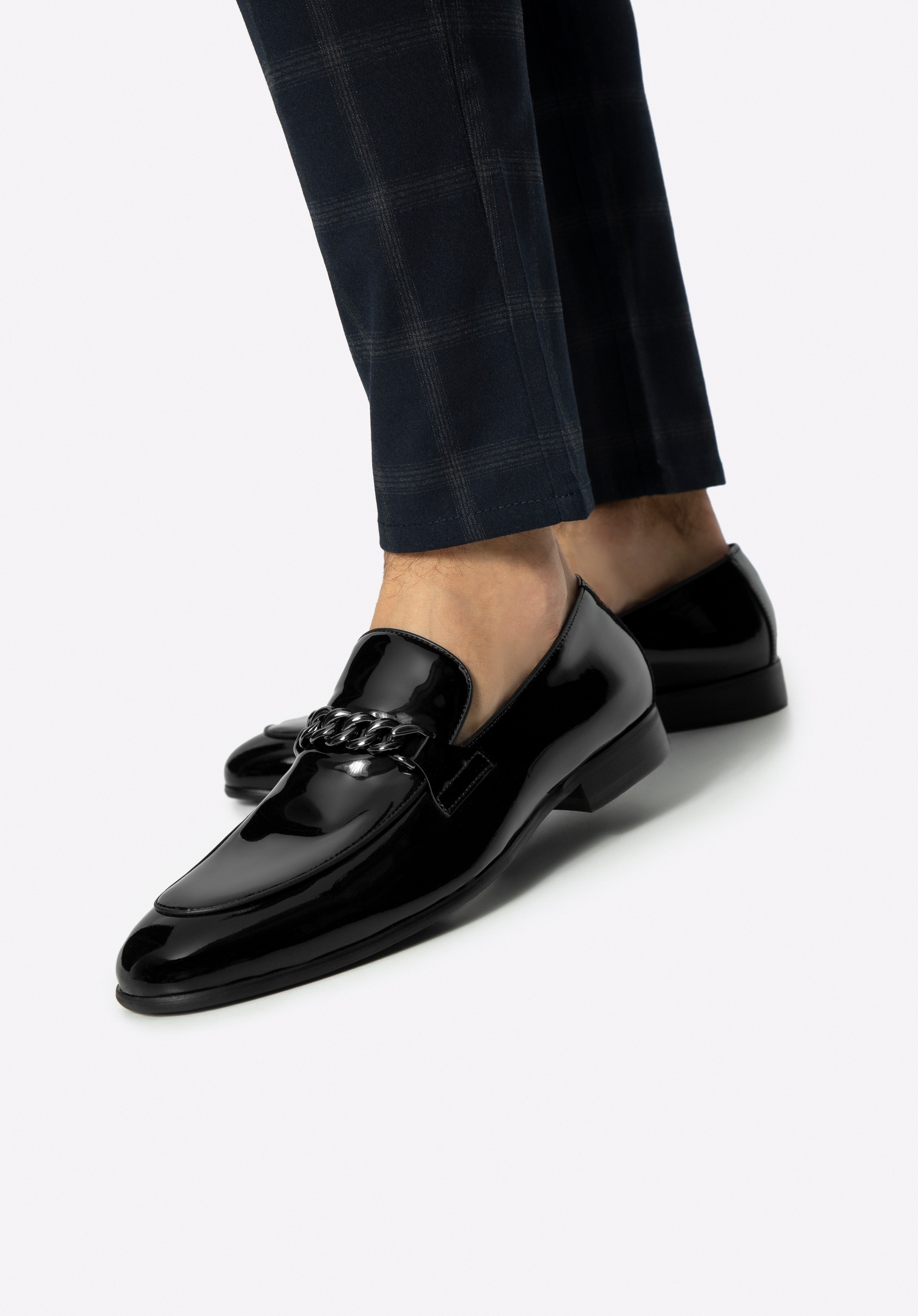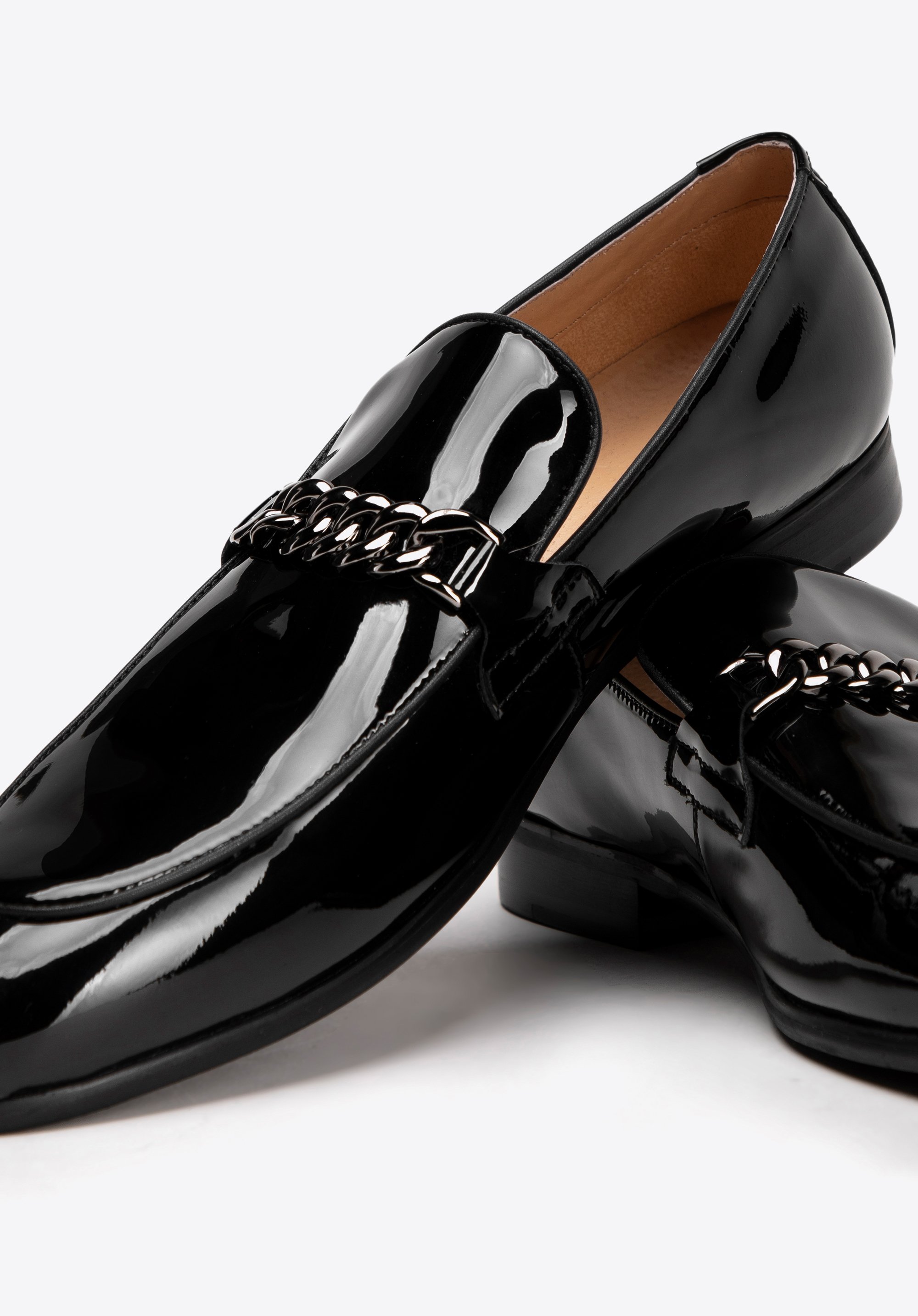 Zanurz się w świecie luksusu, dzięki kolekcji męskich skórzanych mokasynów. Te buty są nie tylko symbolem elegancji, ale także połączenie wysokiej jakości materiałów i perfekcyjnego wykończenia. Wykonane z naturalnej skóry lakierowanej prezentują się niezwykle ekskluzywnie, przyciągając wzrok swoim połyskiem. O maksymalny komfort i idealne dopasowanie do stopy dba skórzana wyściółka, a solidna podeszwa butów zapewnia stabilność i pewność każdego kroku, niezależnie od nawierzchni. Klasyczny model, z eleganckim noskiem o migdałowym kształcie i praktycznym wsuwanym fasonie, umożliwia łatwe zakładanie i zdejmowanie butów. Dodatkowym elementem, podkreślającym wyjątkowy styl tych butów, jest dekoracyjny łańcuch na przodzie.