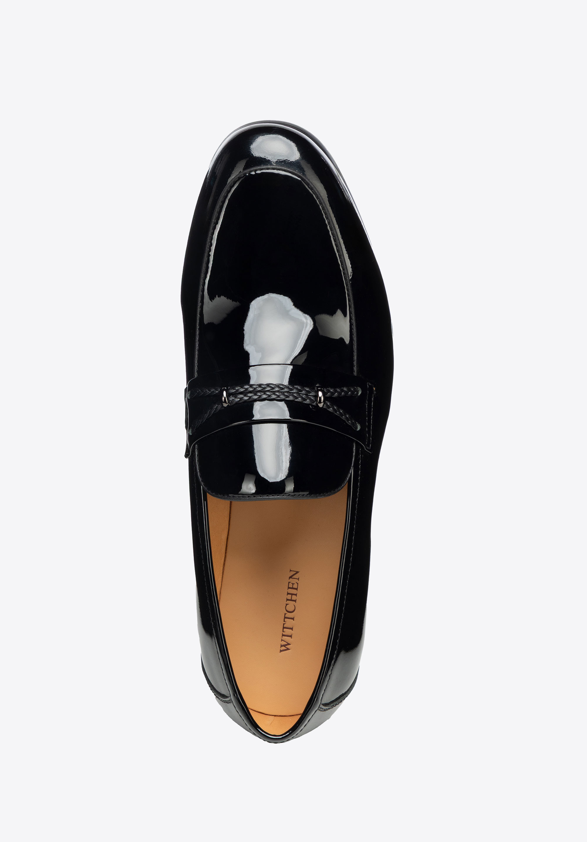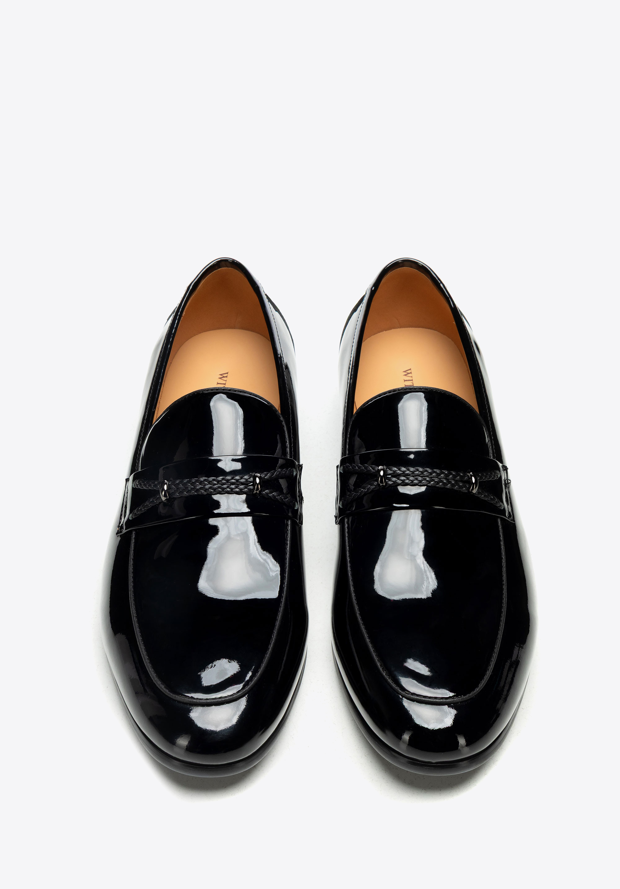 Odkryj połączenie ponadczasowej elegancji i wyjątkowego komfortu w męskich mokasynach ze skóry naturalnej lakierowanej. Migdałowy nosek subtelnie wysmukla stopę, nadając butom stylowy, harmonijny kształt, a płaski obcas i gumowa podeszwa zapewniają stabilność oraz wygodę przy każdym kroku. Wsuwana konstrukcja sprawia, że zakładanie butów jest szybkie i wygodne, a subtelny dekoracyjny pasek z plecionki z metalowymi elementami w kolorze grafitowym dodaje im nowoczesnego, eleganckiego charakteru.