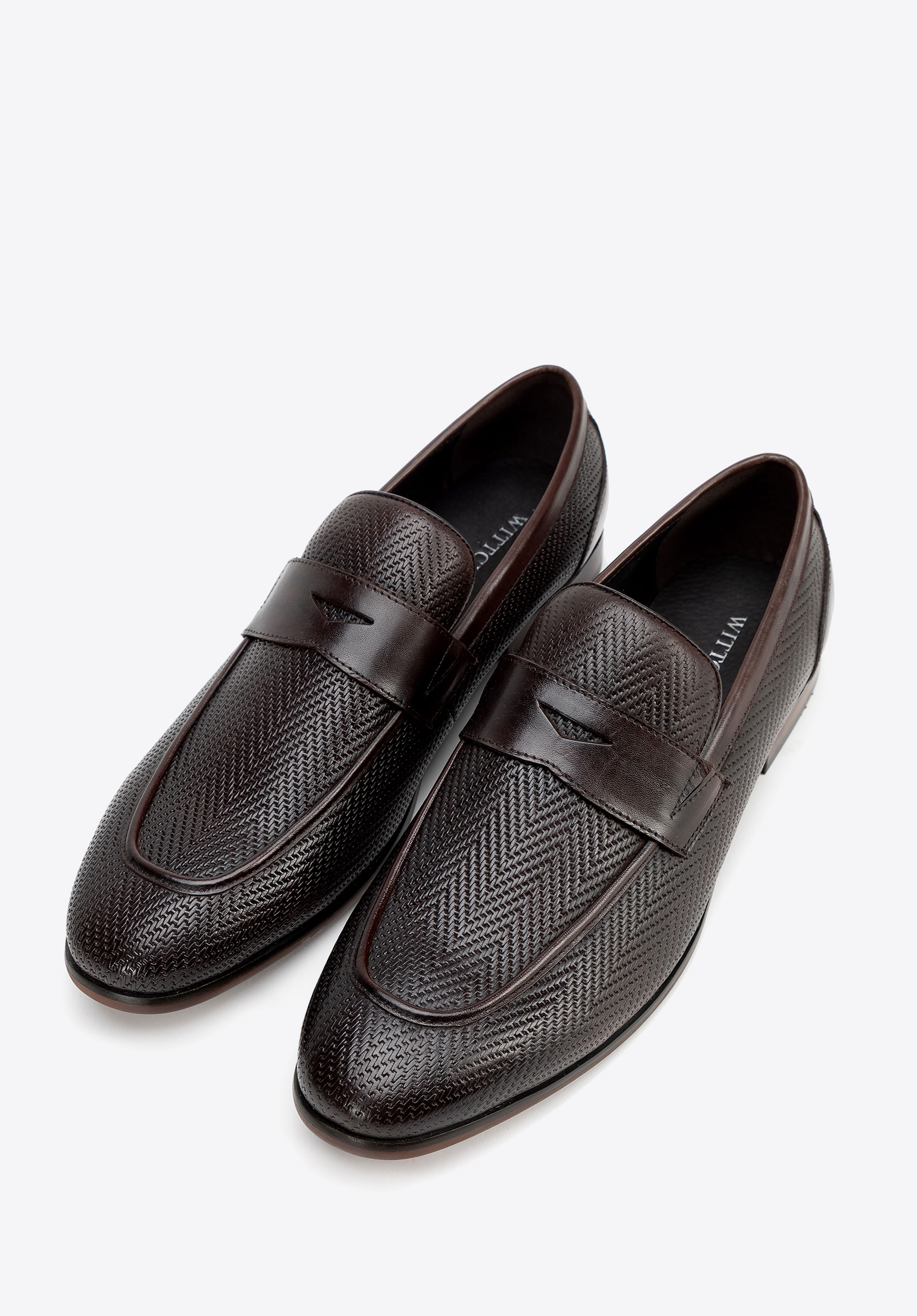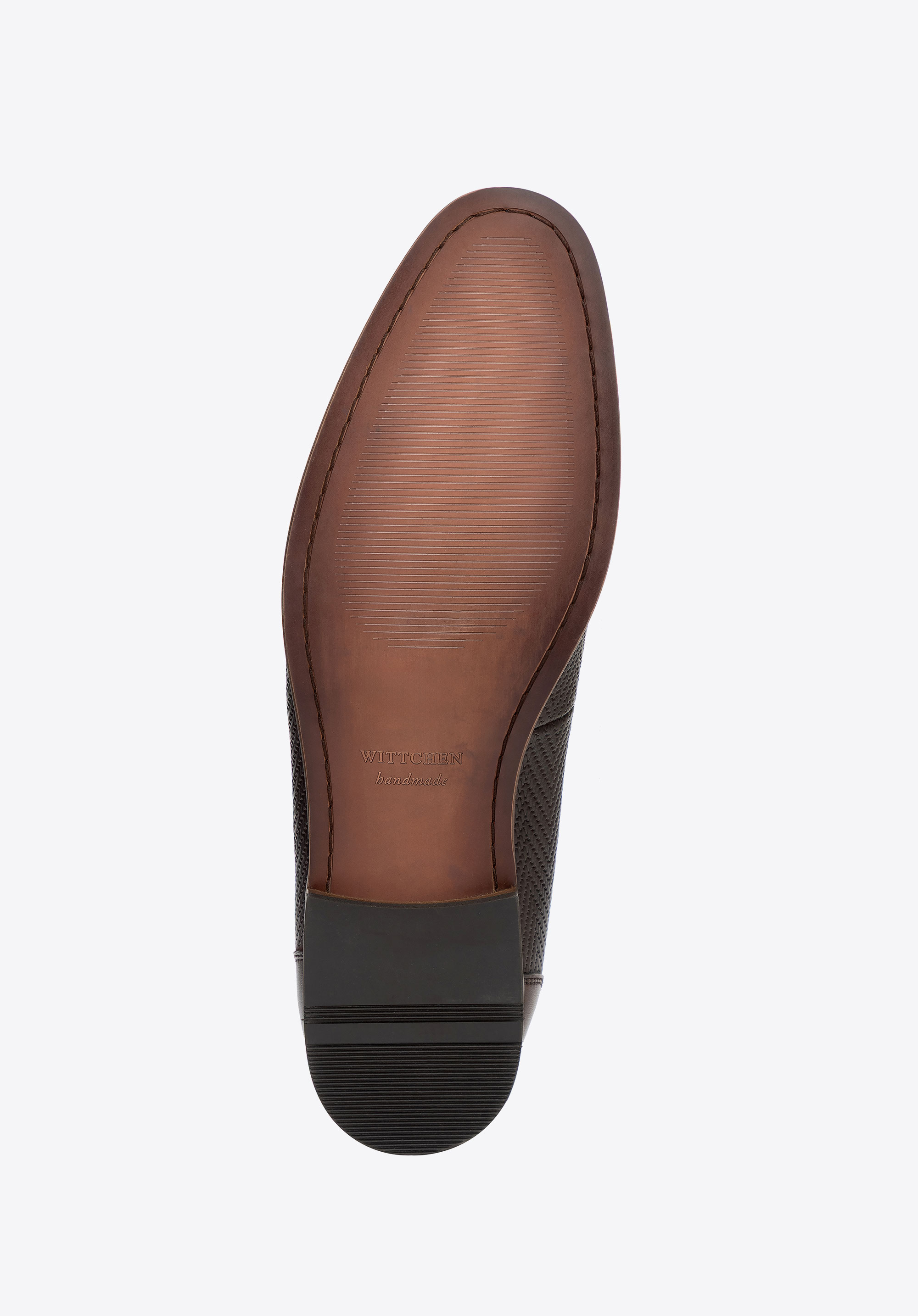 Nasze męskie mokasyny łączą w sobie klasykę i nowoczesność, tworząc idealną propozycję dla mężczyzn, którzy cenią elegancję i komfort. Wykonane ze skóry bydlęcej, te buty wyróżniają się migdałowym noskiem oraz dekoracyjnym paskiem z wycięciem, które nadają im subtelnego charakteru. Płaski obcas i gumowa podeszwa zapewniają wygodę przez cały dzień, a ponadczasowy design sprawia, że pasują do wielu stylizacji.