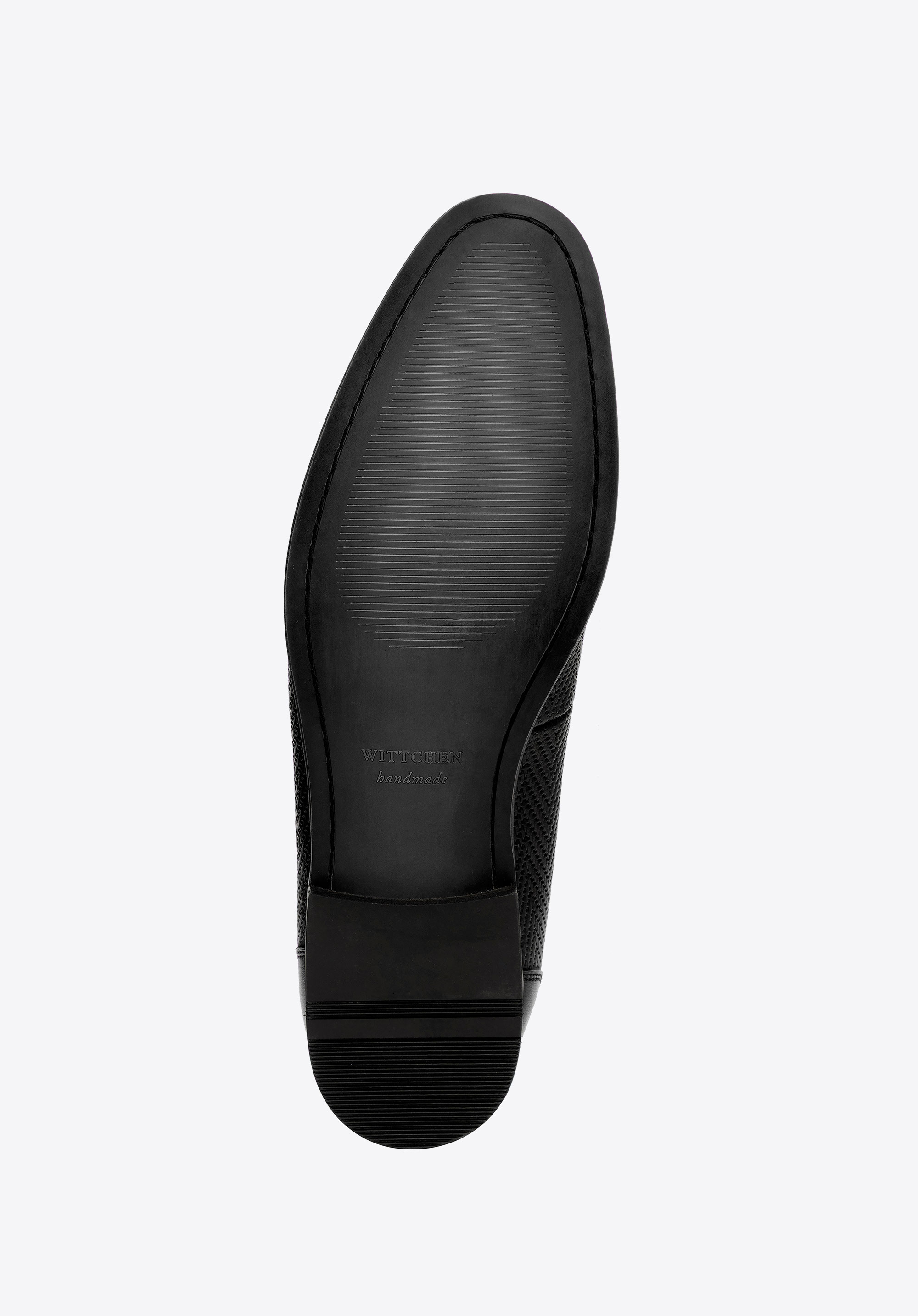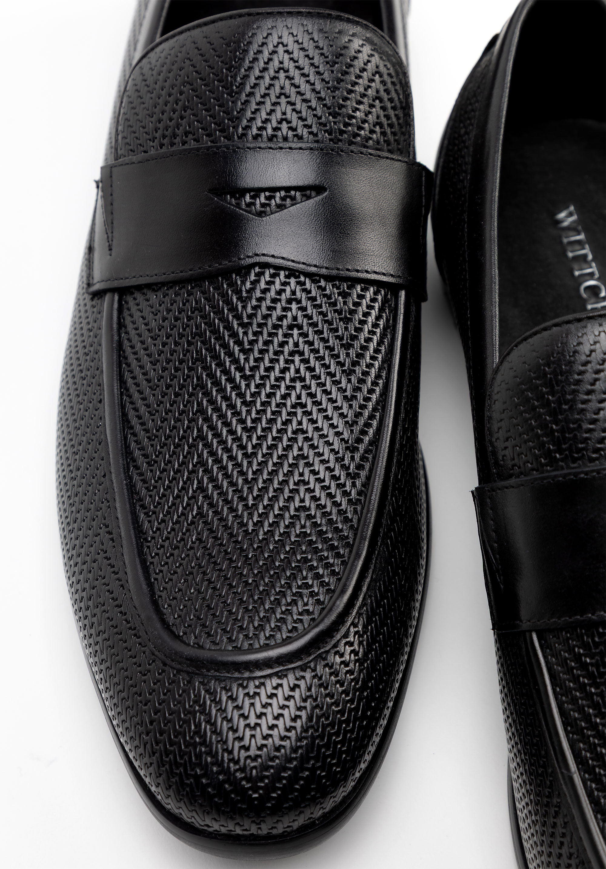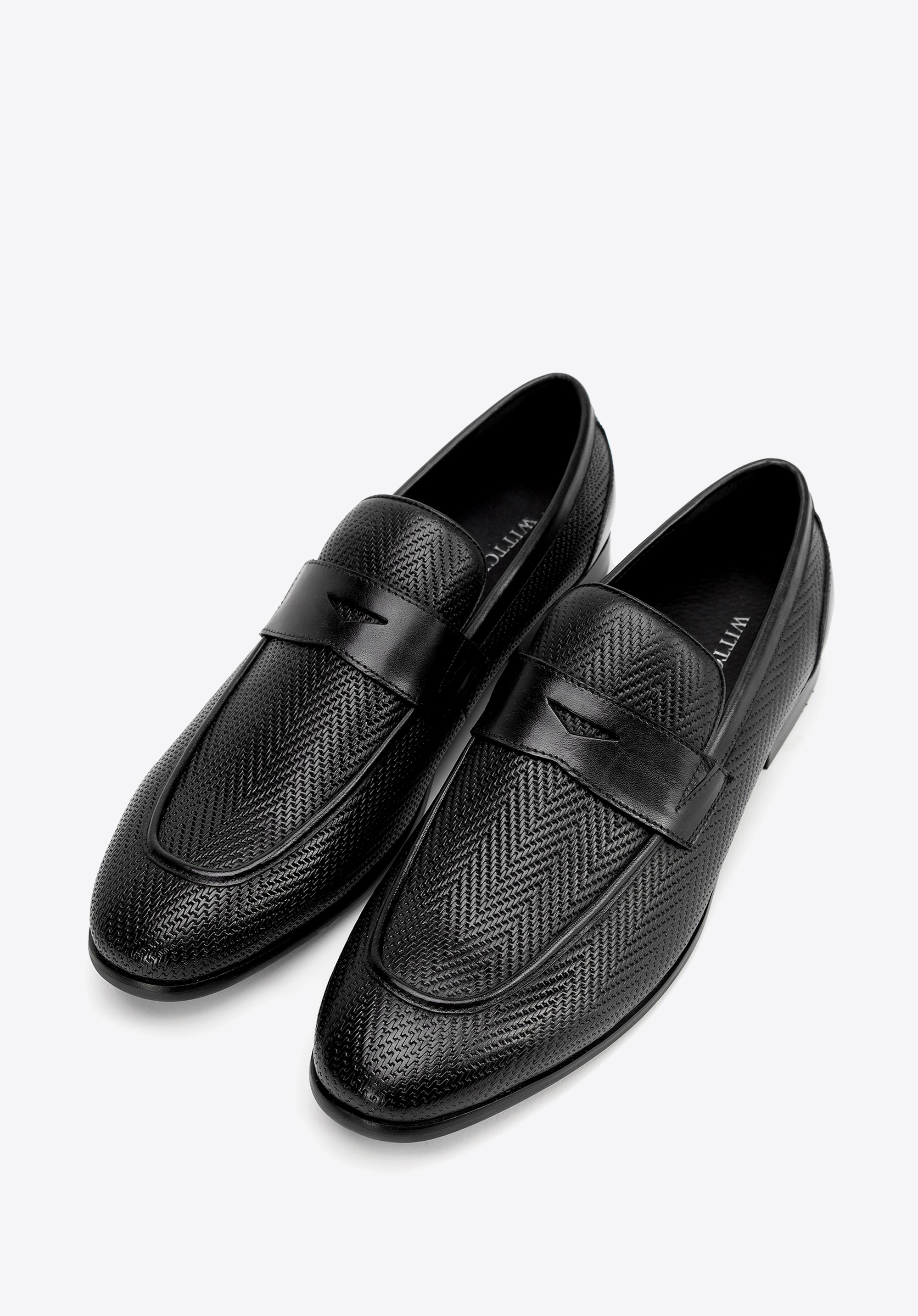 Nasze męskie mokasyny łączą w sobie klasykę i nowoczesność, tworząc idealną propozycję dla mężczyzn, którzy cenią elegancję i komfort. Wykonane ze skóry bydlęcej, te buty wyróżniają się migdałowym noskiem oraz dekoracyjnym paskiem z wycięciem, które nadają im subtelnego charakteru. Płaski obcas i gumowa podeszwa zapewniają wygodę przez cały dzień, a ponadczasowy design sprawia, że pasują do wielu stylizacji.