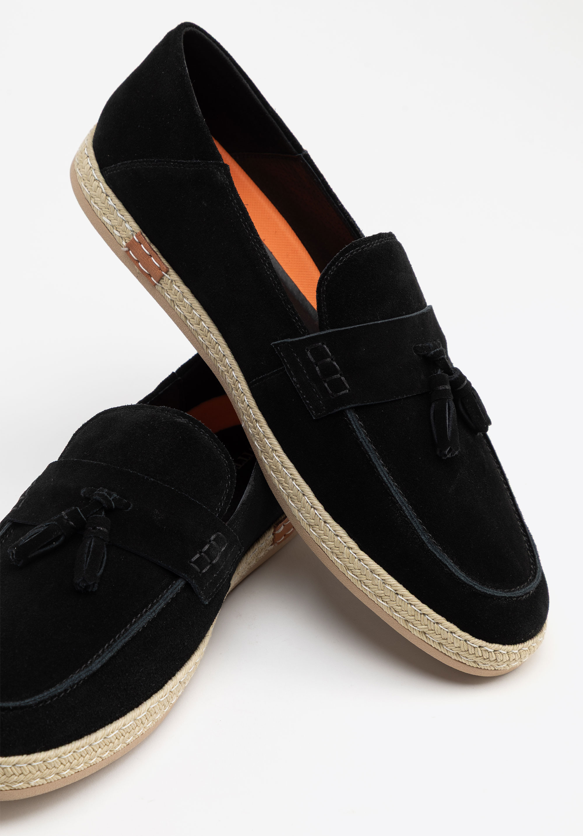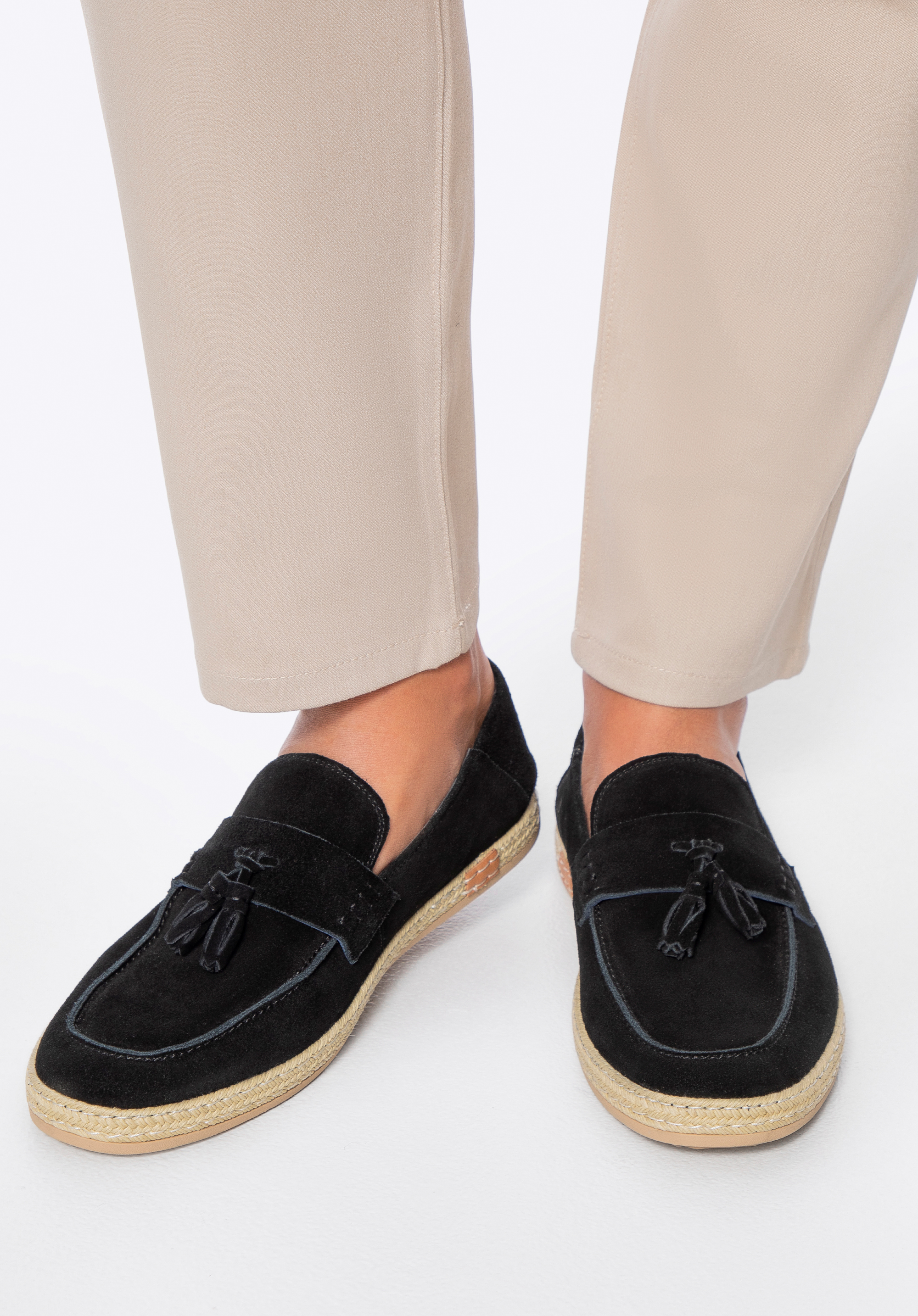 Miękka skóra bydlęca o zamszowej fakturze otula stopę, zapewniając naturalną elastyczność i stylową elegancję. Klasyczny, zaokrąglony nosek nadaje mokasynom ponadczasowy wygląd, a skórzana wkładka dba o komfort na każdym kroku. Elastyczna gumowa podeszwa gwarantuje wygodę, a chwost na pasku i plecionka wokół podeszwy nadają lekkości i wakacyjnego, nonszalanckiego charakteru.