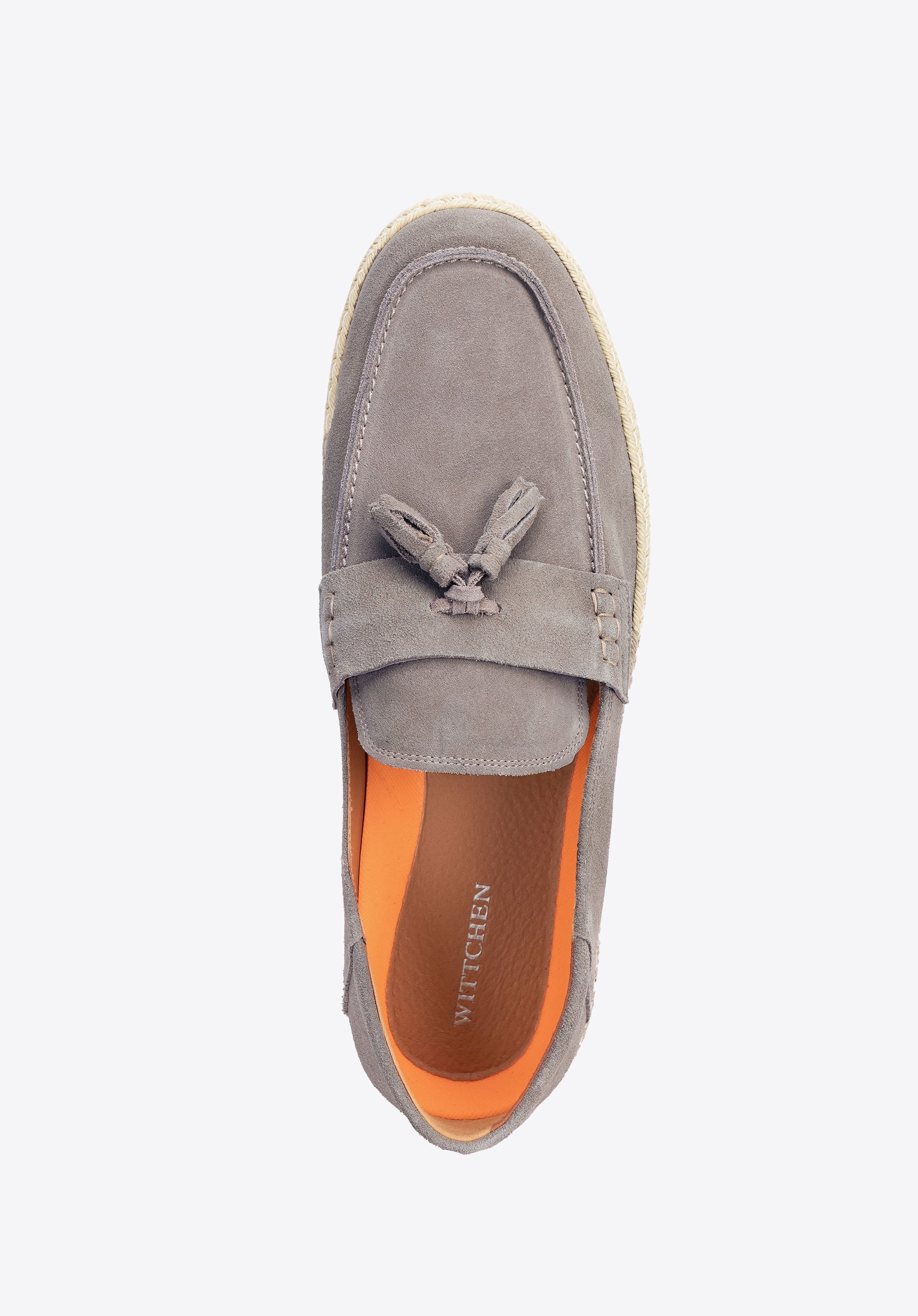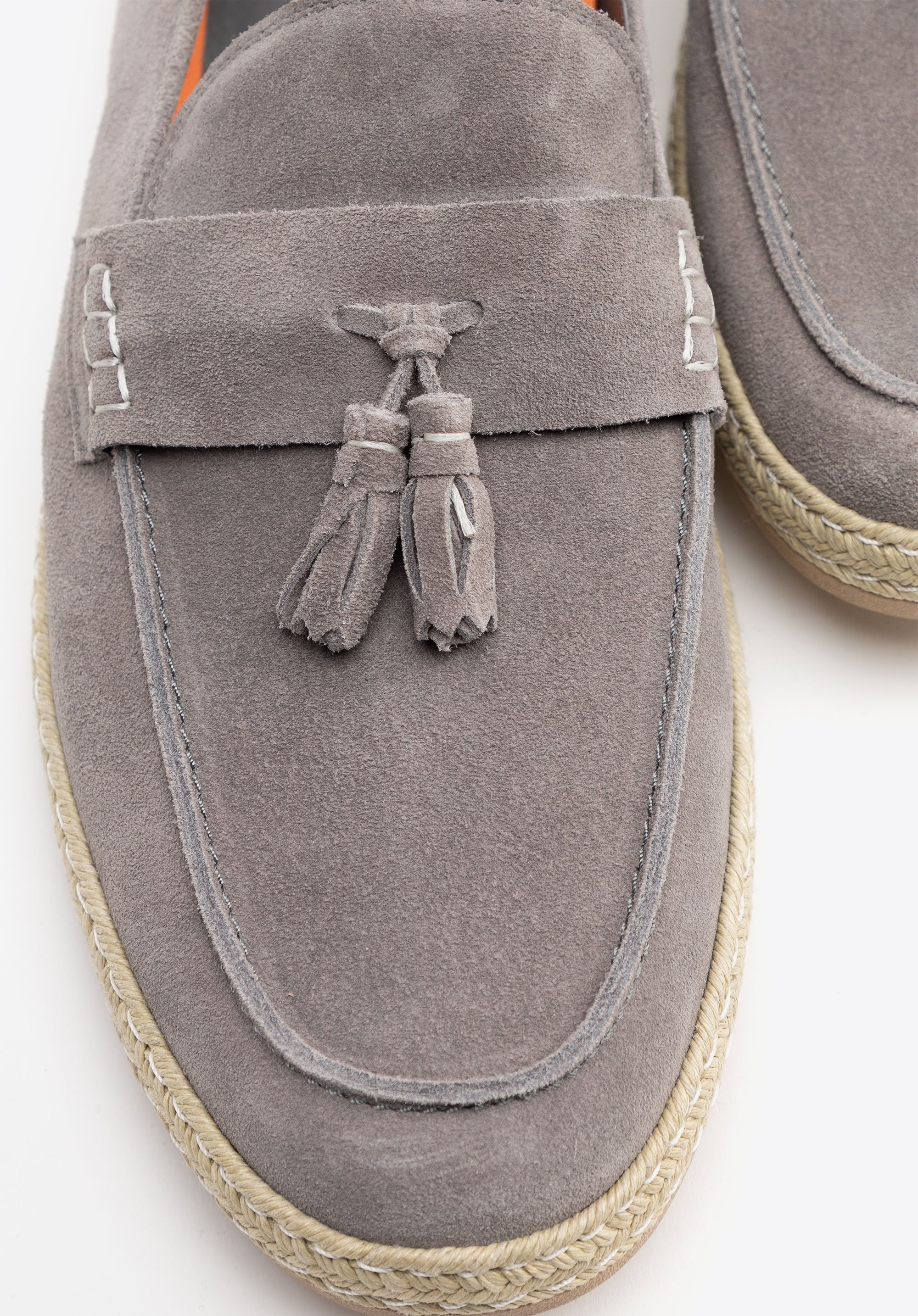 Miękka skóra bydlęca o zamszowej fakturze otula stopę, zapewniając naturalną elastyczność i stylową elegancję. Klasyczny, zaokrąglony nosek nadaje mokasynom ponadczasowy wygląd, a skórzana wkładka dba o komfort na każdym kroku. Elastyczna gumowa podeszwa gwarantuje wygodę, a chwost na pasku i plecionka wokół podeszwy nadają lekkości i wakacyjnego, nonszalanckiego charakteru.