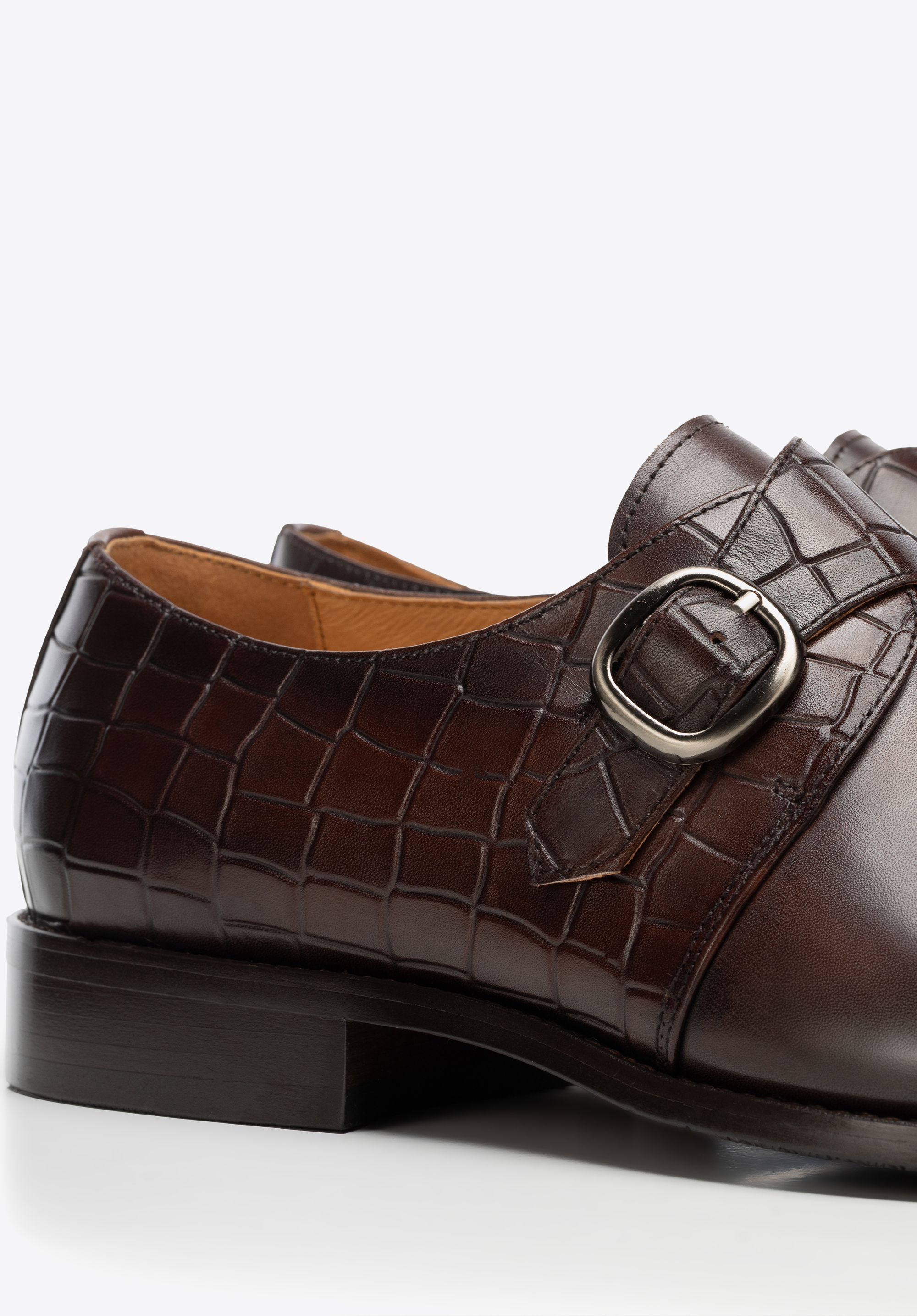 Odkryj połączenie klasyki i subtelnego luksusu w męskich półbutach typu monk. Wykonane z naturalnej skóry licowej o dwóch fakturach – gładkiej i croco – zachwycają stylem, trwałością i dopracowanymi detalami. Migdałowy nosek nadaje butom smukły, elegancki kształt, a pojedyncze zapięcie na klamrę dodaje im charakteru, podkreślając nowoczesny, minimalistyczny design. Płaski obcas oraz gumowa podeszwa zapewniają komfort i stabilność w każdych warunkach.