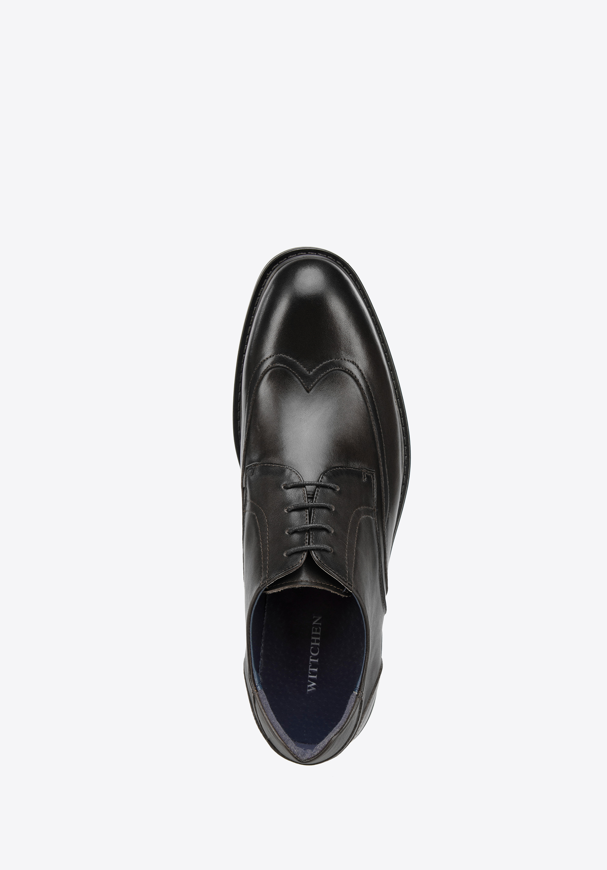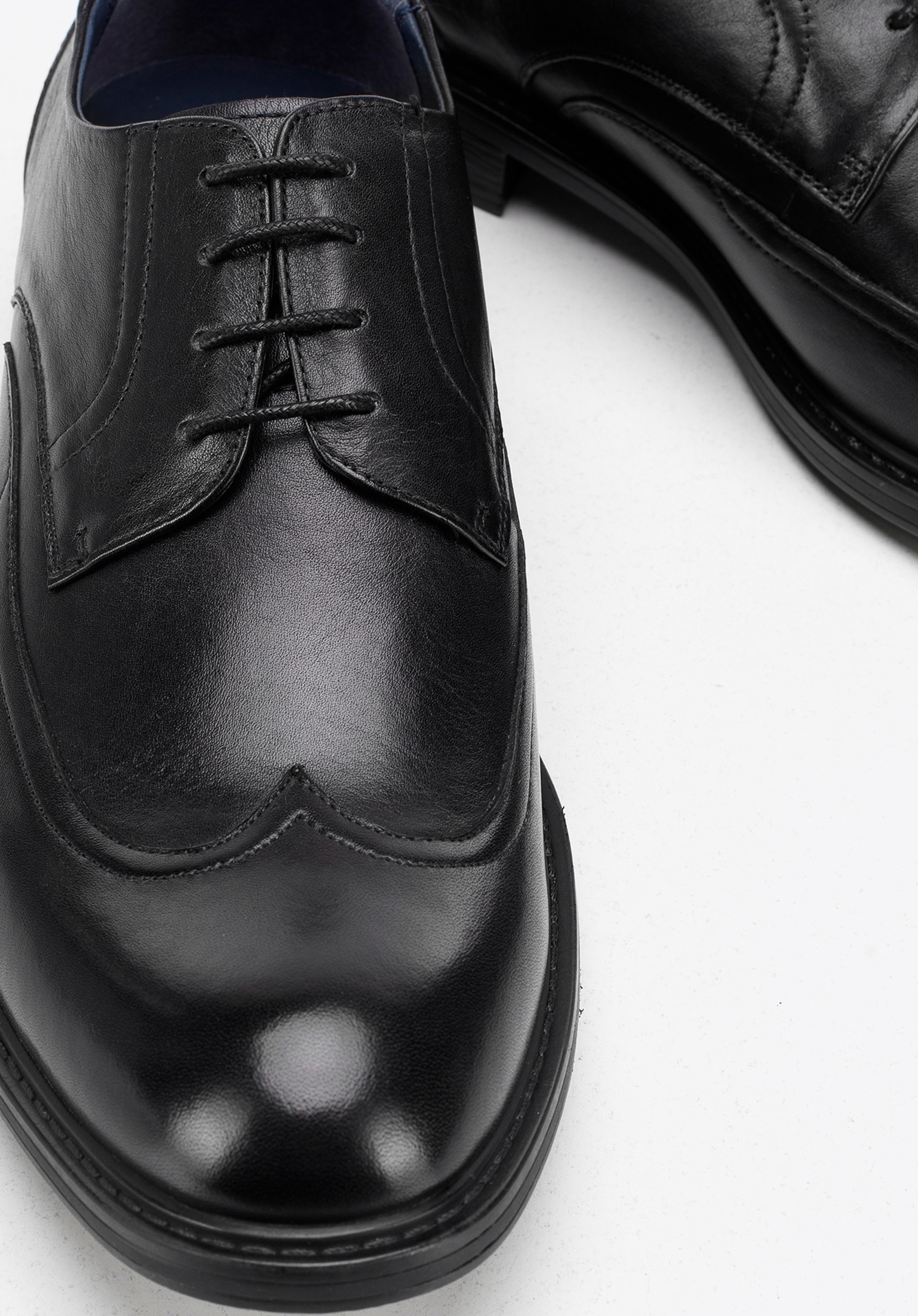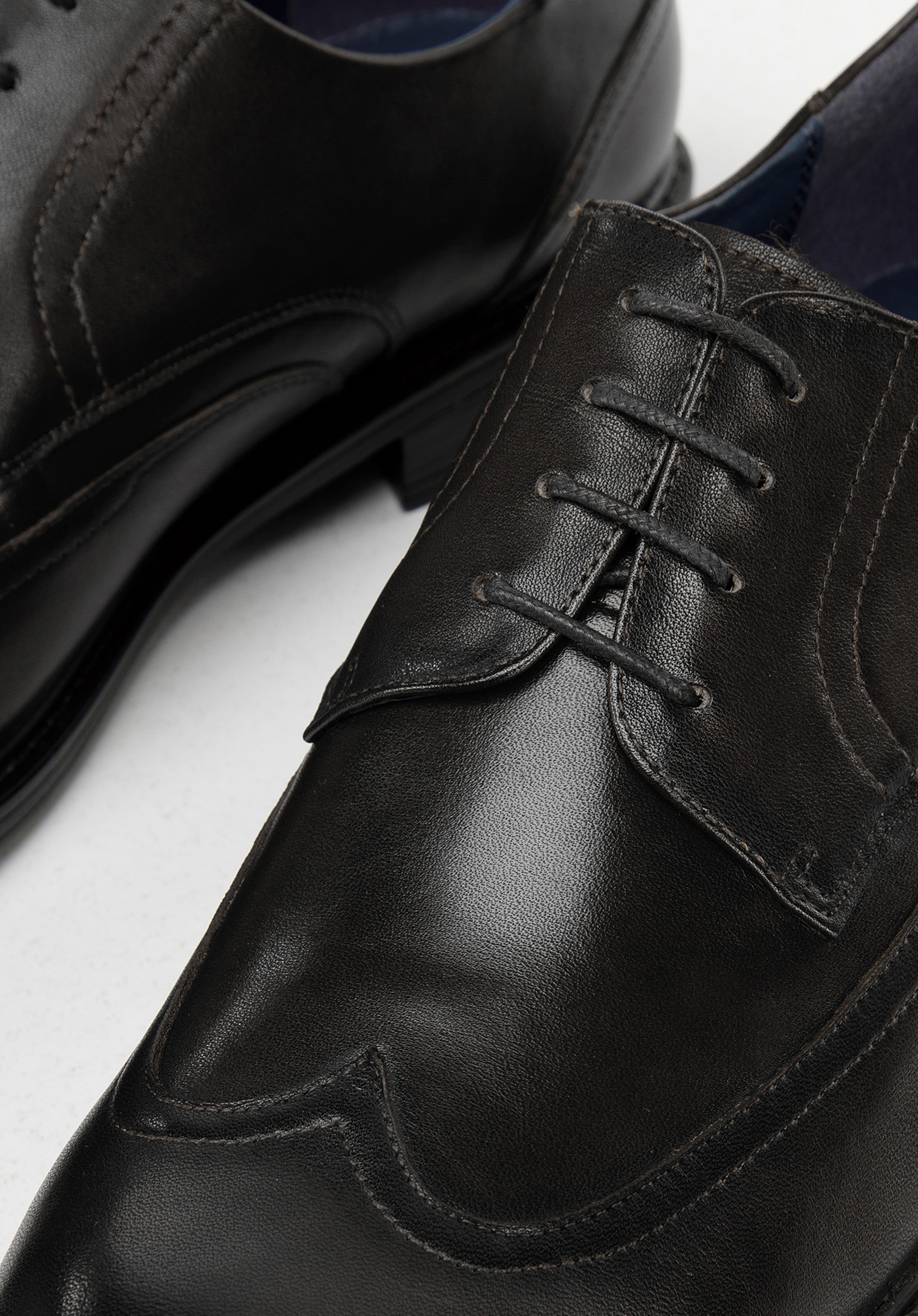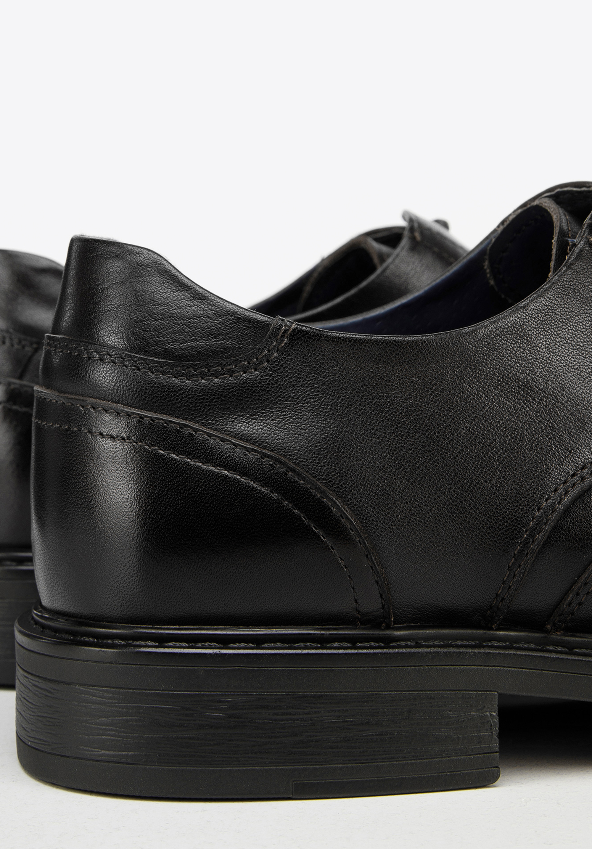 Eleganckie skórzane derby uzupełnią Twój styl. Możesz nosić je na co dzień, do garnituru czy zestawu z marynarką, ale także na ważne okazje – świetnie sprawdzą się jako buty na wesele. Niezależnie od sytuacji, nawet noszone kilka, kilkanaście godzin nie będą uwierać, bo zostały wykonane z dopasowującej się do stopy skóry naturalnej; w środku znajdziesz miękką wkładkę i wyściółkę. Mają klasyczny fason derby z przeszyciami, które z przodu nadają im wygląd brogsów. Średni obcas i elastyczna gumowa podeszwa sprawdzą się nawet podczas długich spacerów czy tańca. Męskie skórzane półbuty z przeszyciami to uniwersalne buty na wiele okazji i na wiele lat – możesz być pewien, że nie wyjdą z mody.