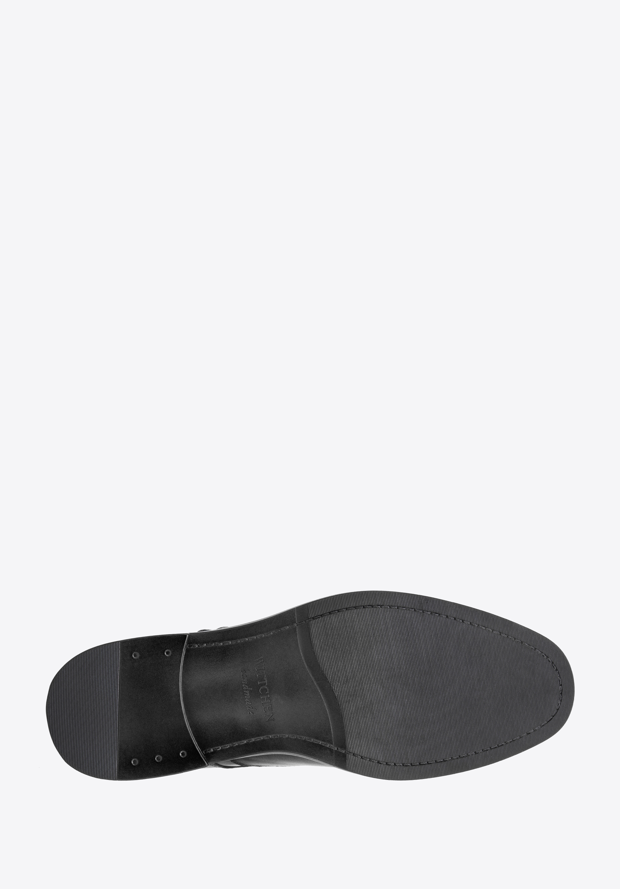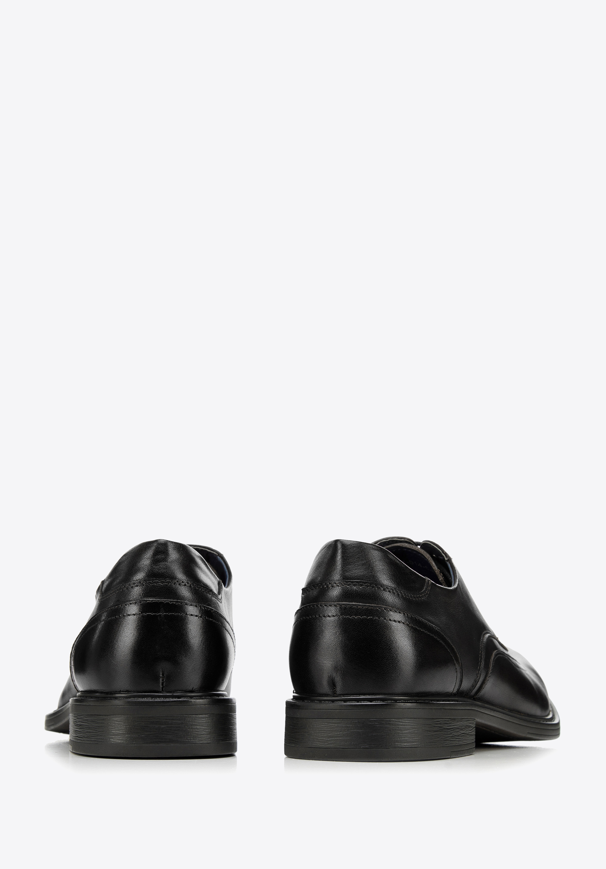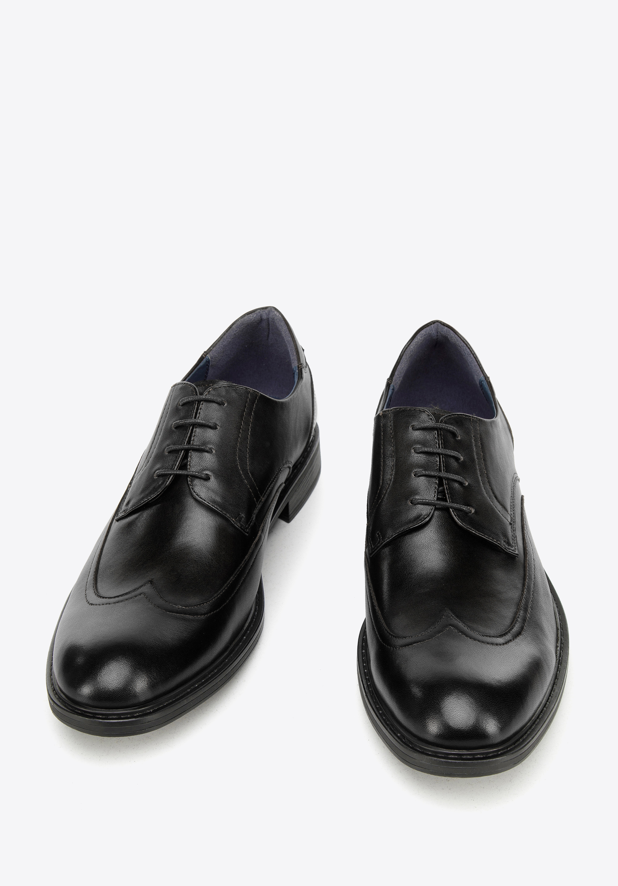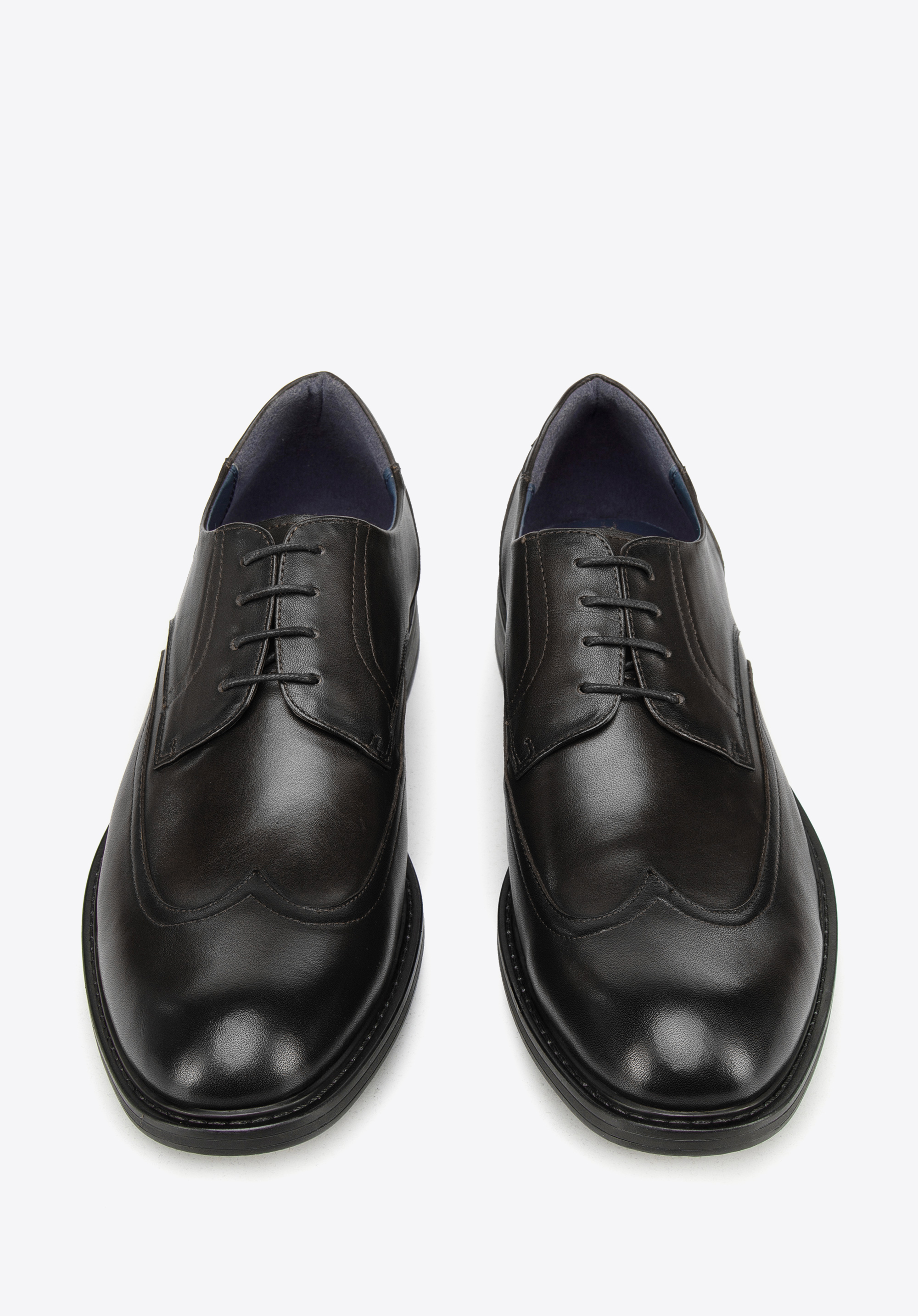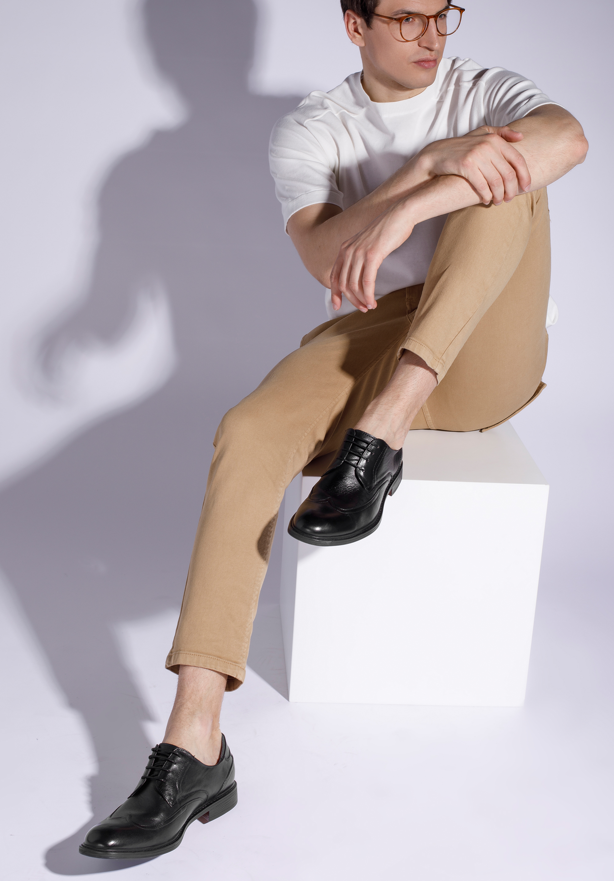 Eleganckie skórzane derby uzupełnią Twój styl. Możesz nosić je na co dzień, do garnituru czy zestawu z marynarką, ale także na ważne okazje – świetnie sprawdzą się jako buty na wesele. Niezależnie od sytuacji, nawet noszone kilka, kilkanaście godzin nie będą uwierać, bo zostały wykonane z dopasowującej się do stopy skóry naturalnej; w środku znajdziesz miękką wkładkę i wyściółkę. Mają klasyczny fason derby z przeszyciami, które z przodu nadają im wygląd brogsów. Średni obcas i elastyczna gumowa podeszwa sprawdzą się nawet podczas długich spacerów czy tańca. Męskie skórzane półbuty z przeszyciami to uniwersalne buty na wiele okazji i na wiele lat – możesz być pewien, że nie wyjdą z mody.