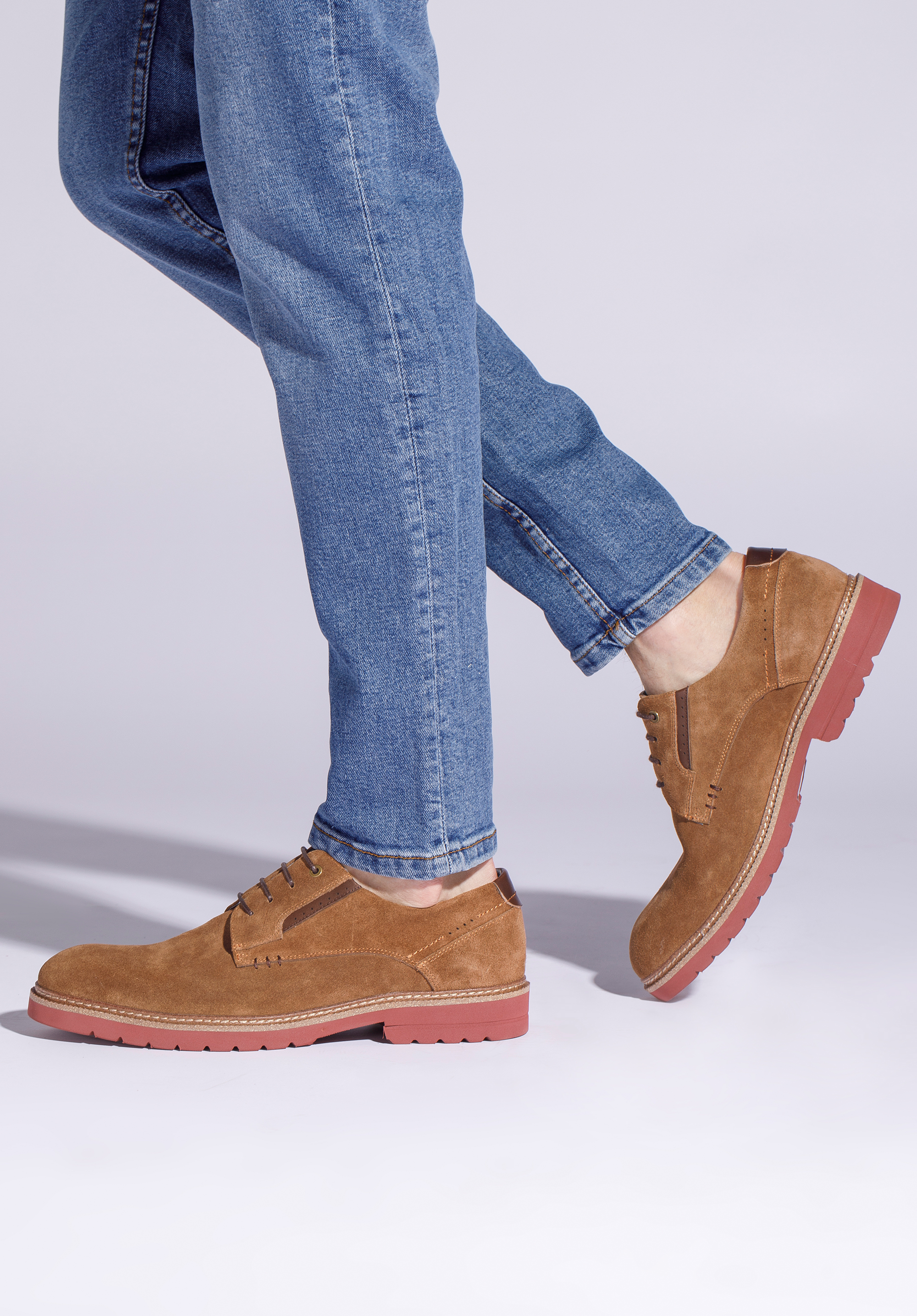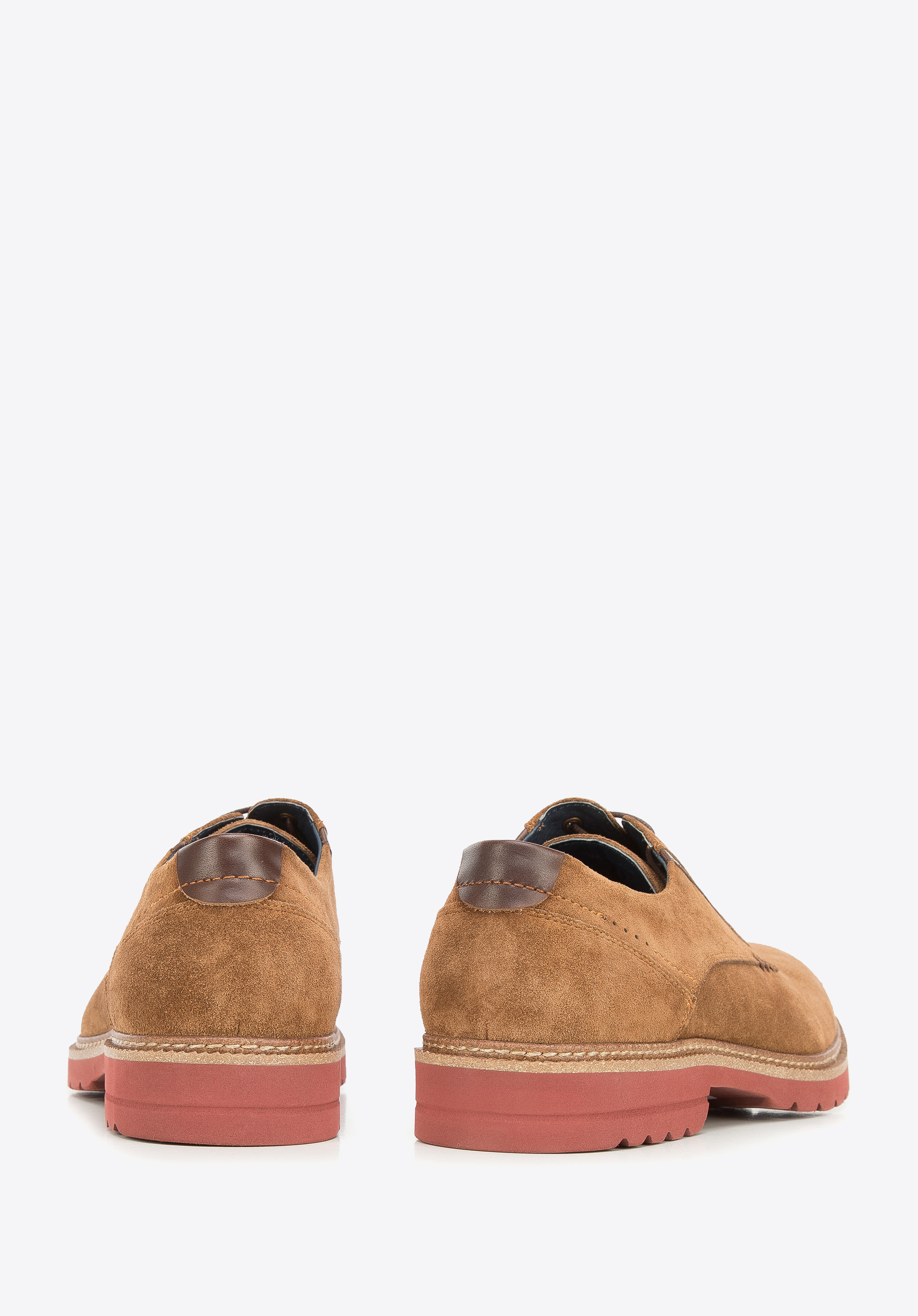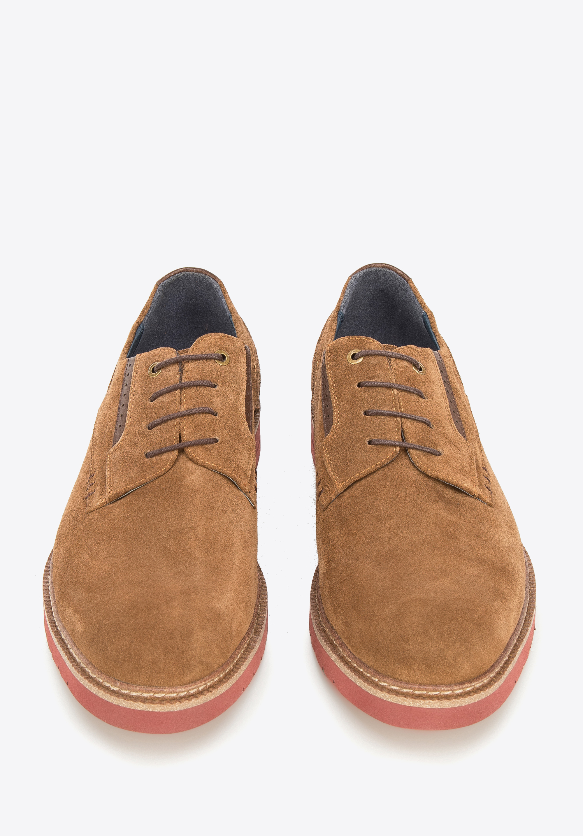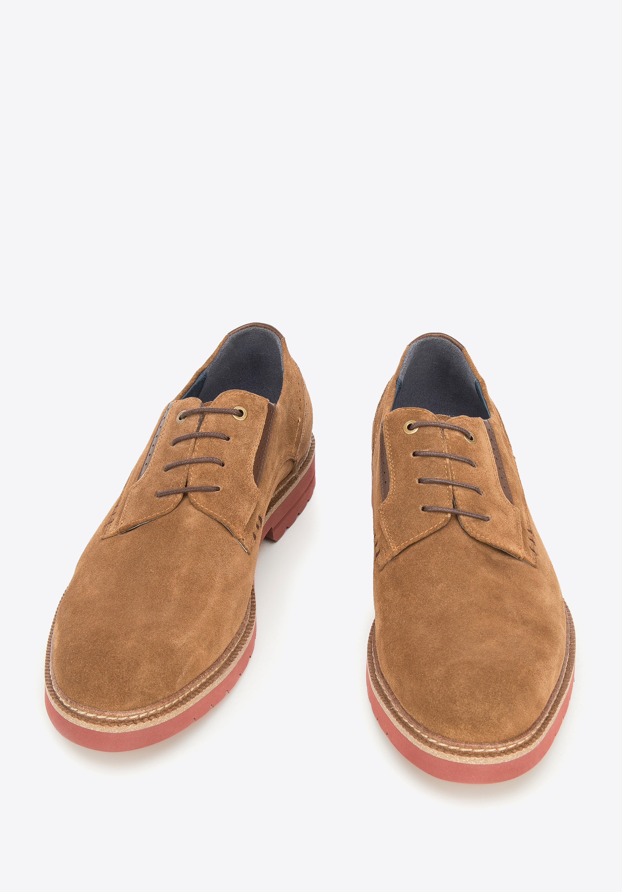 Męskie półbuty zamszowe z kolorową podeszwą pokazują, że codzienne buty mogą być interesujące.