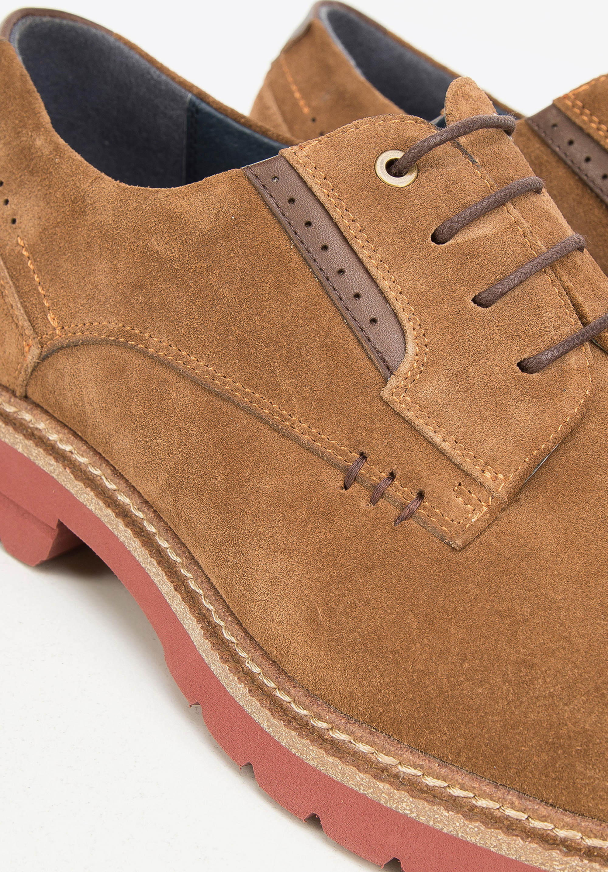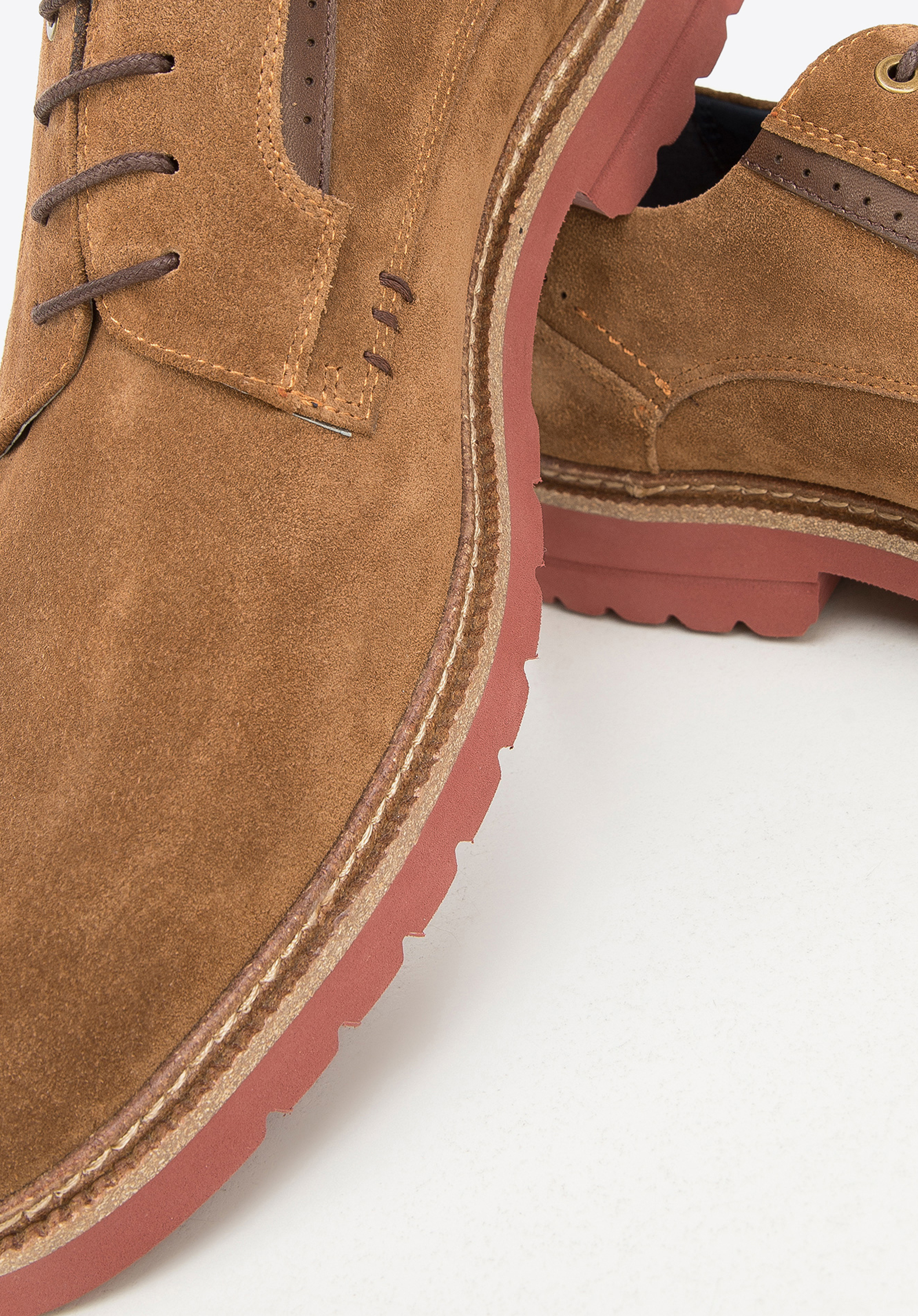 z wysokiej jakości zamszu uzupełnionego skórą licową przy sznurówkach i napiętku. Dzięki skórzanej wkładce, miękkiej wyściółce i lekkiej podeszwie komfortowo przechodzisz w nich wiele godzin. To proste, uniwersalne buty, które jednak przykuwają wzrok dzięki kolorom i ciekawym detalom. Będą świetnie wyglądały na przykład z dżinsami i t-shirtem, a także z lnianym garniturem.