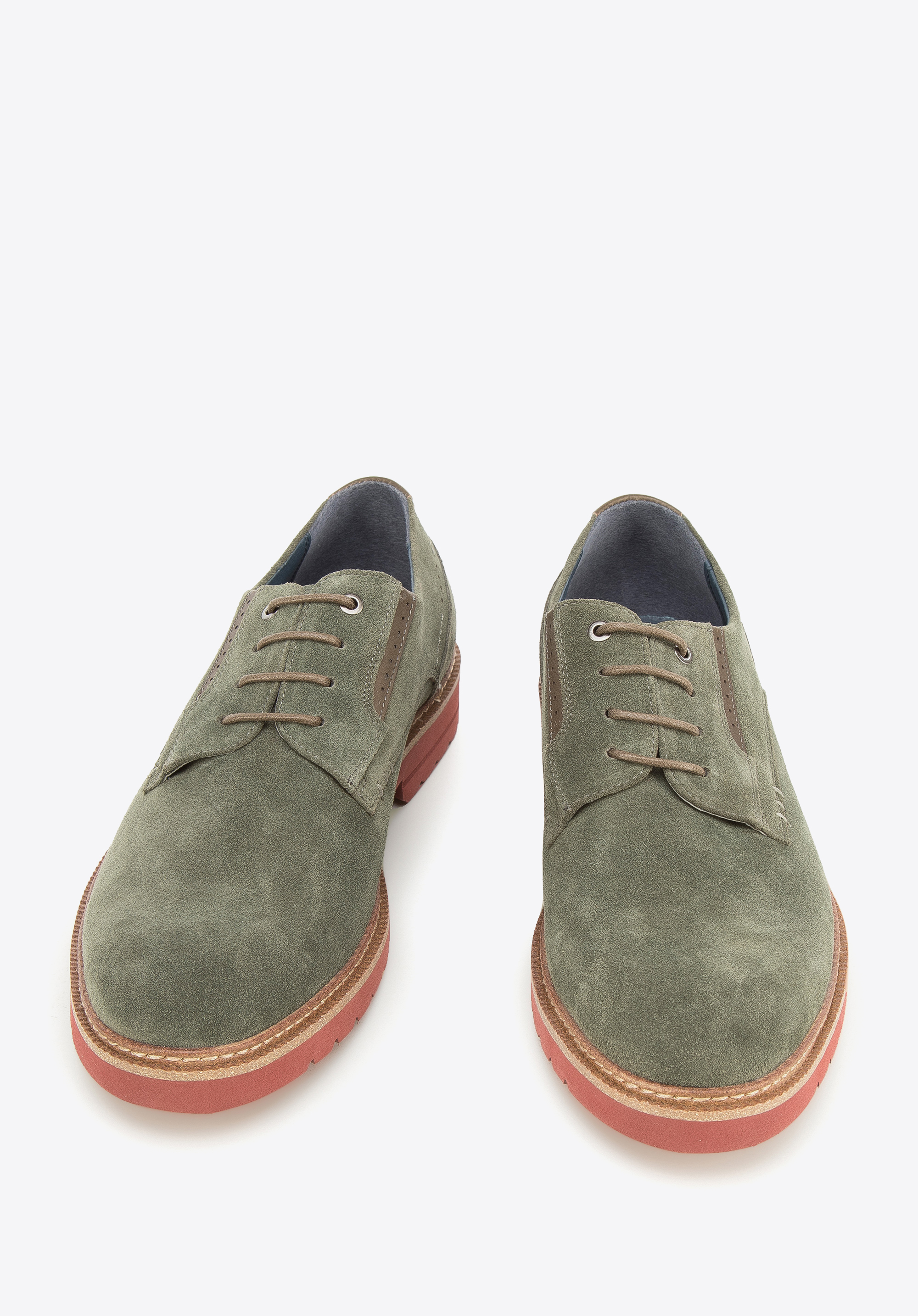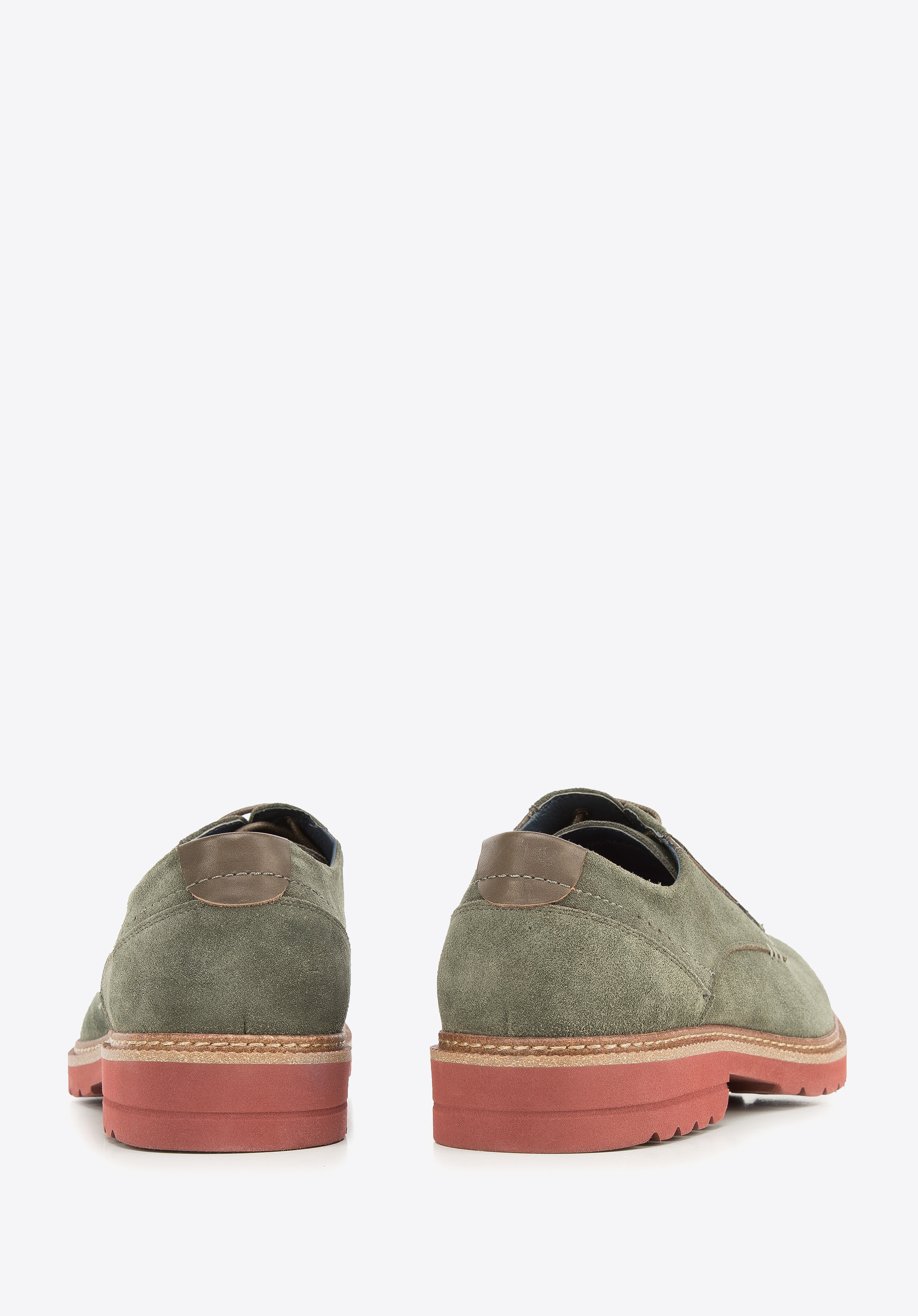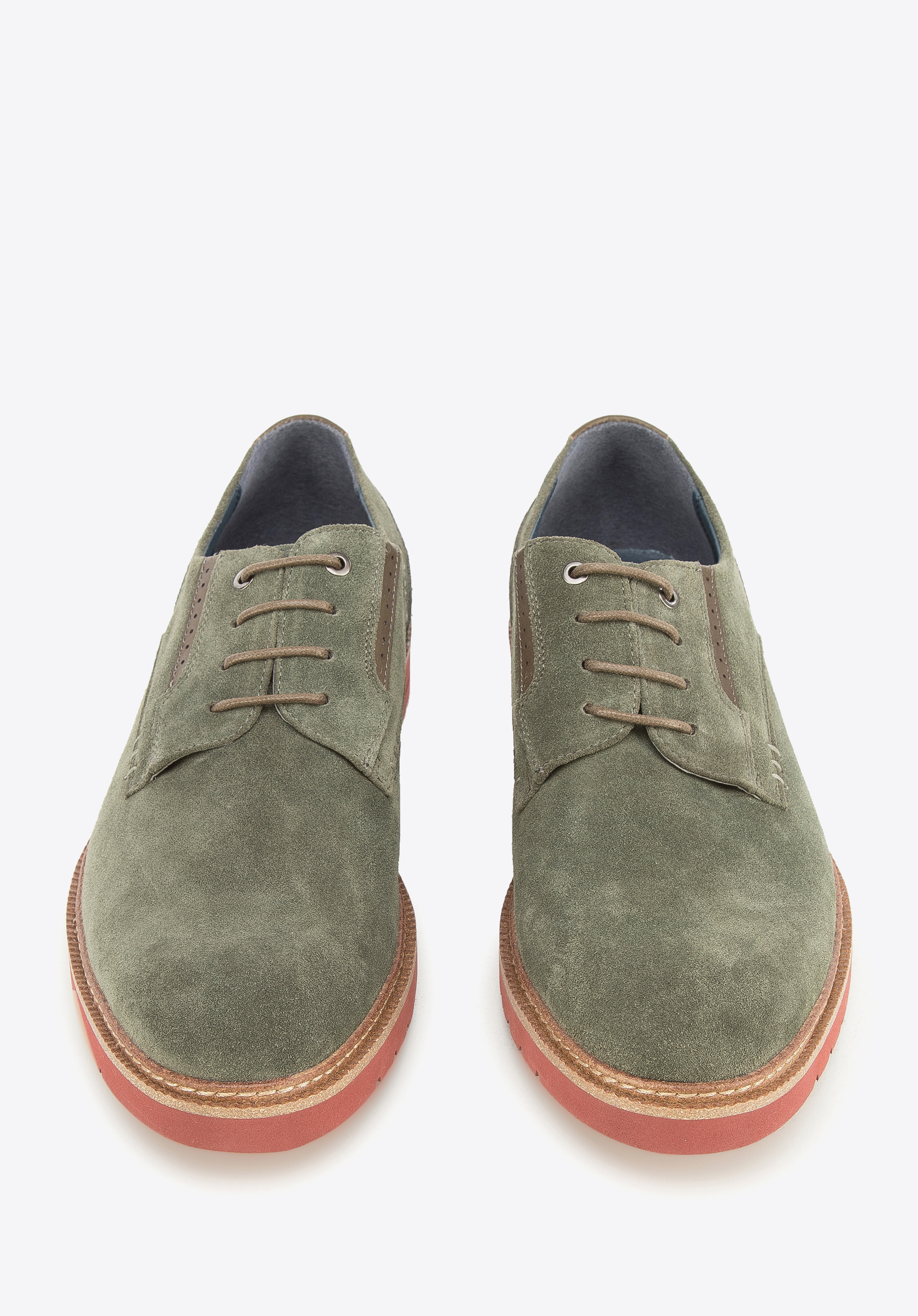 Męskie półbuty zamszowe z kolorową podeszwą pokazują, że codzienne buty mogą być interesujące.