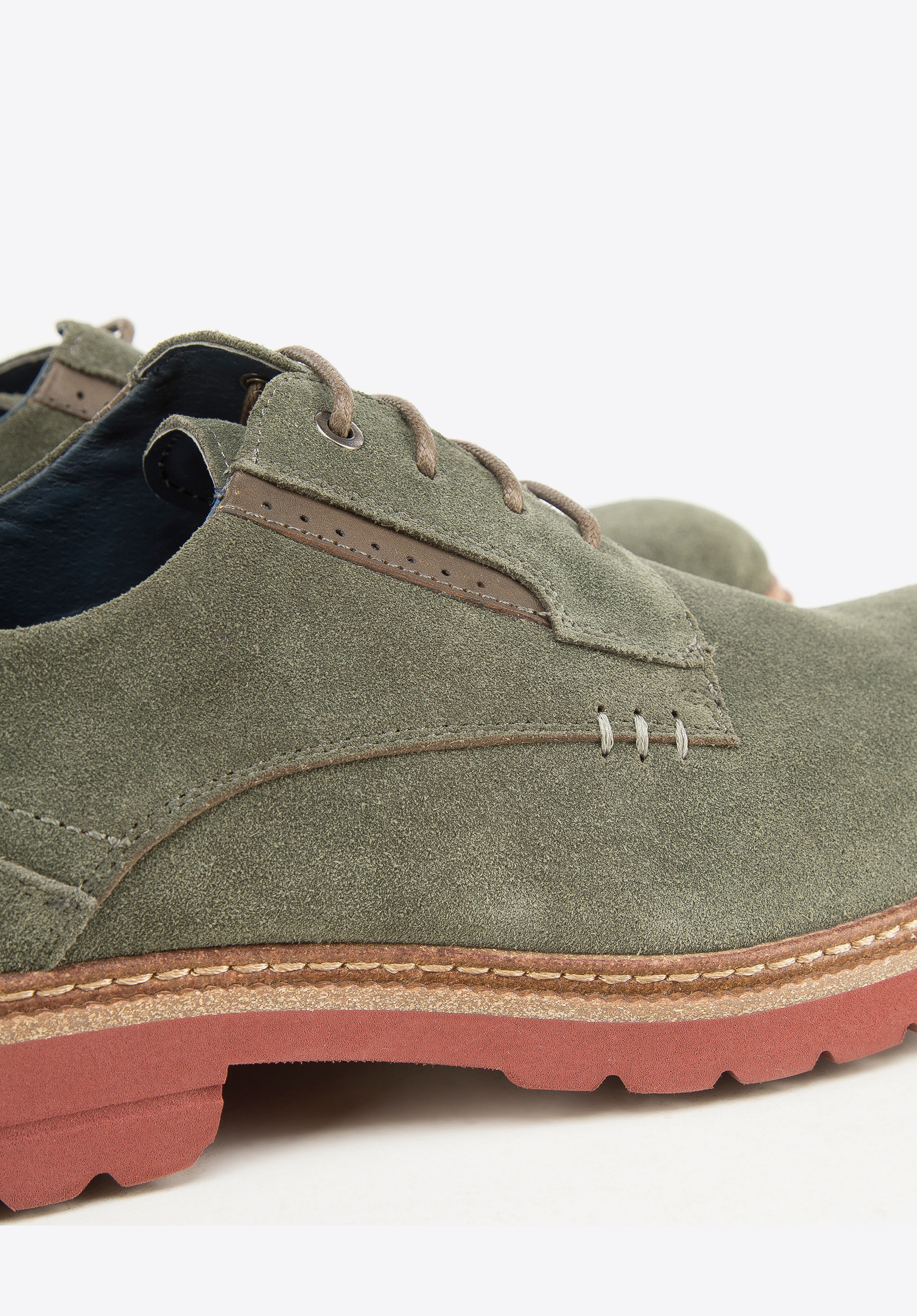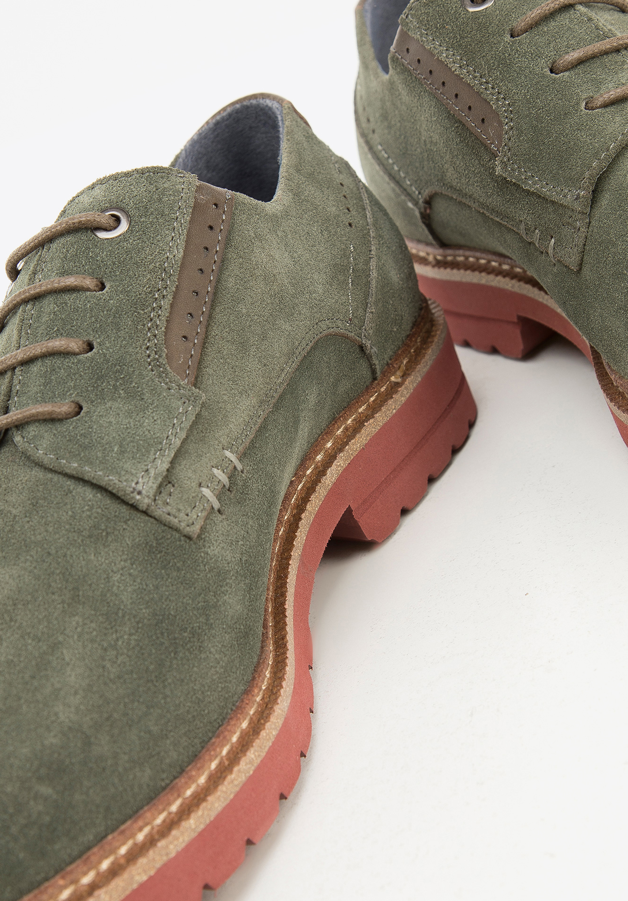 z wysokiej jakości zamszu uzupełnionego skórą licową przy sznurówkach i napiętku. Dzięki skórzanej wkładce, miękkiej wyściółce i lekkiej podeszwie komfortowo przechodzisz w nich wiele godzin. To proste, uniwersalne buty, które jednak przykuwają wzrok dzięki kolorom i ciekawym detalom. Będą świetnie wyglądały na przykład z dżinsami i t-shirtem, a także z lnianym garniturem.