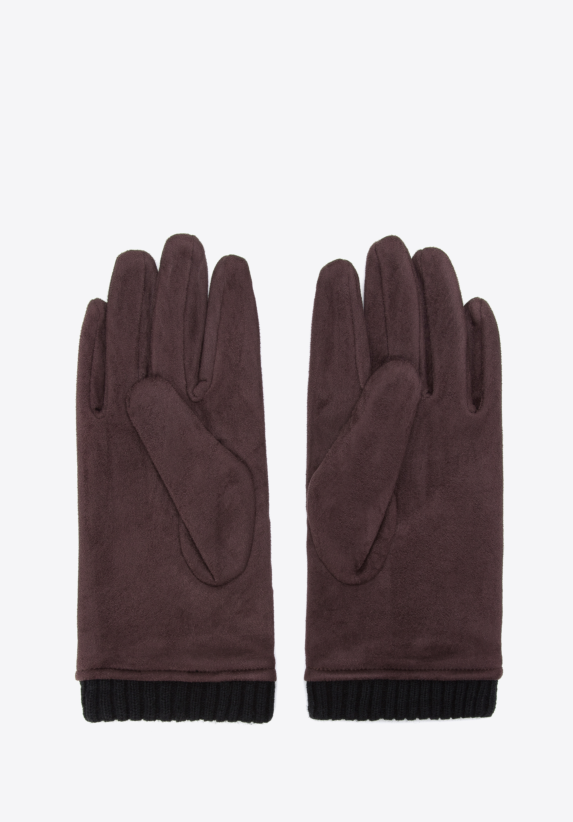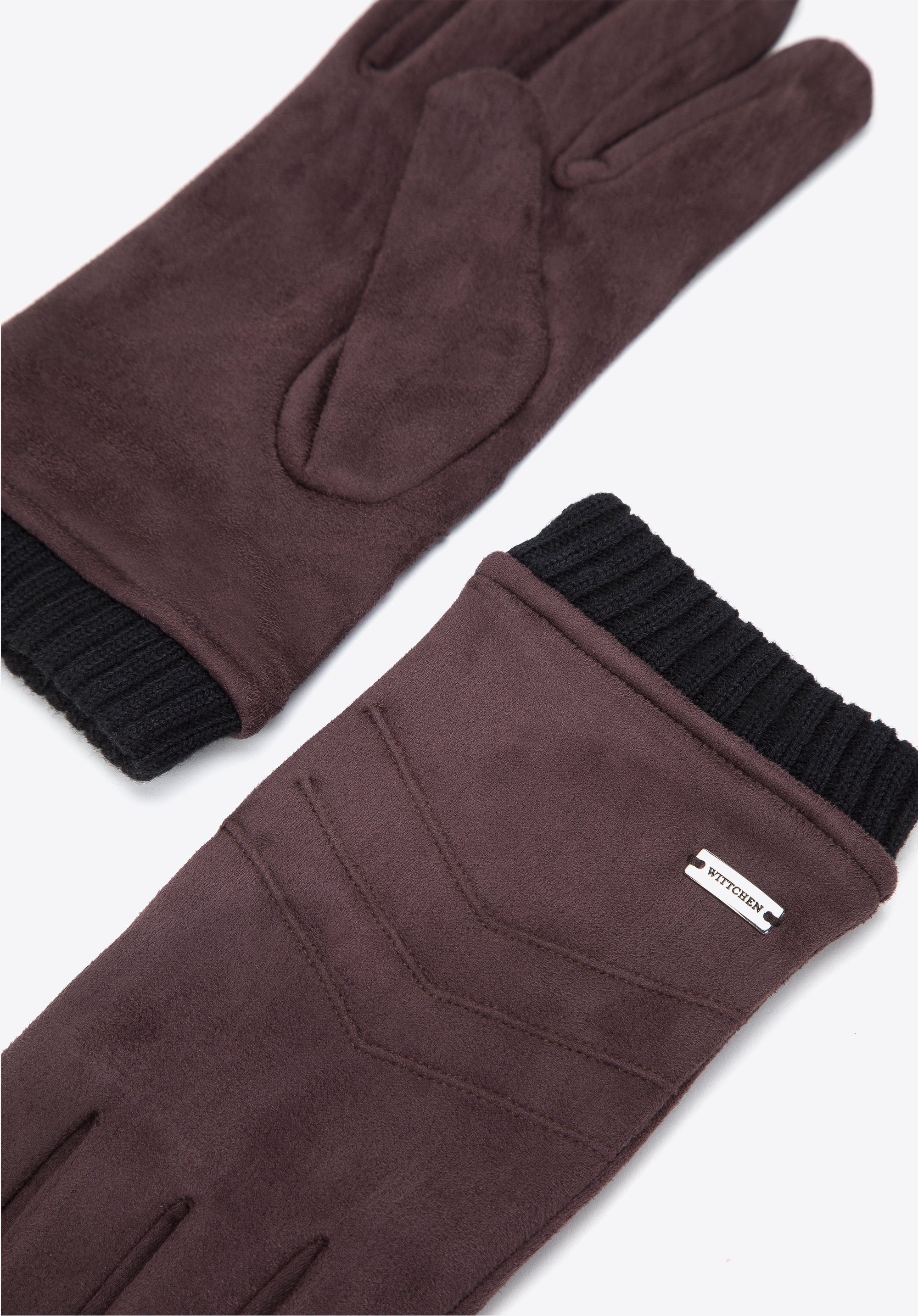 z miękkiego tworzywa przypominającego zamsz. Ozdobne przeszycia w kształt litery „V” podkreślą i wysmuklą nadgarstek. Na dole mają