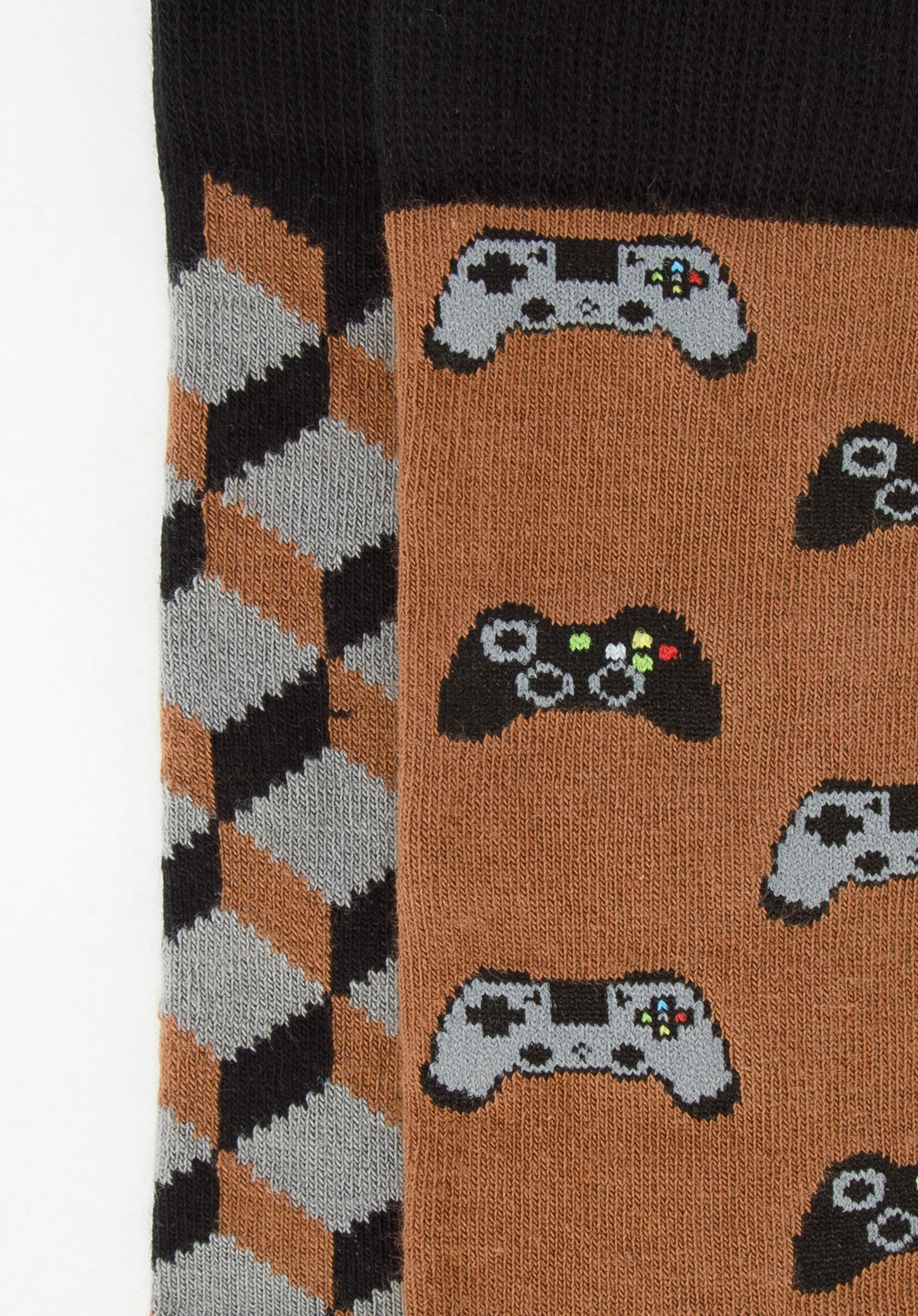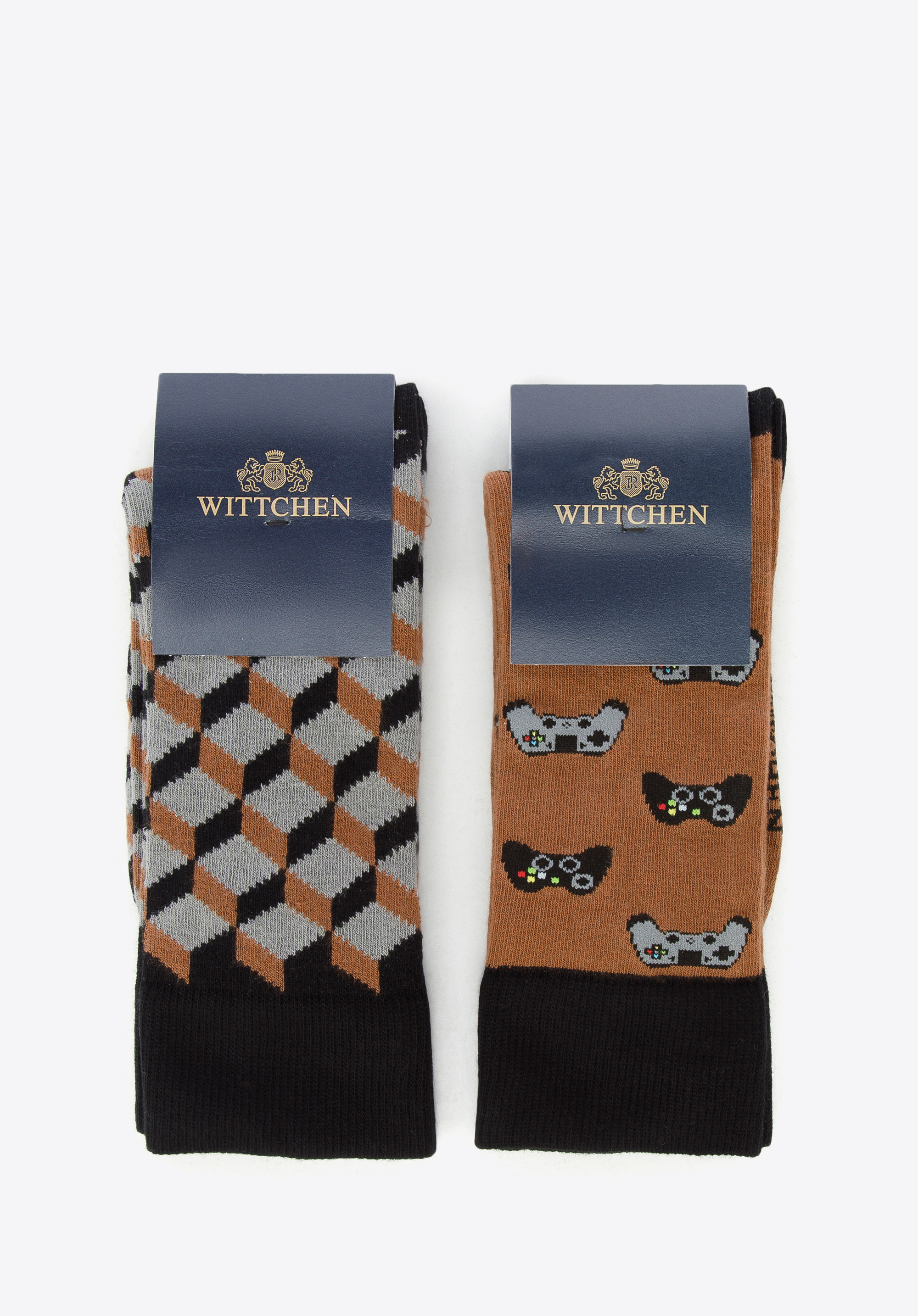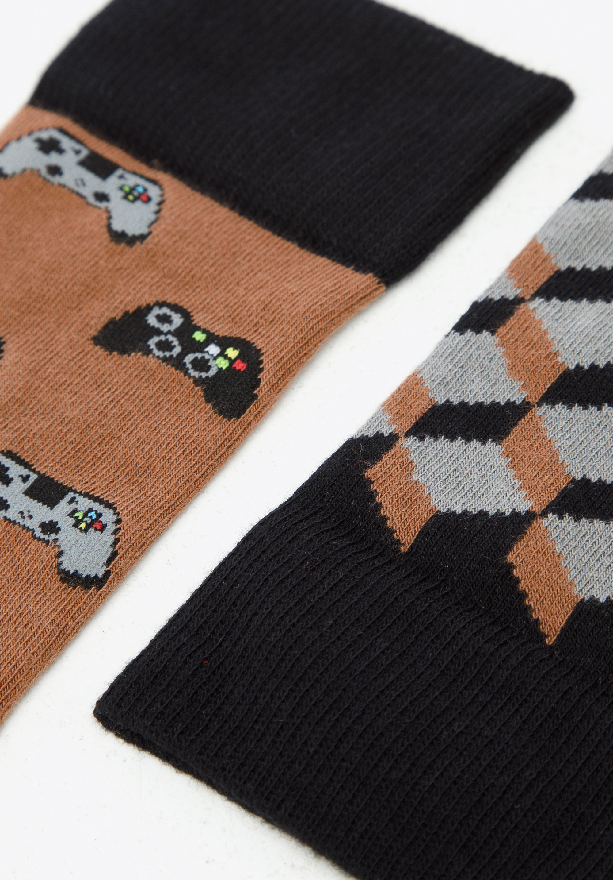 dwie różne pary: w trójwymiarowy, geometryczny wzór oraz w wyszyte pady – idealne dla miłośnika gier. Skarpetki wykonane zostały