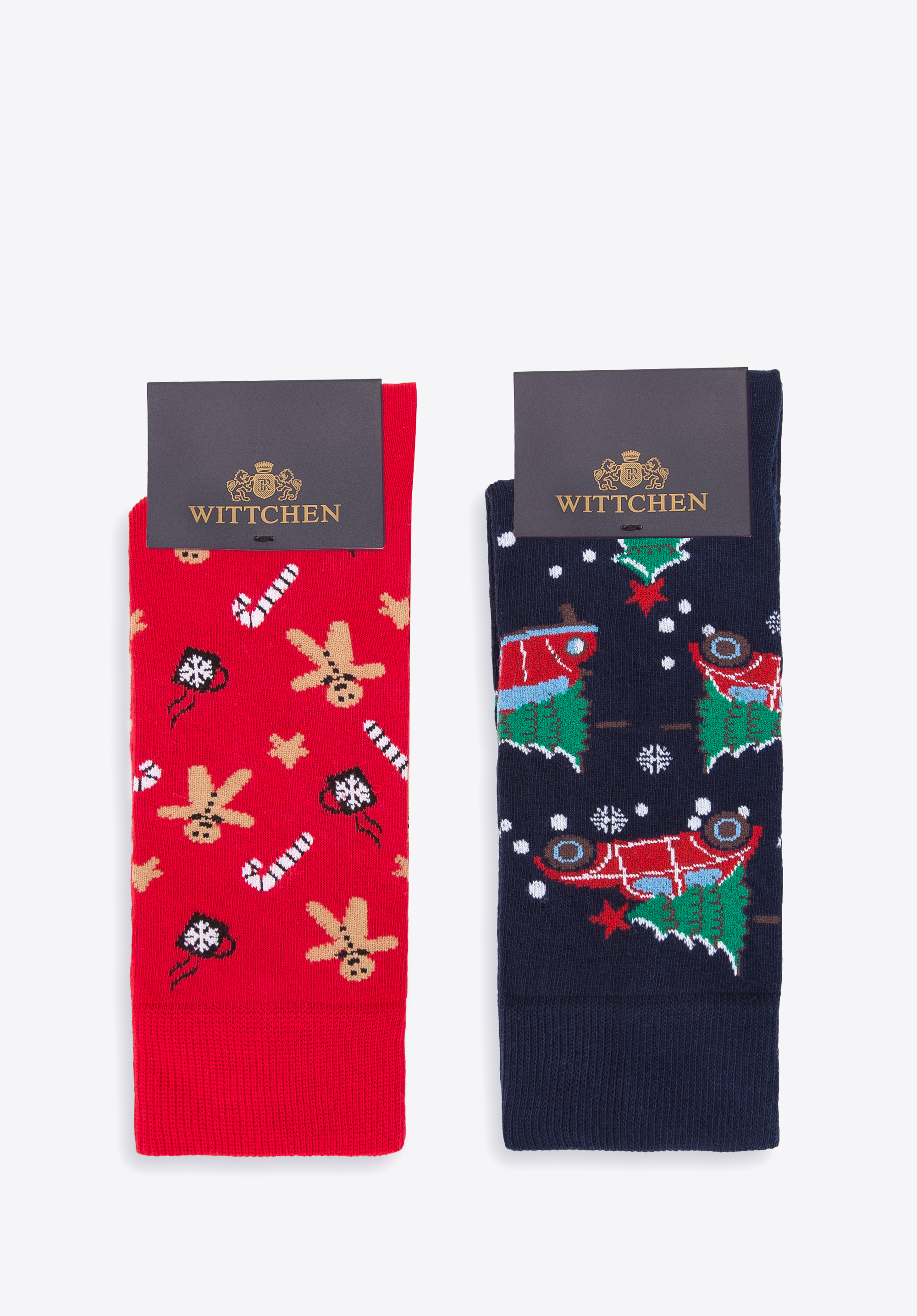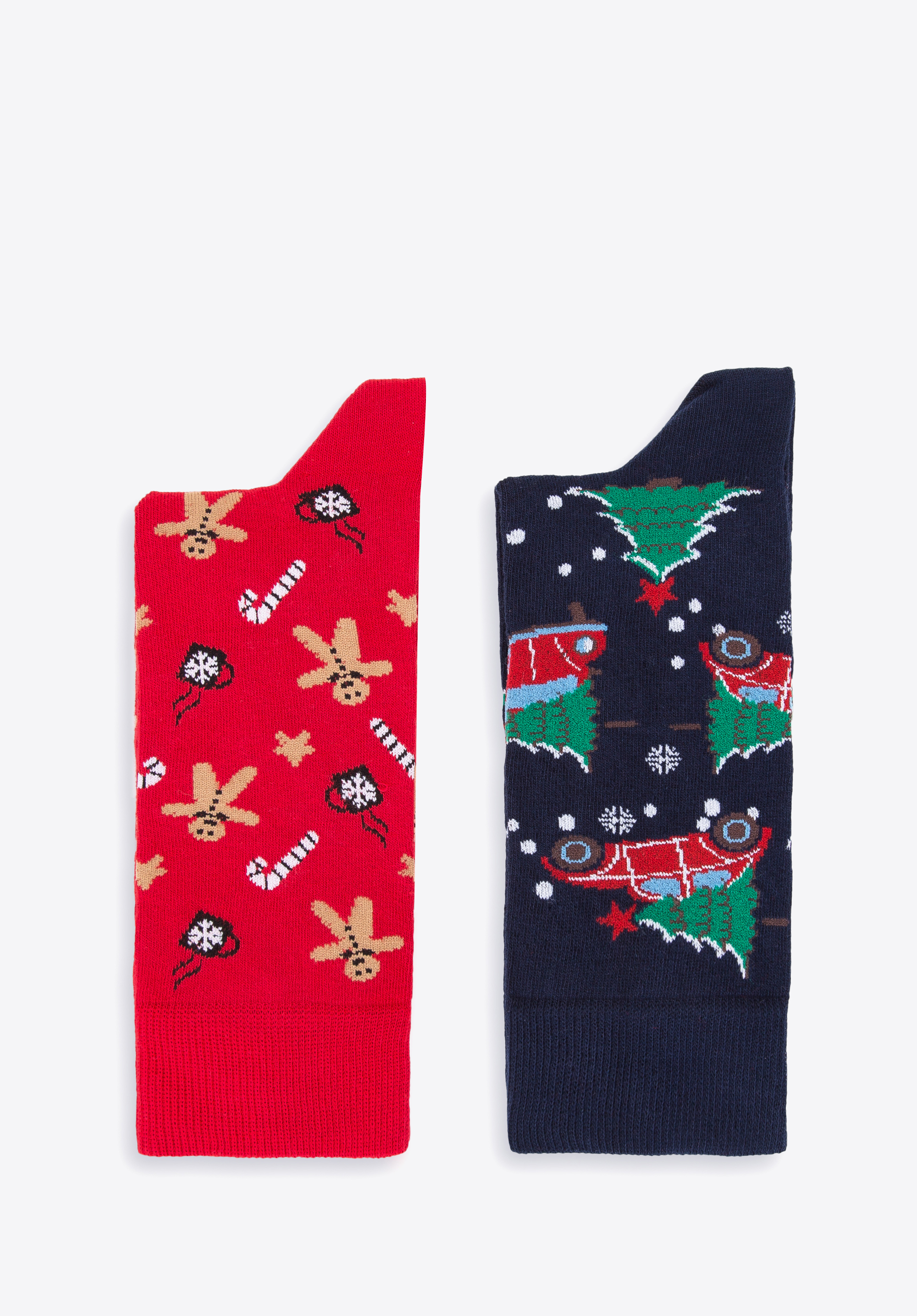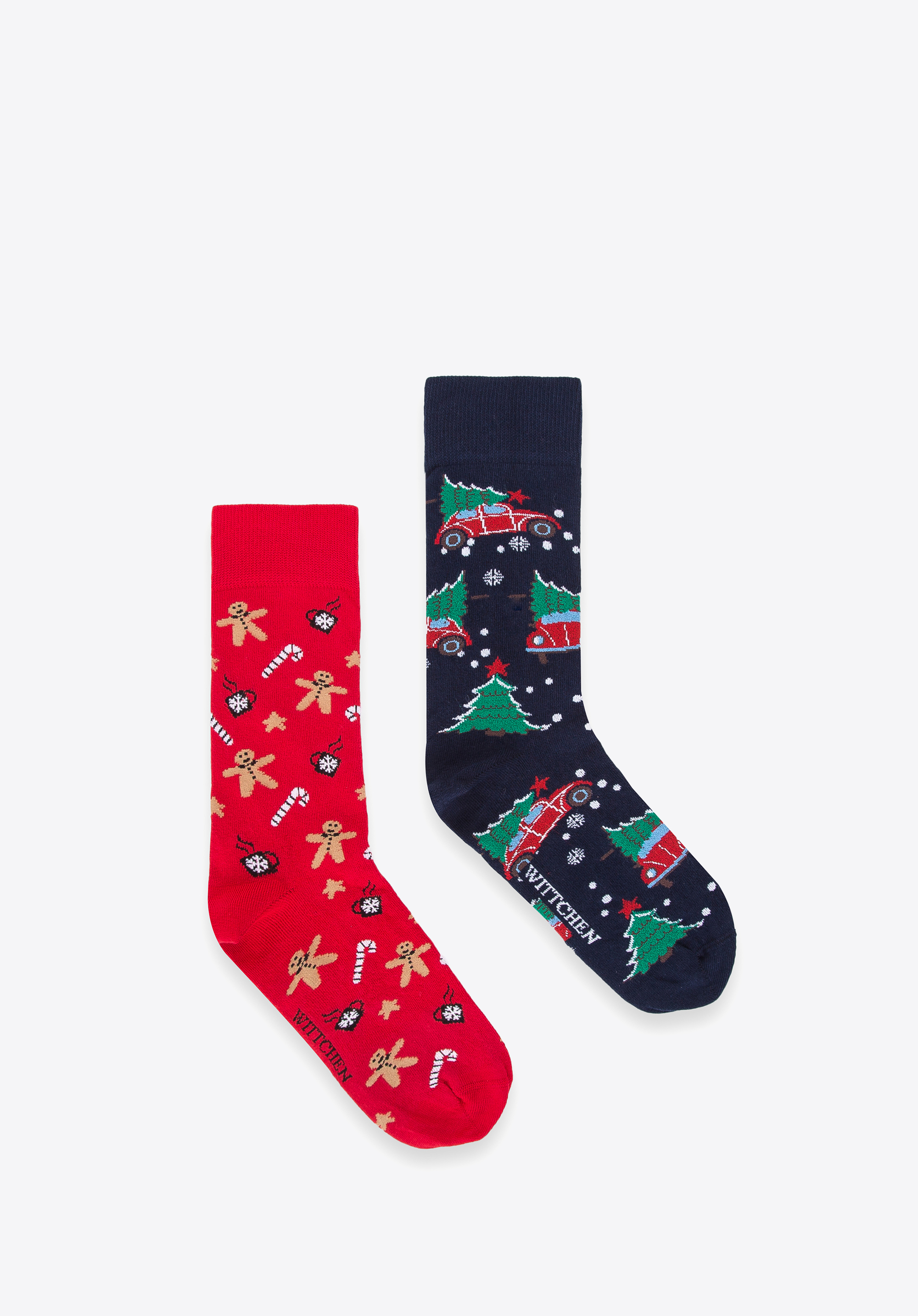Zestaw składa się z dwóch różnych par: jednej w drobny wzór ze świątecznymi słodkościami, a drugiej: w samochód wiozący świąteczną choinkę. Wykonano je