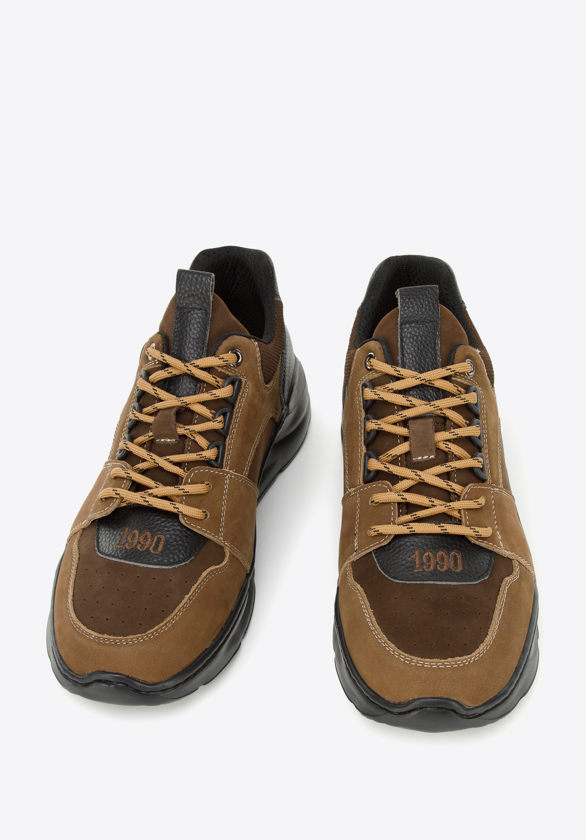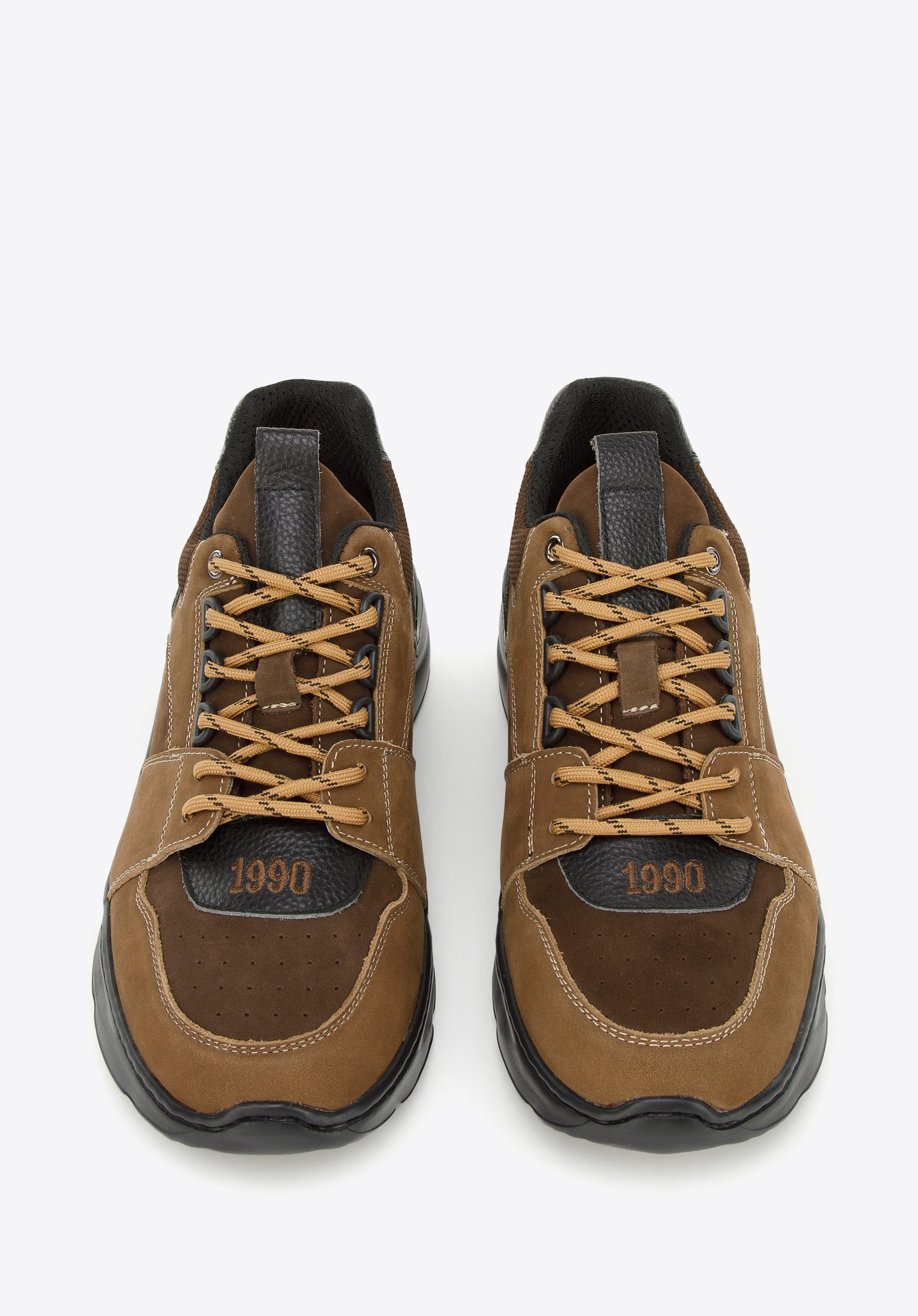 Matowa skóra nubukowa kontrastuje z groszkowaną skórą naturalną przy sznurówkach i z tyłu buta. Dzięki