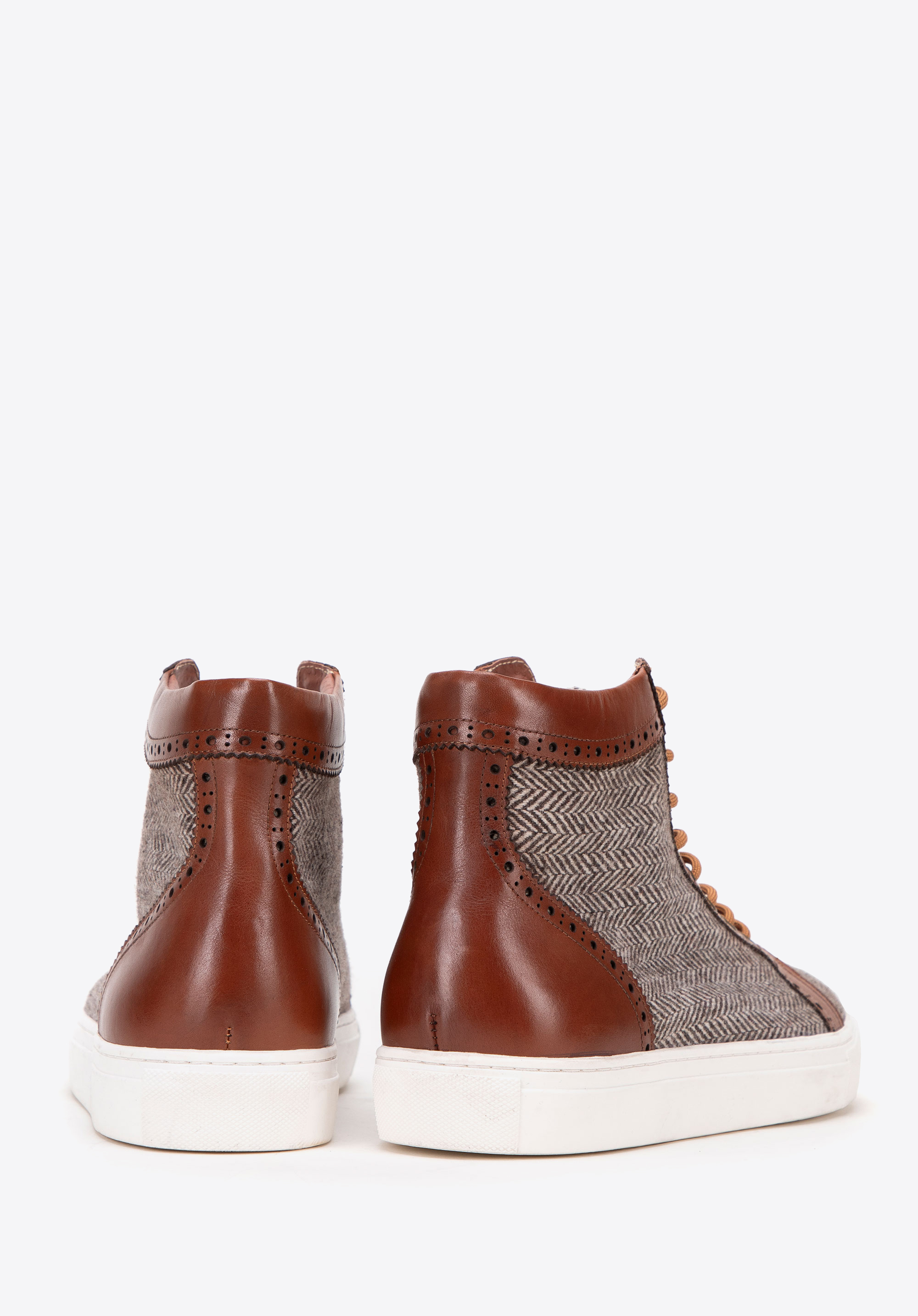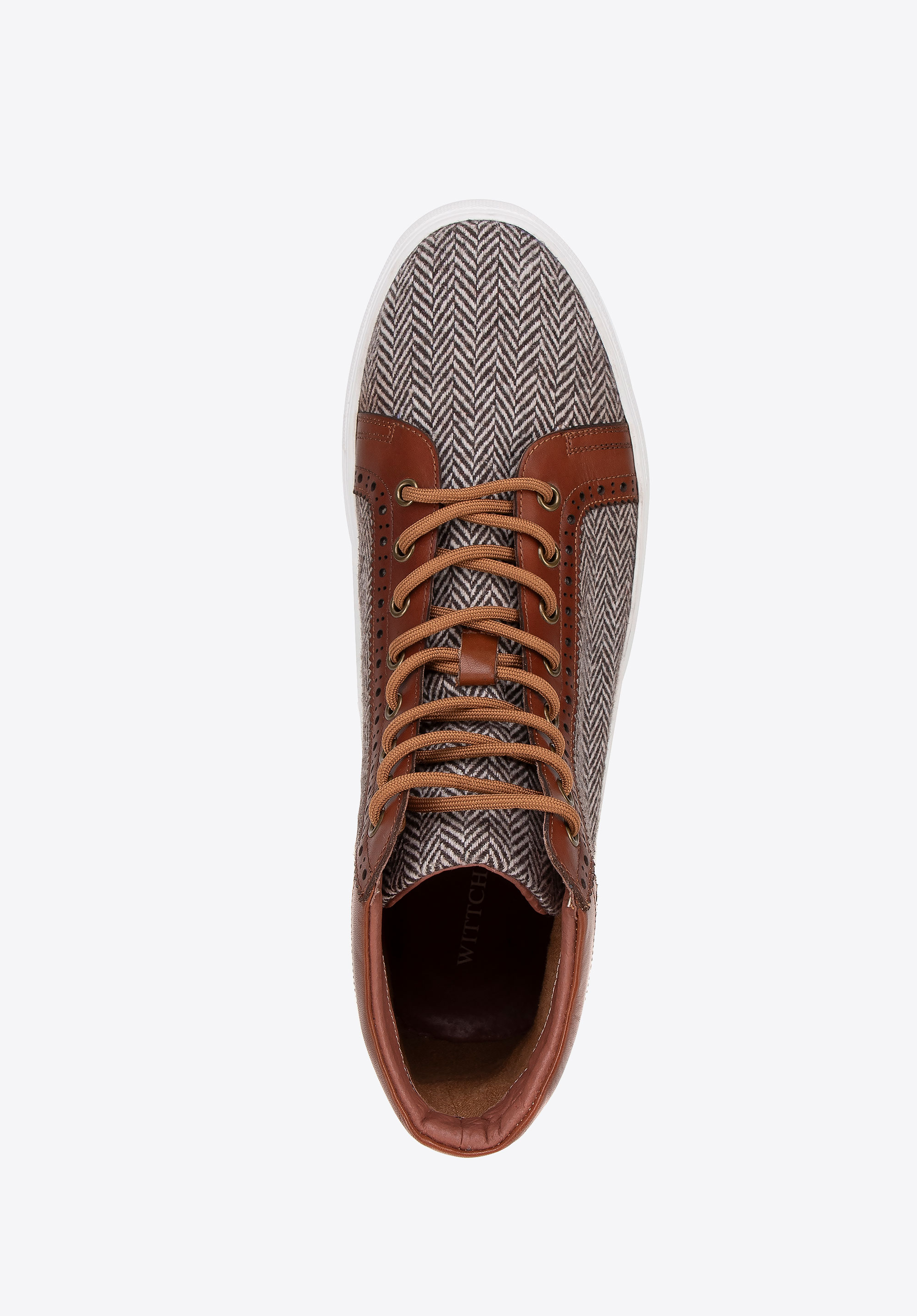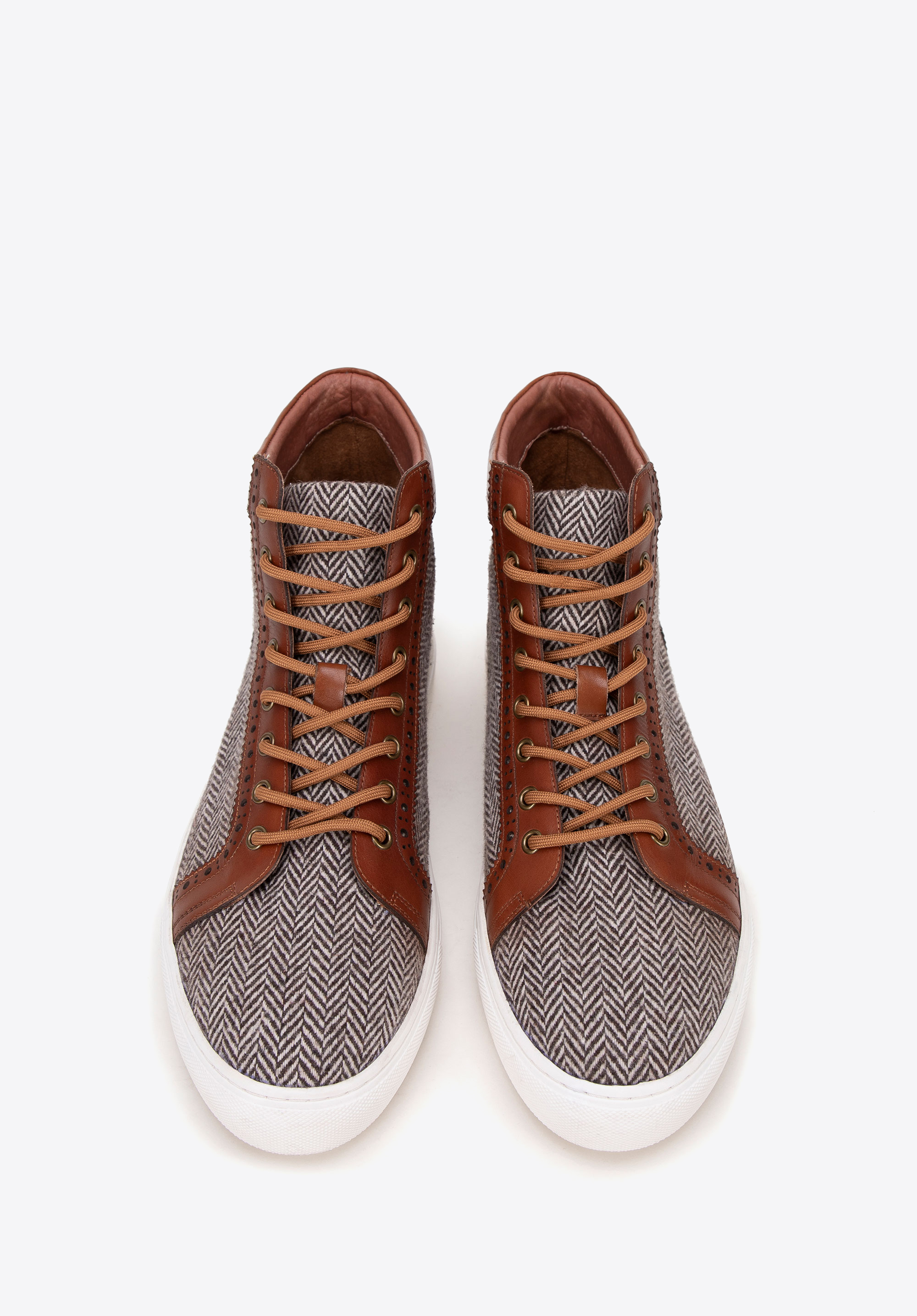 Te męskie sneakersy to kwintesencja komfortu, wykonane z najwyższej jakości naturalnej skóry licowej, uzupełnione subtelnie wykończonymi wstawkami z materiału włókienniczego. Wyjątkowo miękka skórzana wyściółka zapewnia niezrównaną wygodę noszenia i ochronę stóp. Sneakersy charakteryzują się noskiem w kształcie migdała oraz eleganckim sznurowaniem, co podkreśla ich wysublimowany styl. Solidna gumowa podeszwa zapewnia stabilność i trwałość, a delikatne perforacje na łączeniach materiałów zwiększają wentylację, gwarantując świeżość na długie godziny użytkowania.