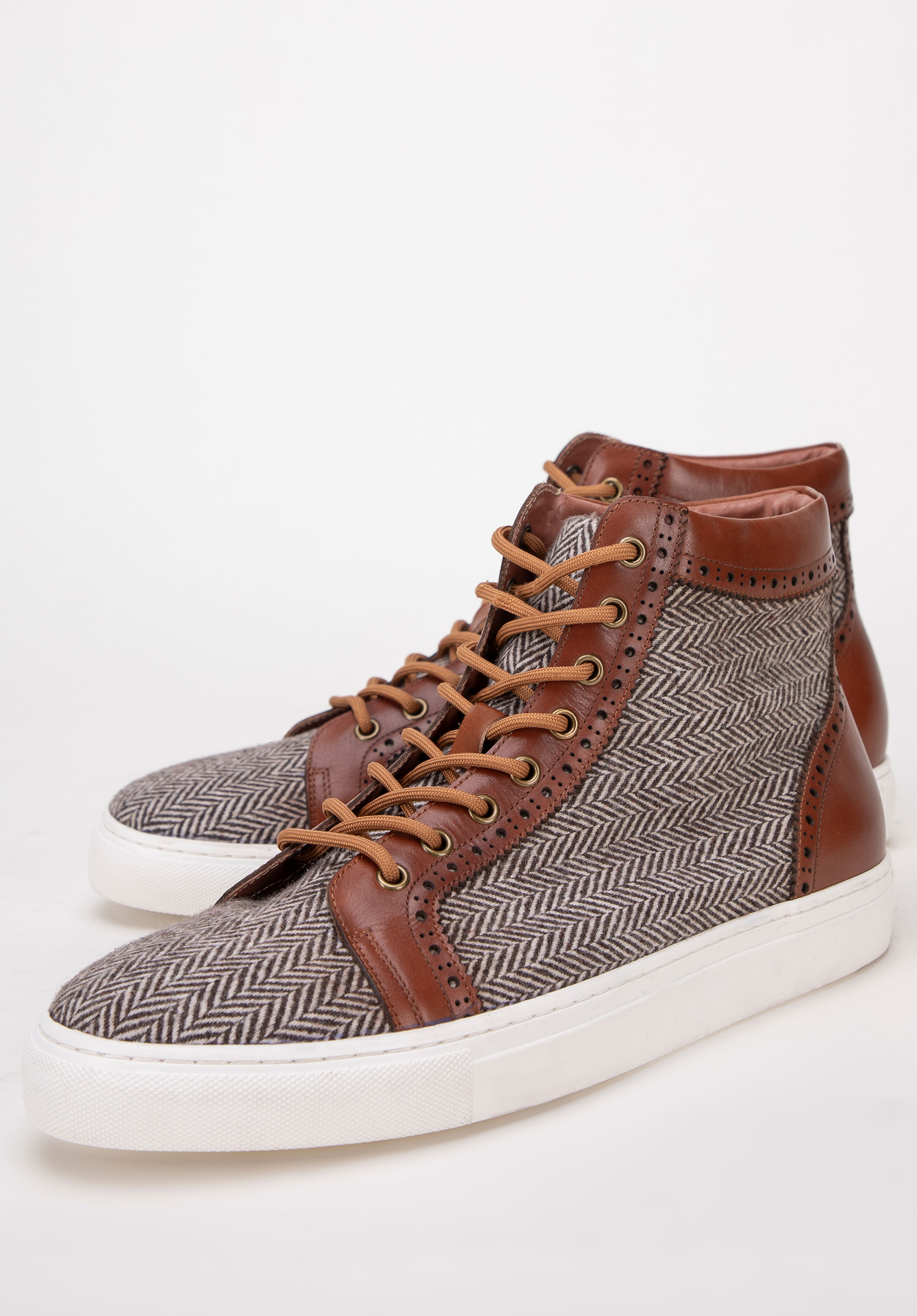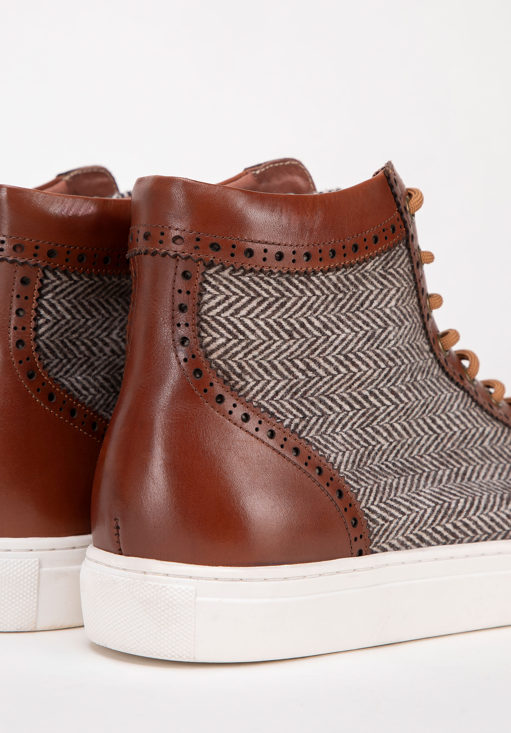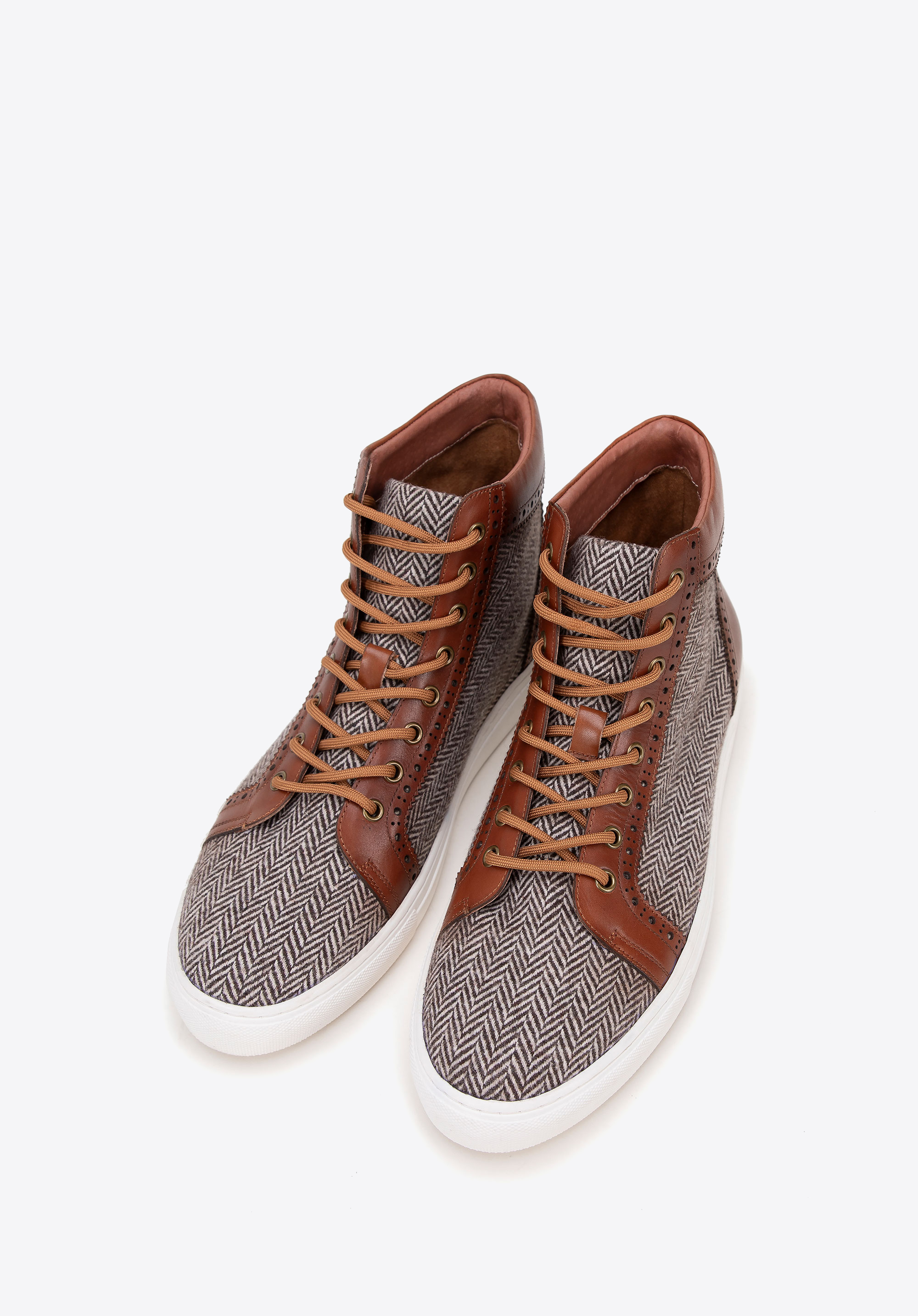 Te męskie sneakersy to kwintesencja komfortu, wykonane z najwyższej jakości naturalnej skóry licowej, uzupełnione subtelnie wykończonymi wstawkami z materiału włókienniczego. Wyjątkowo miękka skórzana wyściółka zapewnia niezrównaną wygodę noszenia i ochronę stóp. Sneakersy charakteryzują się noskiem w kształcie migdała oraz eleganckim sznurowaniem, co podkreśla ich wysublimowany styl. Solidna gumowa podeszwa zapewnia stabilność i trwałość, a delikatne perforacje na łączeniach materiałów zwiększają wentylację, gwarantując świeżość na długie godziny użytkowania.