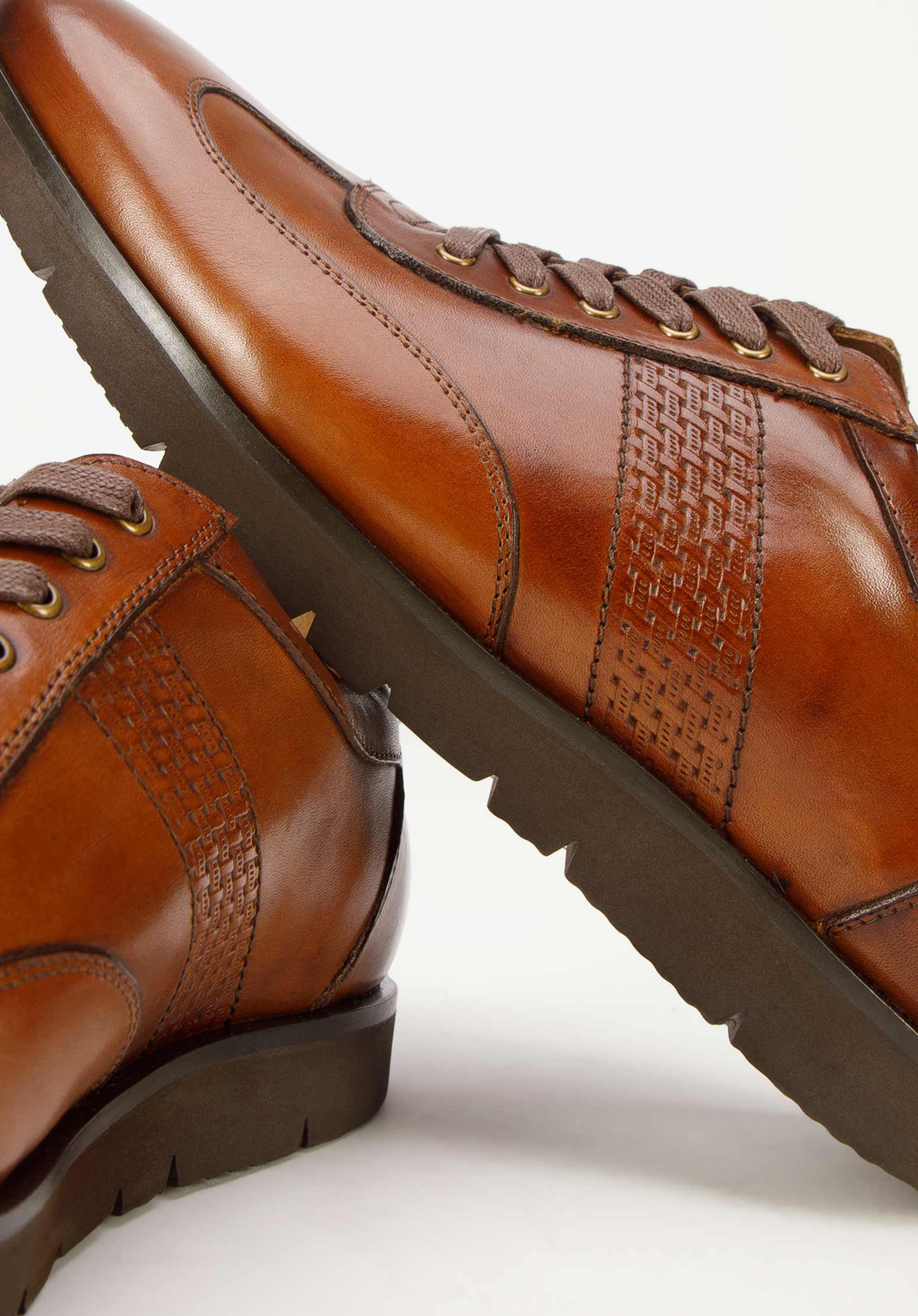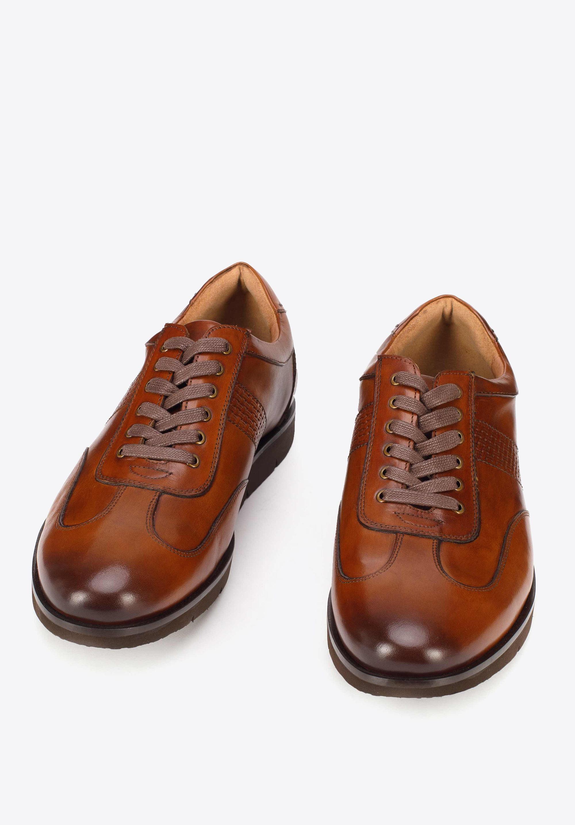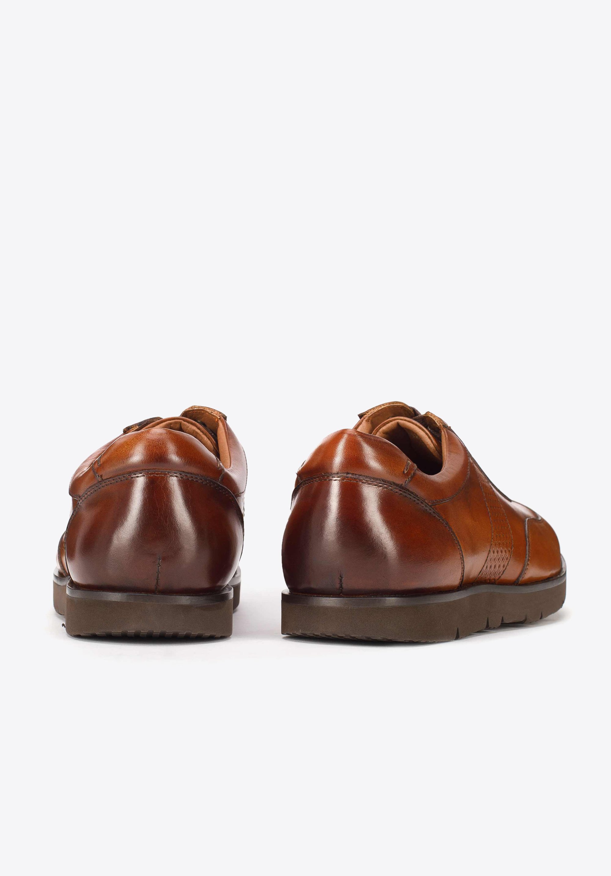 Buty dla mężczyzny, który wybierając wygodę nie chce rezygnować jednocześnie ze stylu. Uszyte są z wysokiej jakości skóry naturalnej. Wnętrze buta również wyściełane jest skórą. Te sneakersy mają zgrabny kształt, dyskretnie wysmuklający stopę. Osadzone są na piankowej platformie z bieżnikiem, co zwiększa ich przyczepność do podłoża. Mając je na nogach będziesz czuł się lekko i pewnie. Męskie snekaersy skórzane perforowane możesz nosić przez cały dzień do nieformalnego stroju, jeśli możesz sobie na taki ubiór pozwolić w pracy, a także na wieczorną randkę. Nasza rada: spróbuj przełamać elegancki strój i założyć do nich sneakersy. Na początek wybierz te, które kształtem przypominają buty do garnituru.