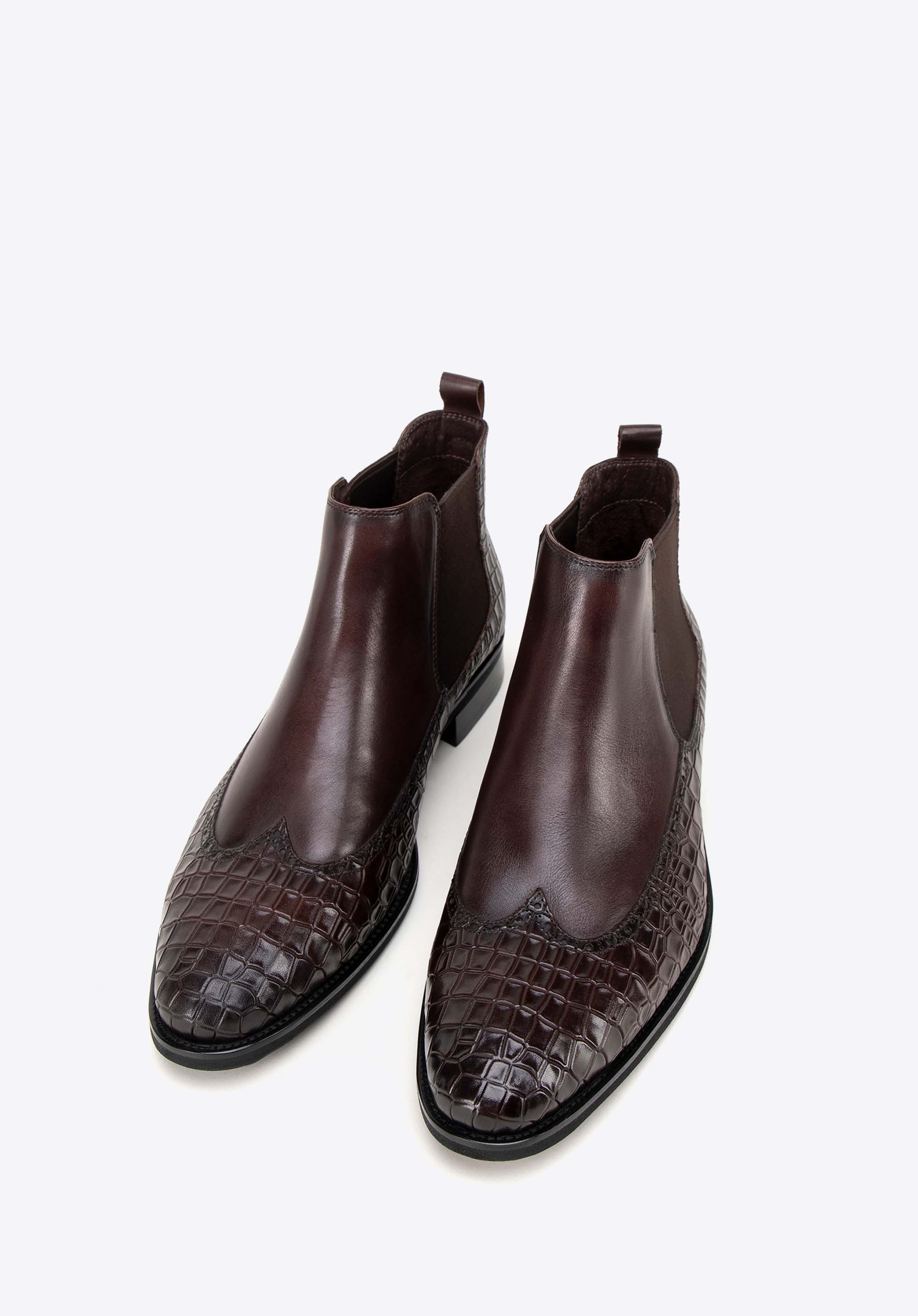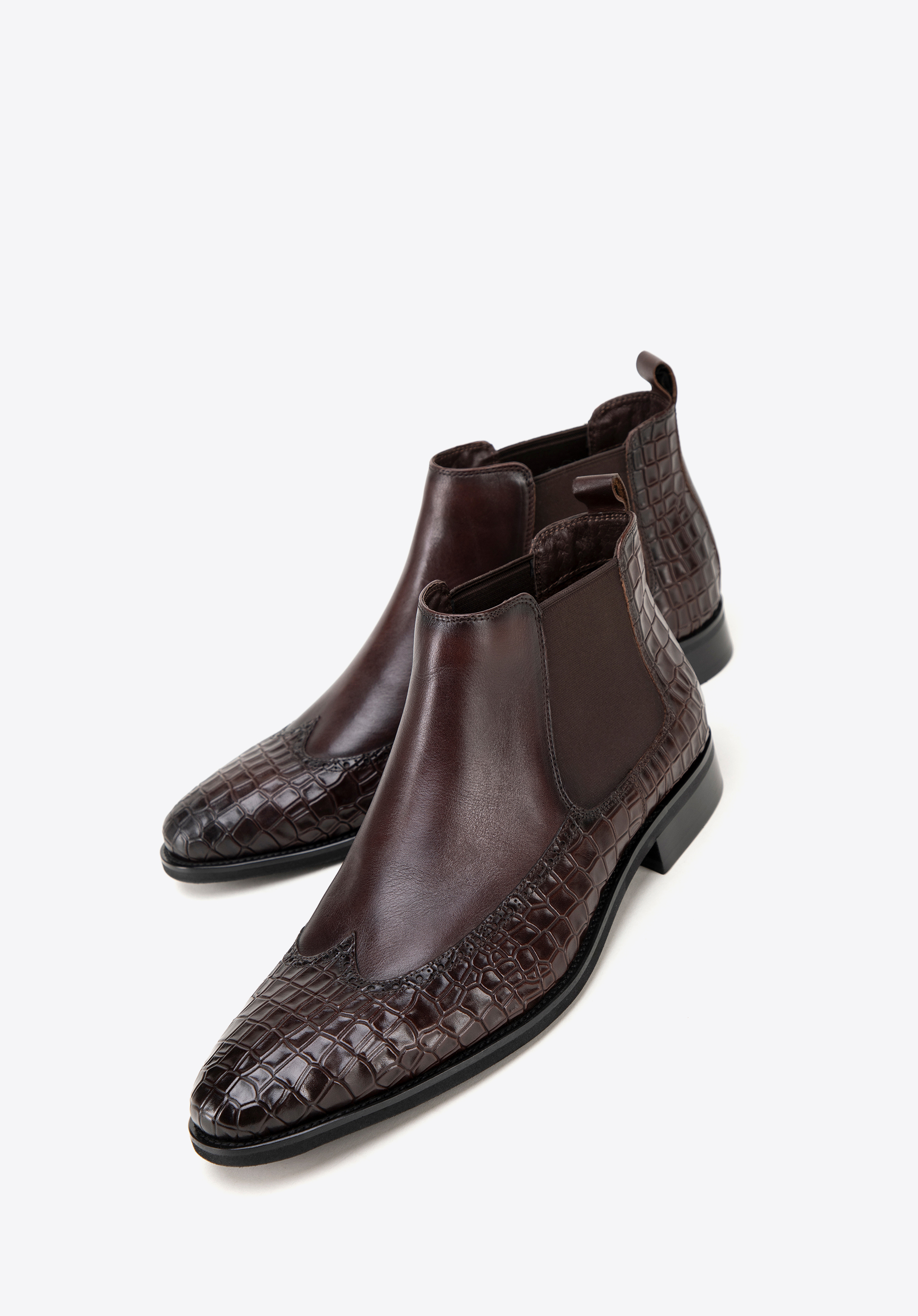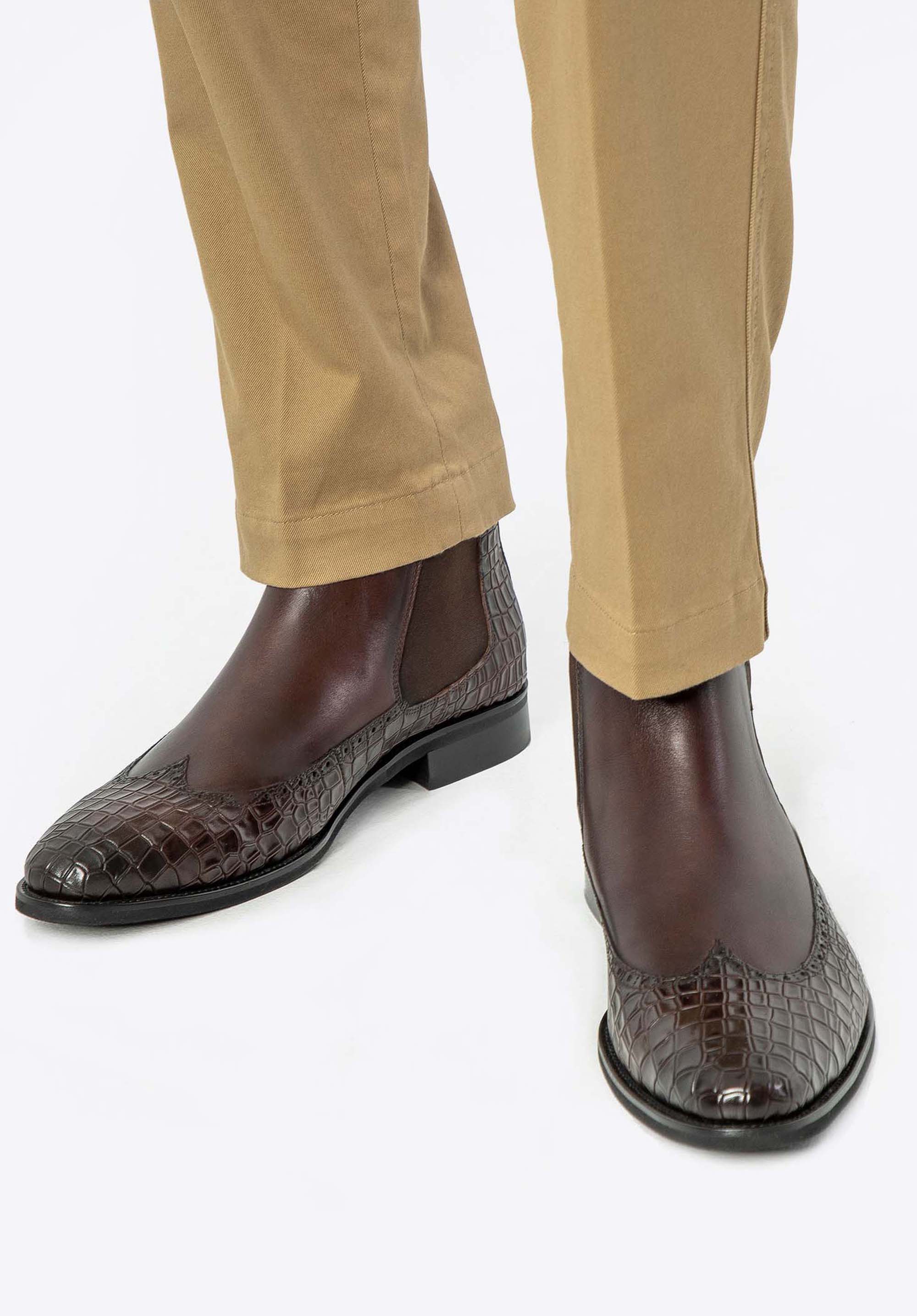 Te męskie sztyblety łączą elegancję z wyjątkowym designem. Wykonane z najwyższej jakości naturalnej skóry licowej, z wiekiem zyskują na szlachetności i charakterze. Dzięki klasycznej płaskiej podeszwie oraz elastycznym wstawkom po bokach buty te są nie tylko stylowe, ale również niezwykle wygodne w zakładaniu. Miłośnicy unikalnych akcentów docenią detale takie jak: motyw imitujący skórę krokodyla oraz nosek w kształcie migdała ozdobiony perforowanymi skrzydełkami inspirowanymi stylem brogsów. Te sztyblety to doskonały sposób na podkreślenie Twojego indywidualnego stylu, niezależnie od okazji.