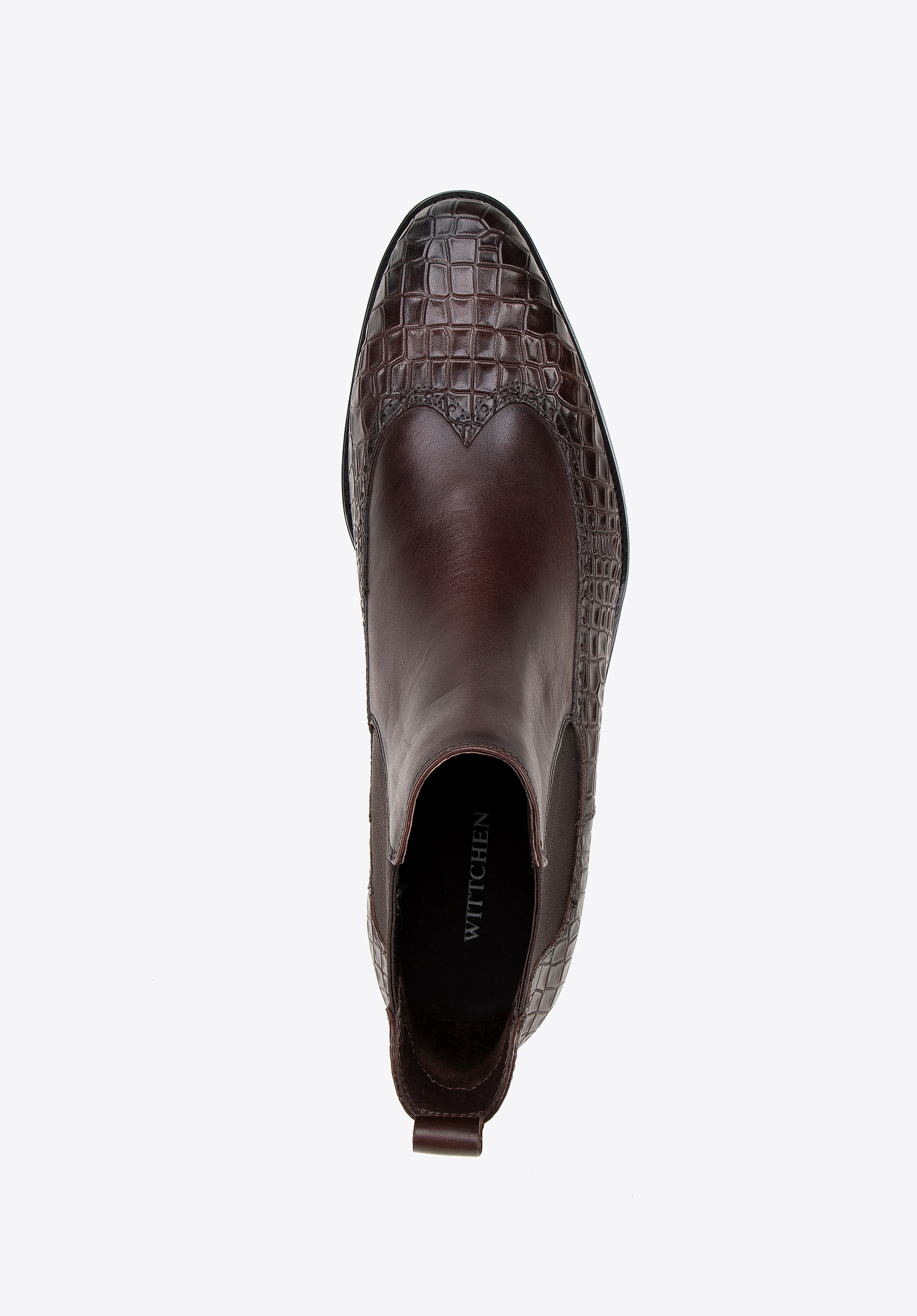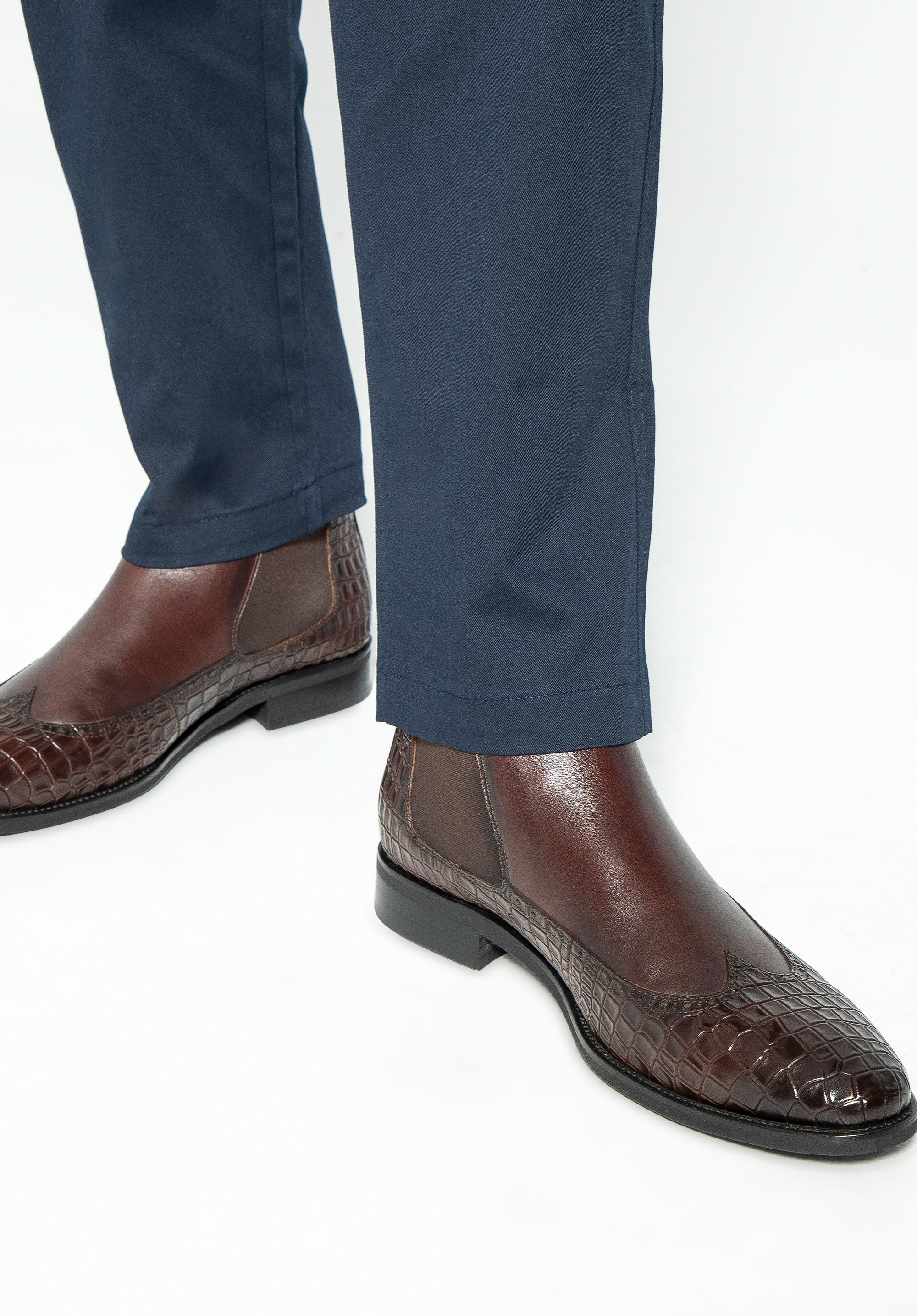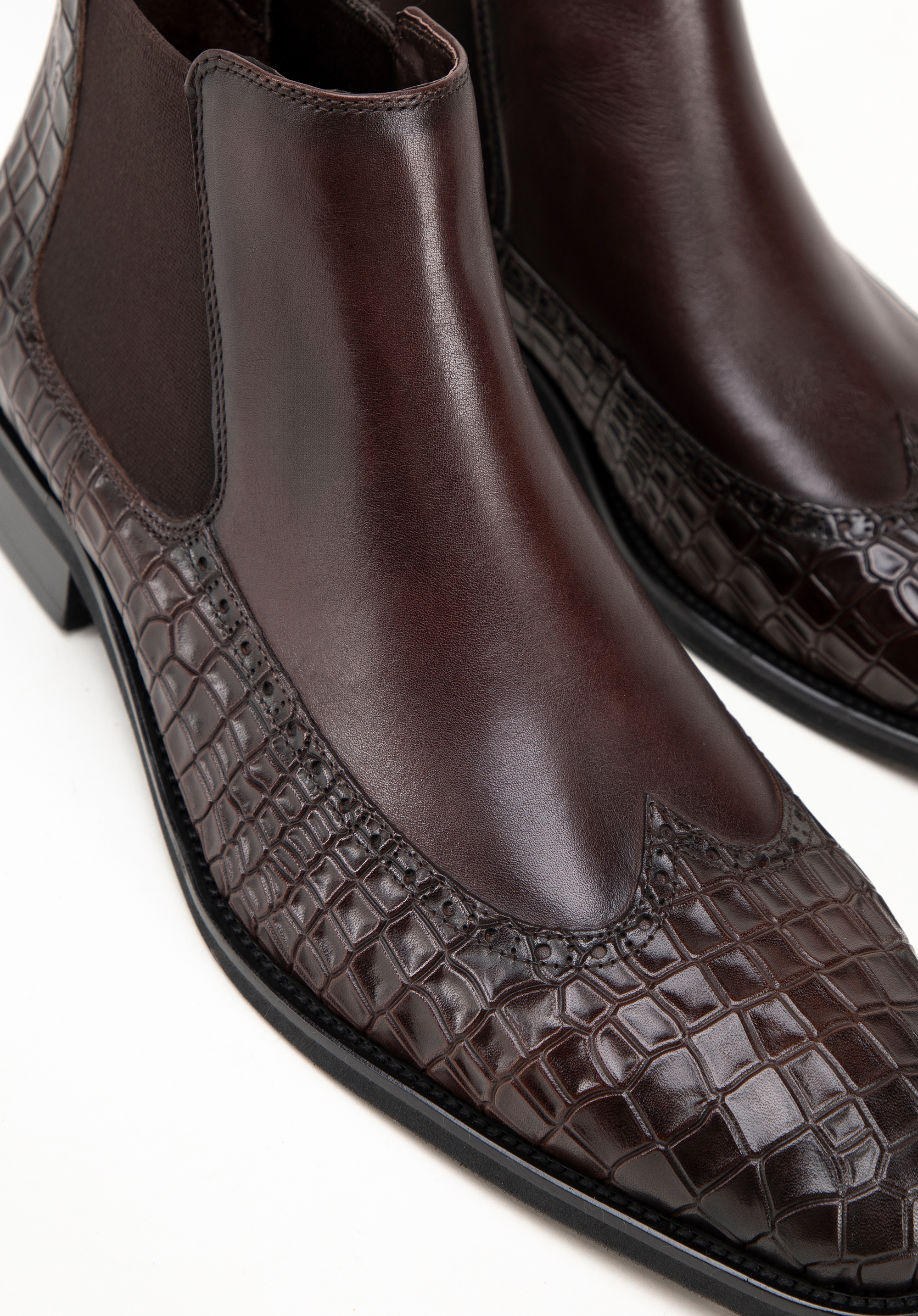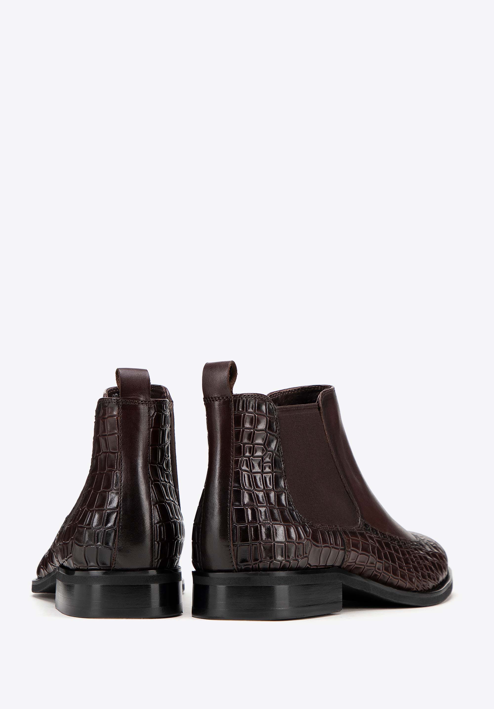 Te męskie sztyblety łączą elegancję z wyjątkowym designem. Wykonane z najwyższej jakości naturalnej skóry licowej, z wiekiem zyskują na szlachetności i charakterze. Dzięki klasycznej płaskiej podeszwie oraz elastycznym wstawkom po bokach buty te są nie tylko stylowe, ale również niezwykle wygodne w zakładaniu. Miłośnicy unikalnych akcentów docenią detale takie jak: motyw imitujący skórę krokodyla oraz nosek w kształcie migdała ozdobiony perforowanymi skrzydełkami inspirowanymi stylem brogsów. Te sztyblety to doskonały sposób na podkreślenie Twojego indywidualnego stylu, niezależnie od okazji.