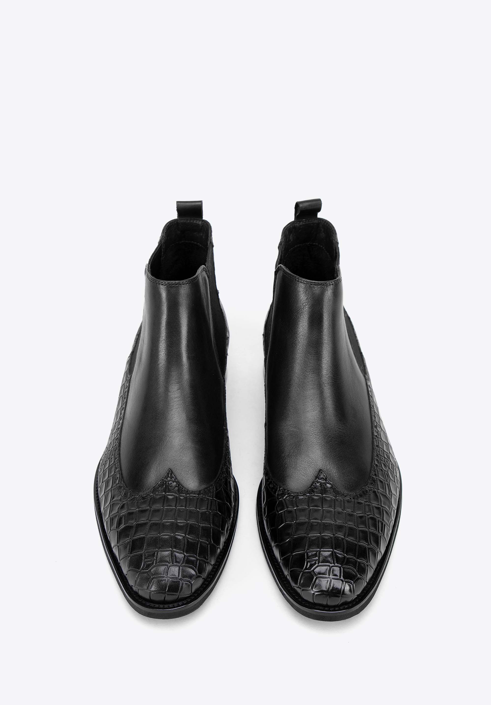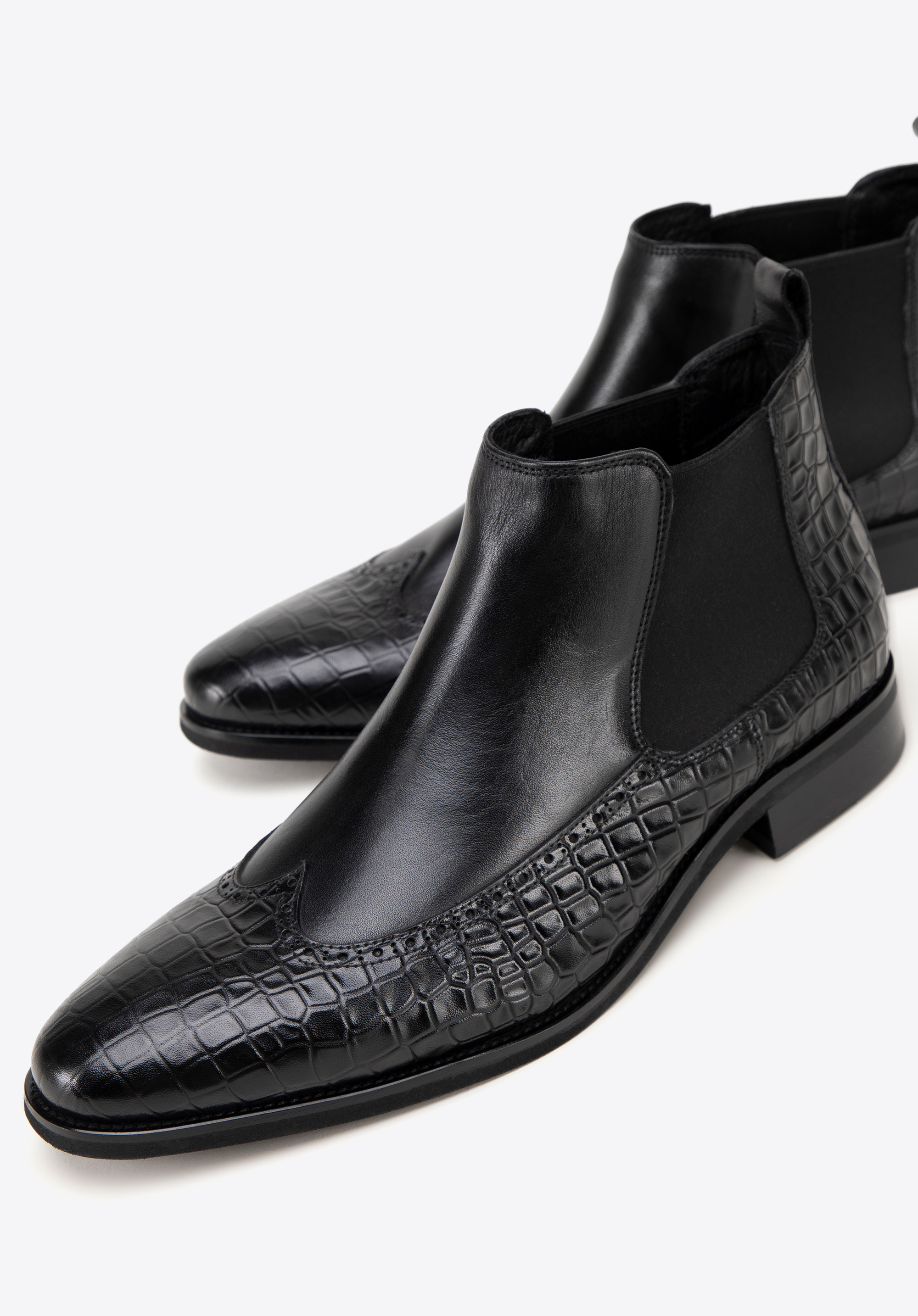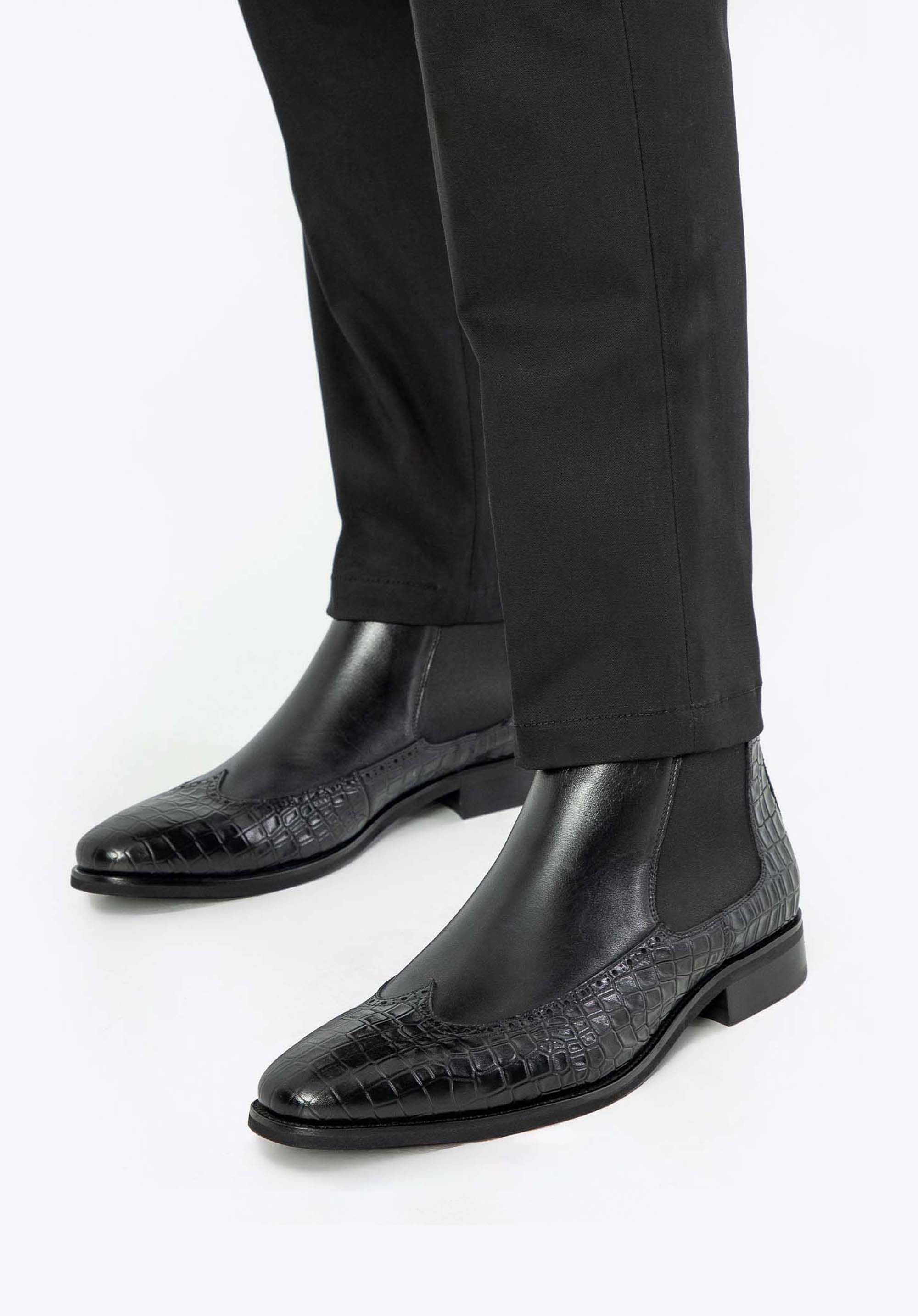 Te męskie sztyblety łączą elegancję z wyjątkowym designem. Wykonane z najwyższej jakości naturalnej skóry licowej, z wiekiem zyskują na szlachetności i charakterze. Dzięki klasycznej płaskiej podeszwie oraz elastycznym wstawkom po bokach buty te są nie tylko stylowe, ale również niezwykle wygodne w zakładaniu. Miłośnicy unikalnych akcentów docenią detale takie jak: motyw imitujący skórę krokodyla oraz nosek w kształcie migdała ozdobiony perforowanymi skrzydełkami inspirowanymi stylem brogsów. Te sztyblety to doskonały sposób na podkreślenie Twojego indywidualnego stylu, niezależnie od okazji.