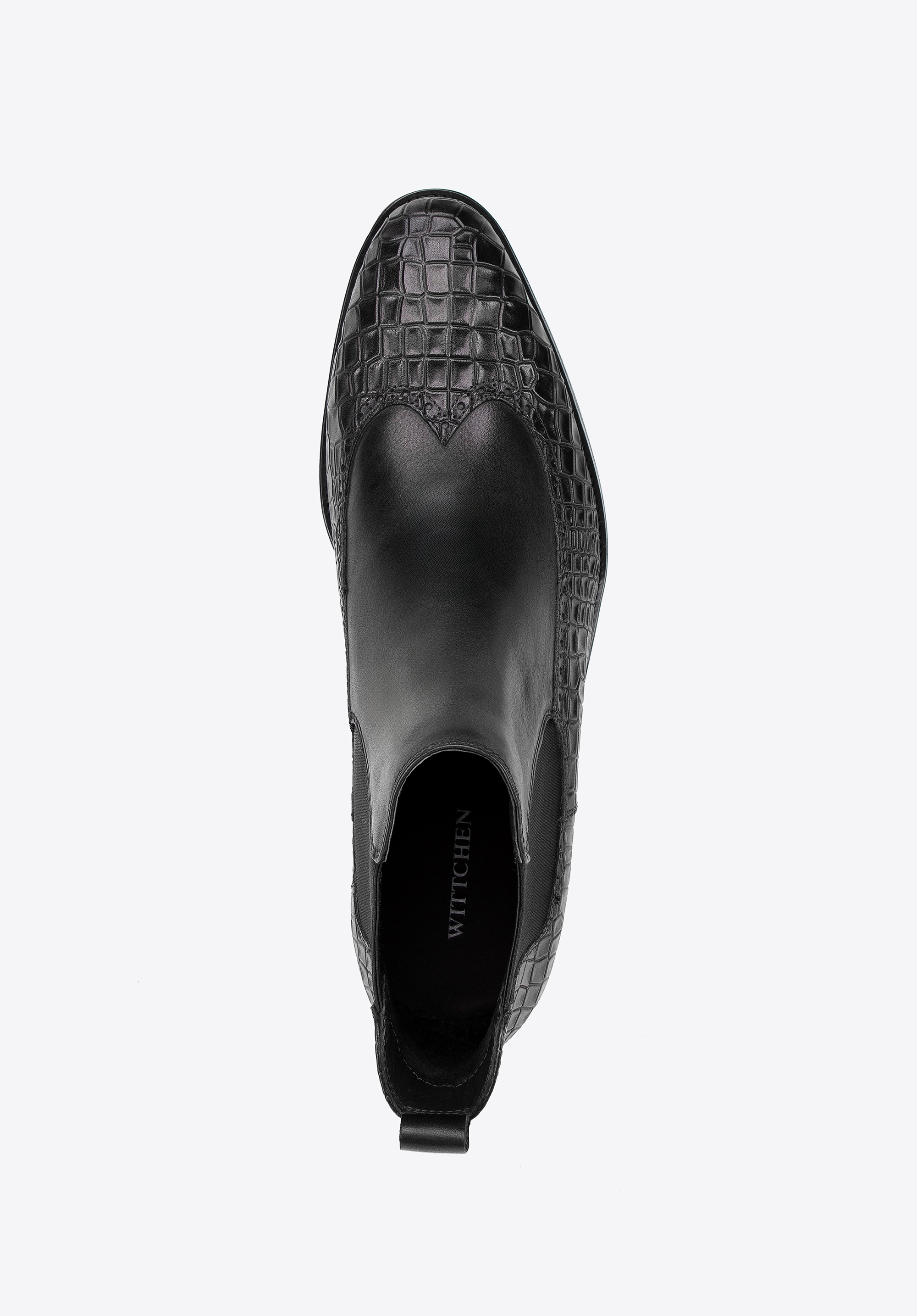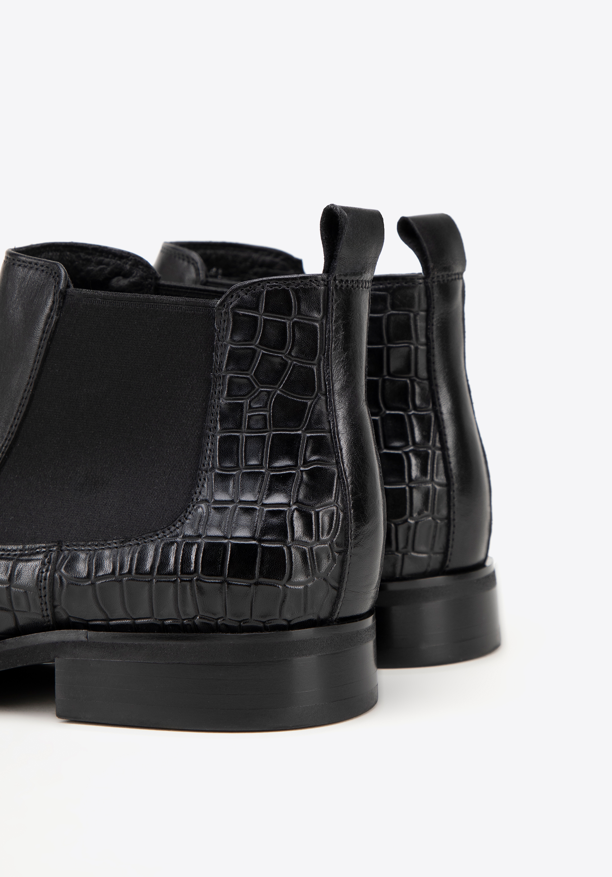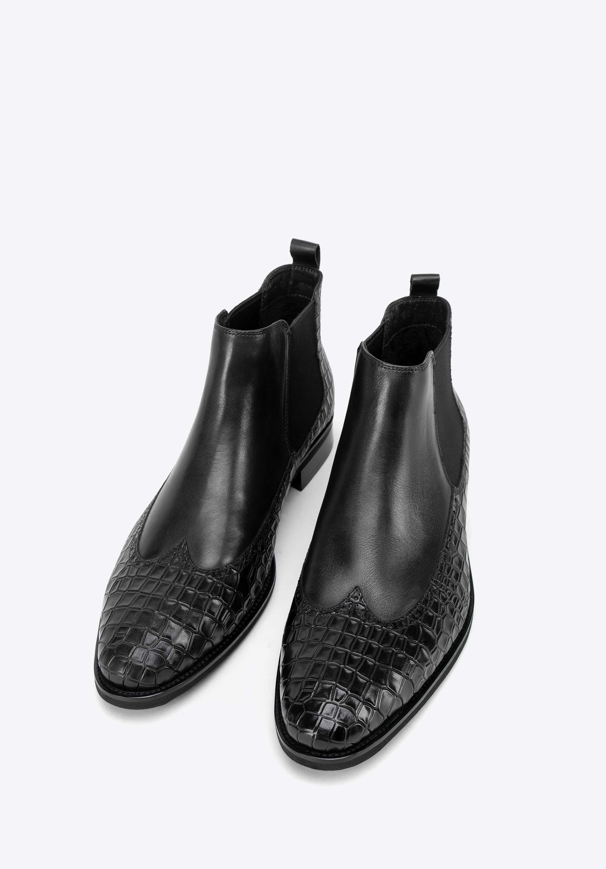 Te męskie sztyblety łączą elegancję z wyjątkowym designem. Wykonane z najwyższej jakości naturalnej skóry licowej, z wiekiem zyskują na szlachetności i charakterze. Dzięki klasycznej płaskiej podeszwie oraz elastycznym wstawkom po bokach buty te są nie tylko stylowe, ale również niezwykle wygodne w zakładaniu. Miłośnicy unikalnych akcentów docenią detale takie jak: motyw imitujący skórę krokodyla oraz nosek w kształcie migdała ozdobiony perforowanymi skrzydełkami inspirowanymi stylem brogsów. Te sztyblety to doskonały sposób na podkreślenie Twojego indywidualnego stylu, niezależnie od okazji.
