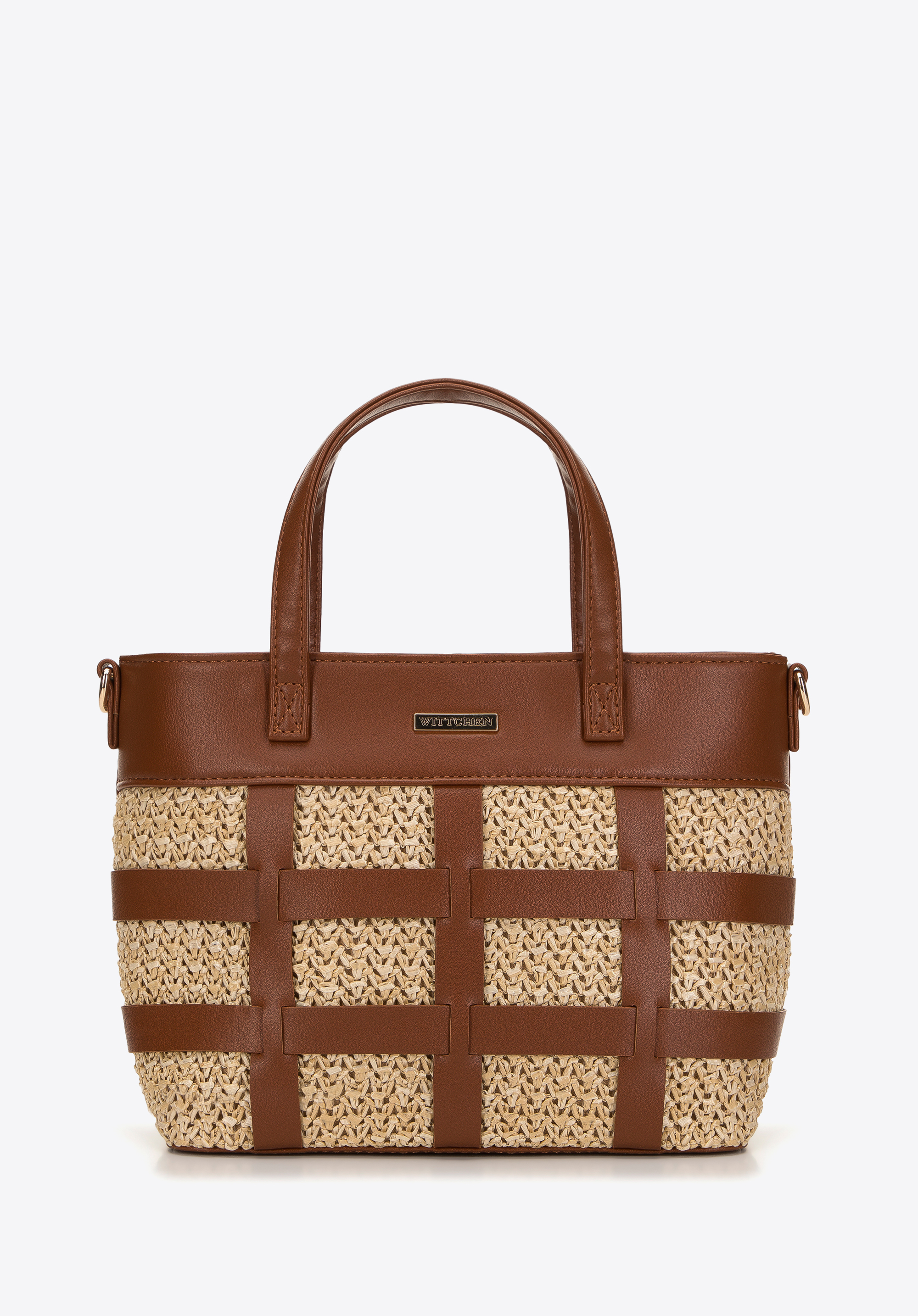 Jasną plecionkę z tworzywa zdobi kratka z pasków z ekoskóry, dodająca całości oryginalnego charakteru. W środku zmieścisz portfel, telefon, małą kosmetyczkę, notesik i kilka drobiazgów – w sam raz na spacer lub kawę z przyjaciółką. Jest
