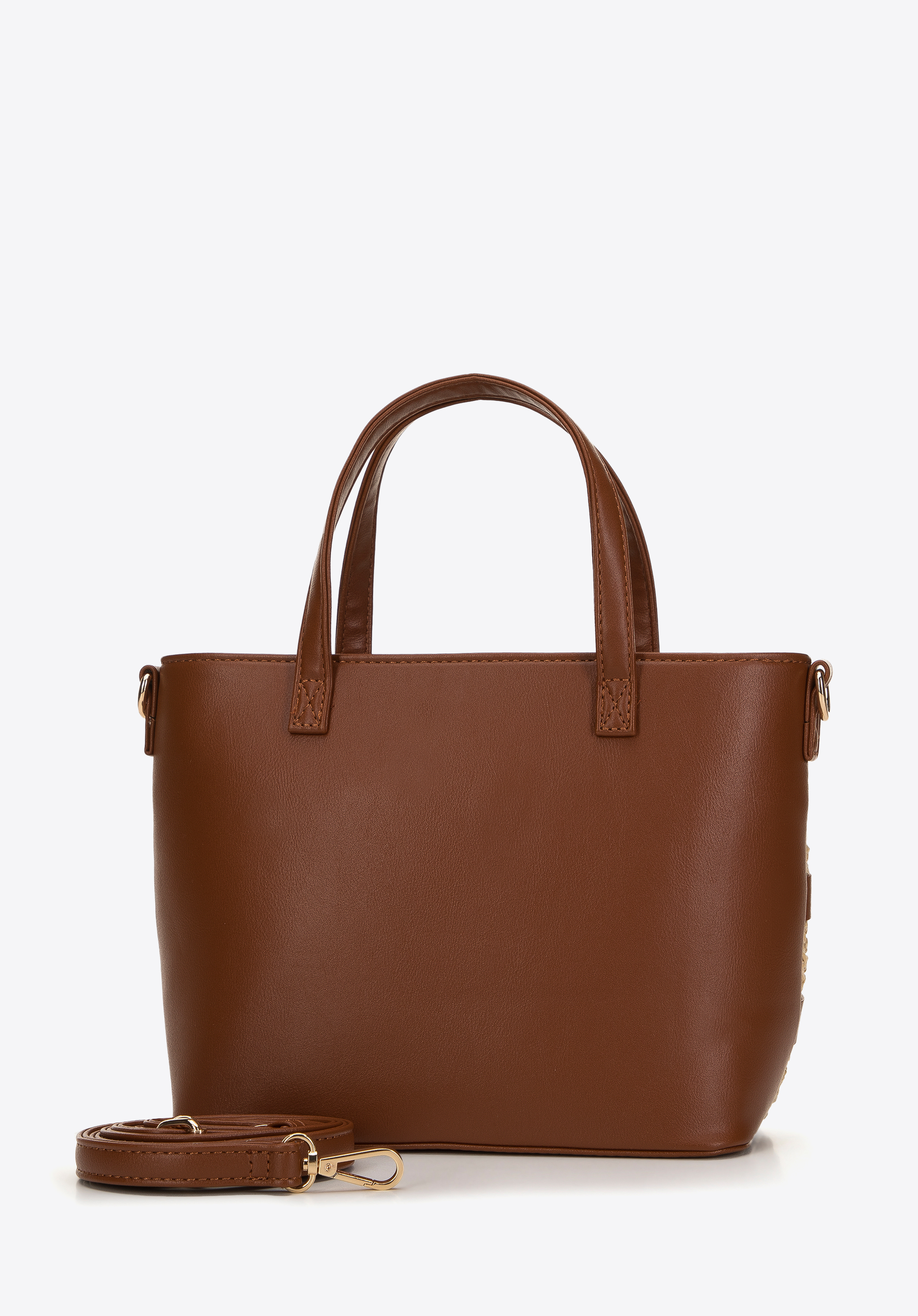 praktyczna i łatwo dopasujesz ją do siebie: możesz nosić ją w ręku lub doczepić regulowany pasek i zawiesić na ramieniu. Połącz ją z ulubioną, rozkloszowaną sukienką i espadrylami lub ulubionych dżinsowych szortów i koszulki, i dodaj im charakteru. Minikuferek z ekoskóry ze wstawką z plecionki wprowadzi wakacyjny klimat do Twojej szafy.