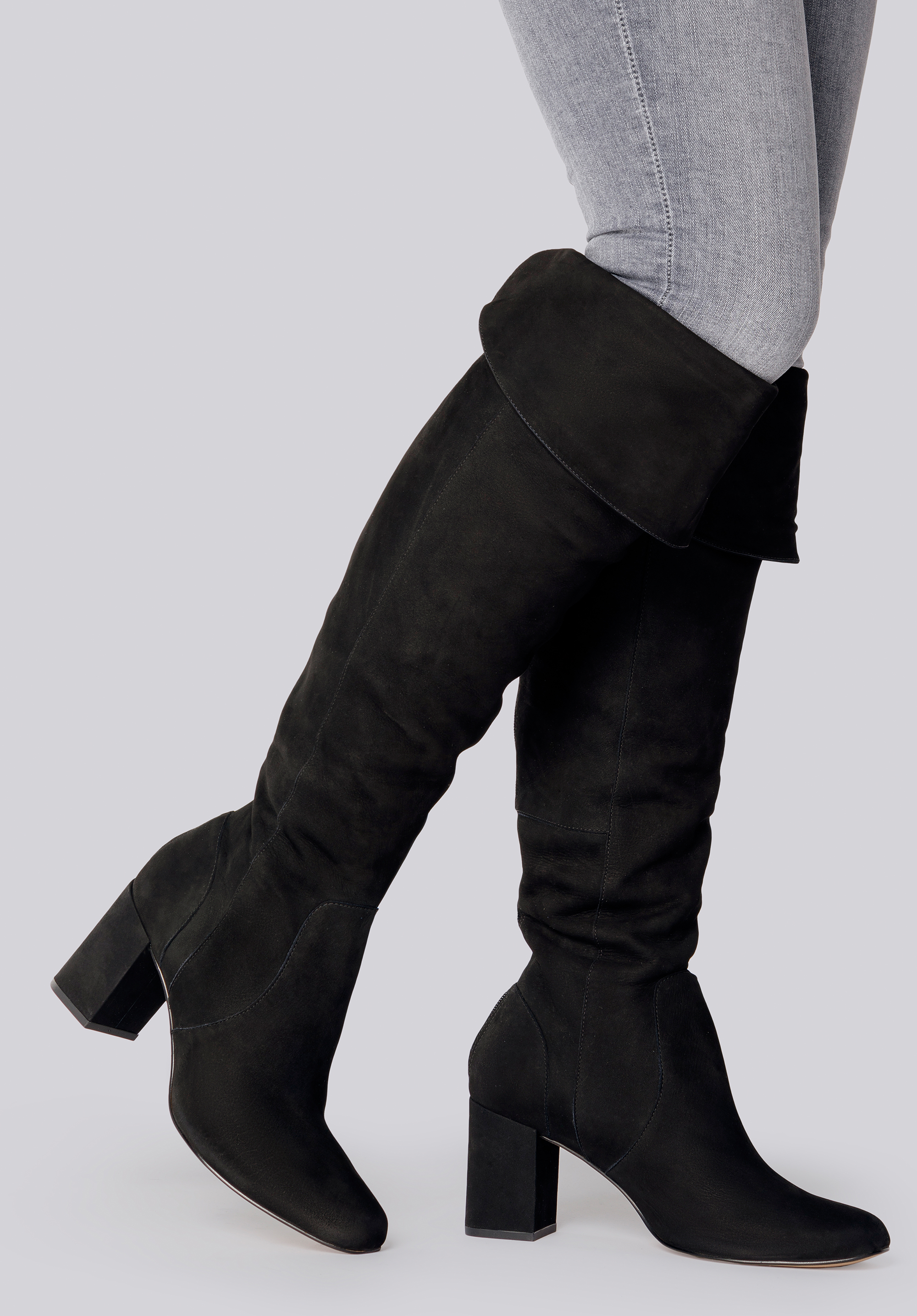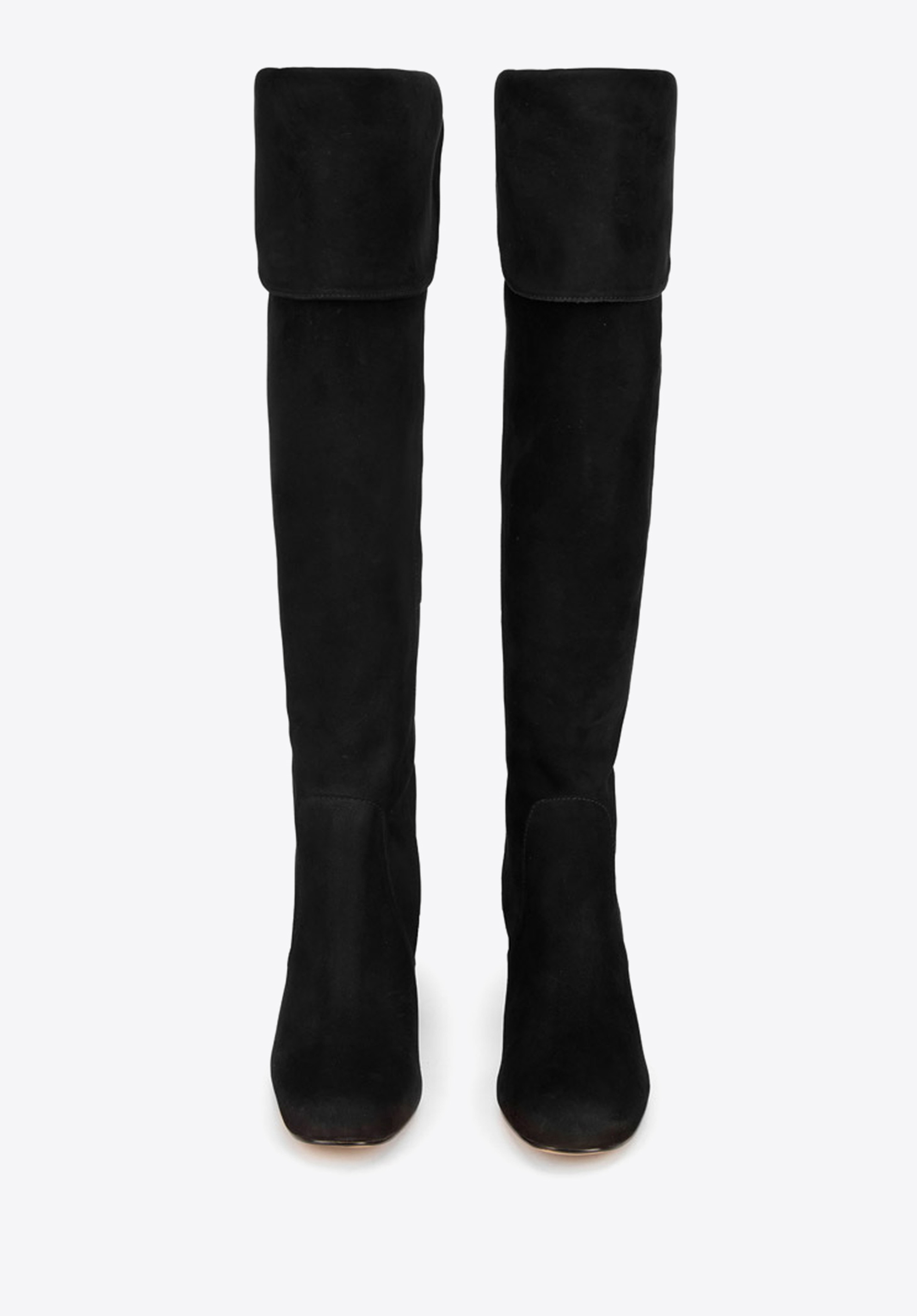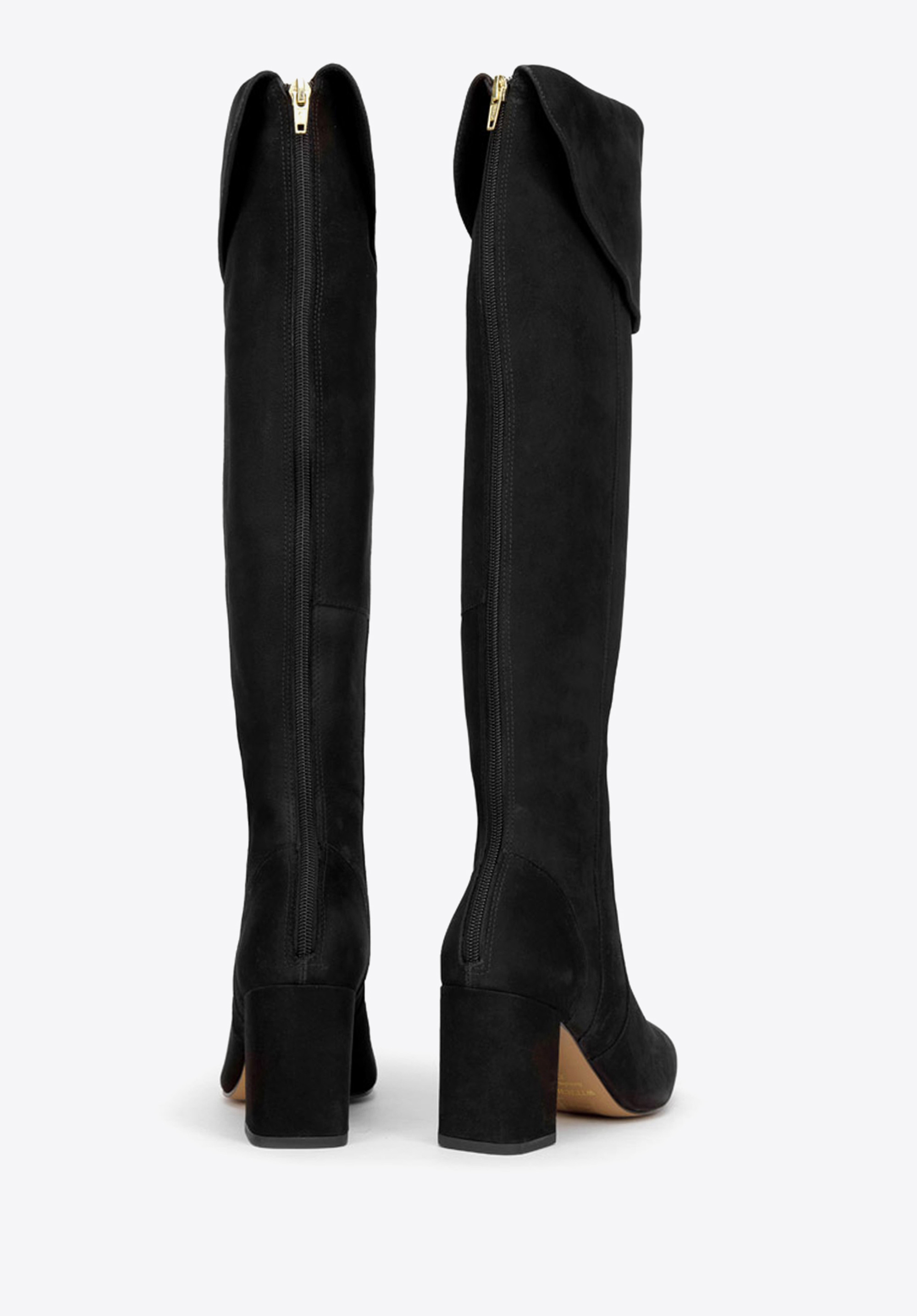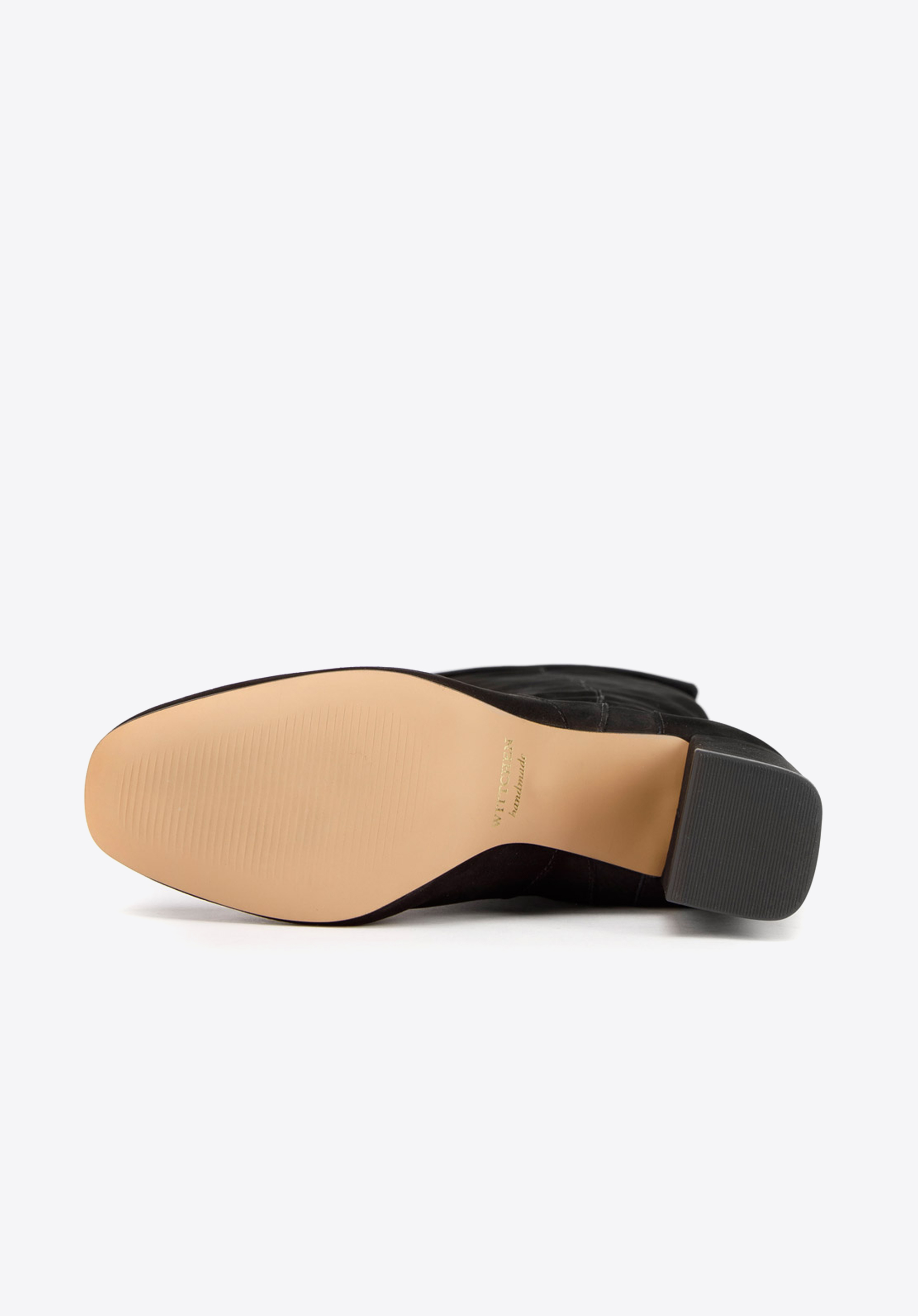 Klasyczne muszkieterki na jesień i zimę uszyte ze skóry zamszowej o welurowym wykończeniu. Mają wywijany mankiet, który po podniesieniu sięga za kolano. Z tyłu znajdziesz suwak na całej długości buta, dzięki któremu włożysz je bez problemu. Te muszkieterki mają smukły kształt z wyprofilowaną piętą i migdałowatym noskiem – nogi wyglądają w nich bardzo zgrabnie. Średniej wysokości obcas-słupek jest stabilny i dobrze się w nim chodzi nawet cały dzień. Muszkieterki zamszowe na słupku to stylowe buty na jesień i łagodną zimę. Dzięki starannemu wykończeniu będą służyły Ci wiele lat.