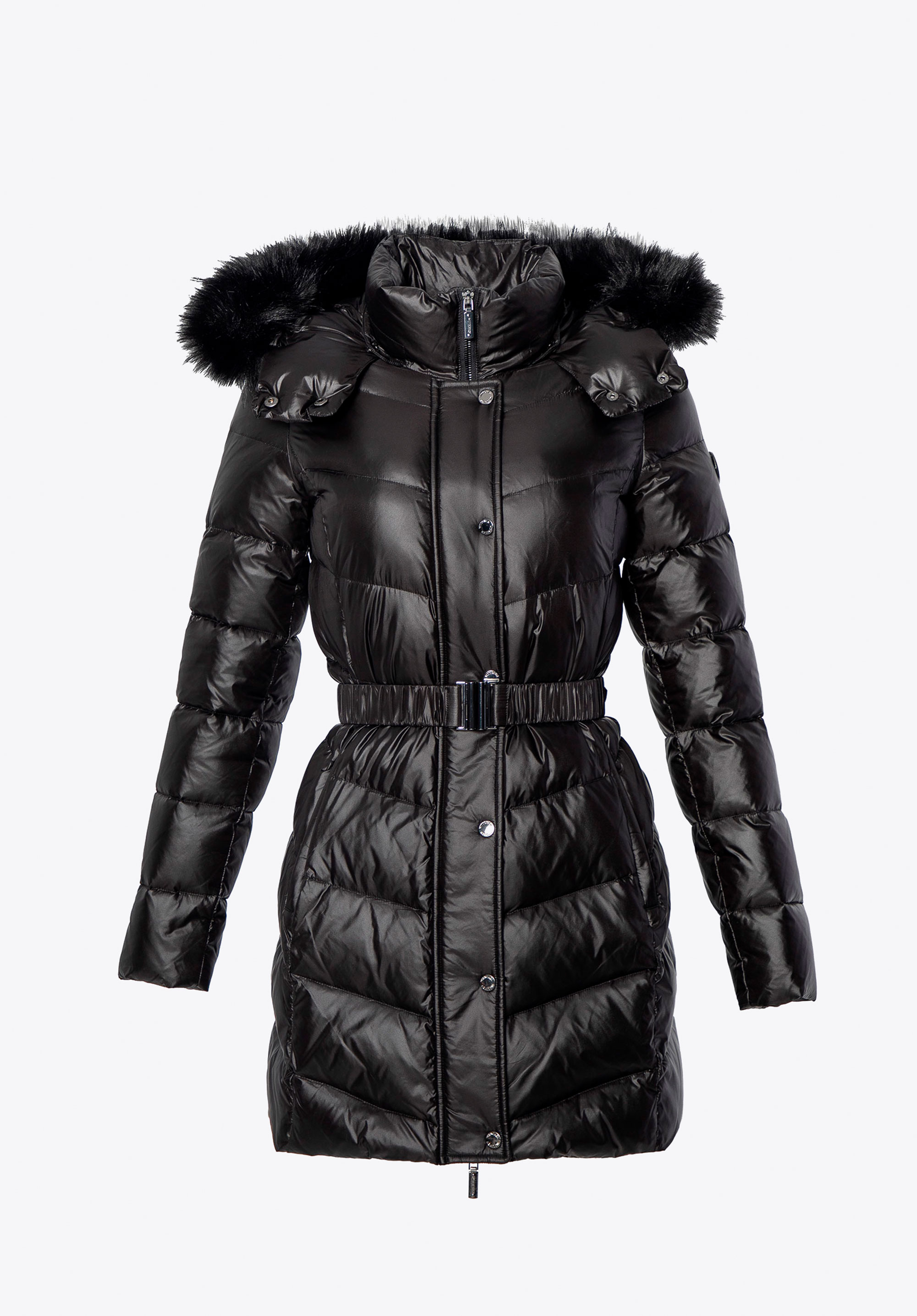 Ta damska kurtka łączy styl i komfort w chłodne dni. Wypełnienie z naturalnego puchu i pierza zapewnia doskonałą izolację, a pikowany fason pięknie układa się na sylwetce. Wytrzymały nylon chroni przed wiatrem i wilgocią, a lekka podszewka gwarantuje wygodę noszenia. Kurtka ma praktyczne detale – zamek i zatrzaski, dwie kieszenie na zamek, pasek w talii podkreślający kobiecą sylwetkę oraz odpinany kaptur ze sztucznym futerkiem, idealny do różnych okazji.