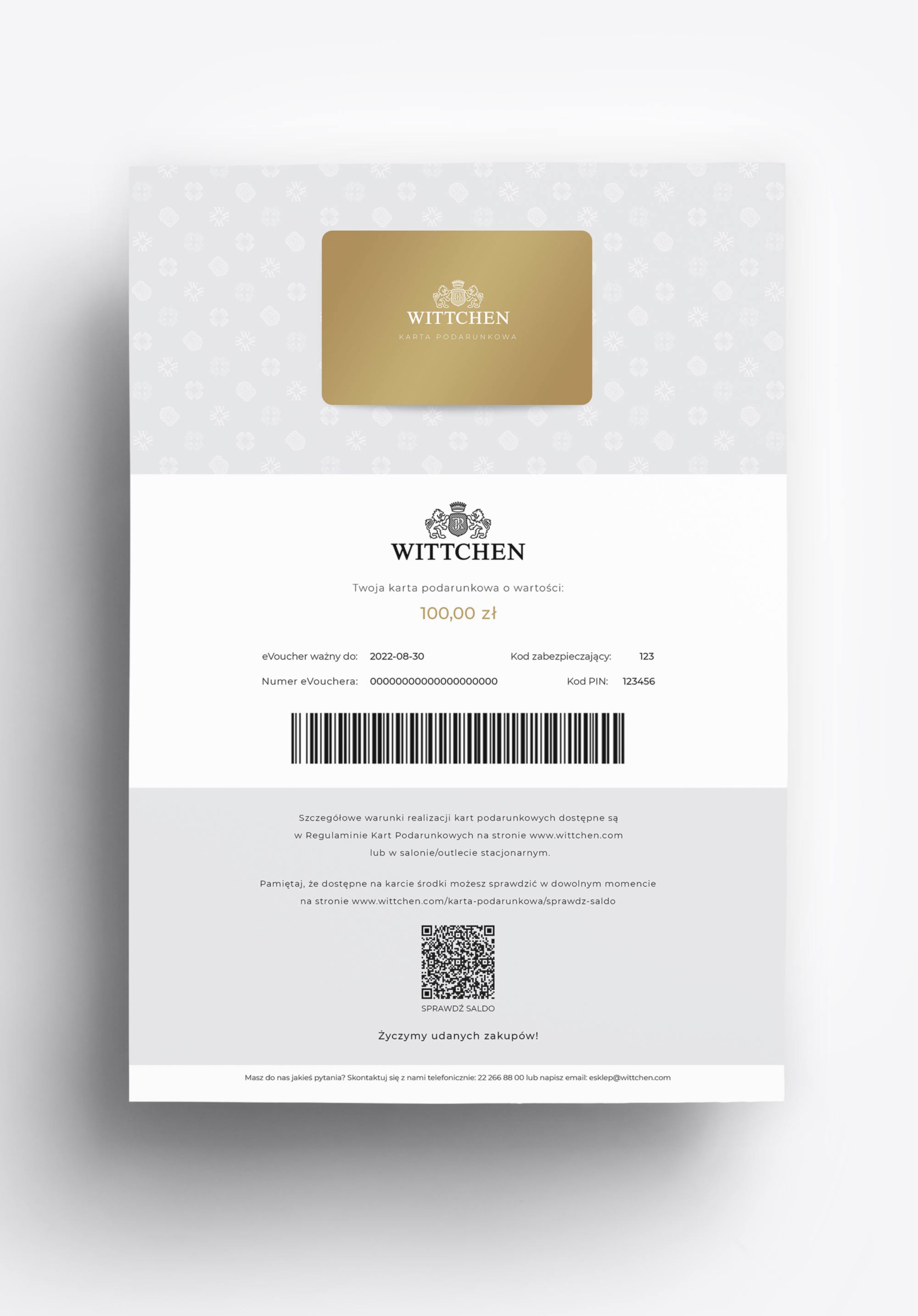 - Szybko i wygodnie na e-mail - Wybierz wartość, podaj adres e-mail i opłać zamówienie – to wszystko! Kartę podarunkową online otrzymasz w pliku PDF, a obdarowana osoba wykorzysta ją na www.wittchen.com lub w salonach stacjonarnych w całej Polsce.