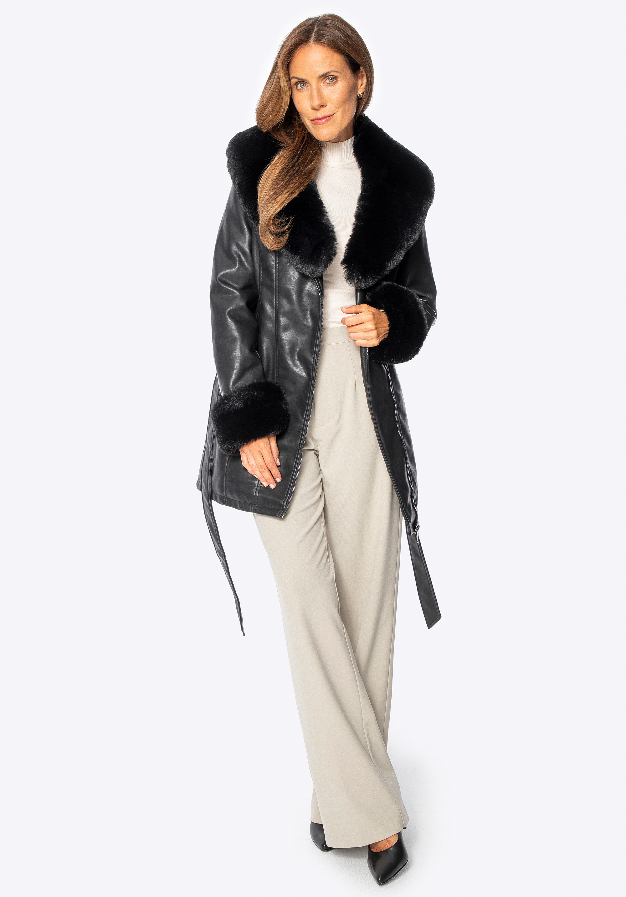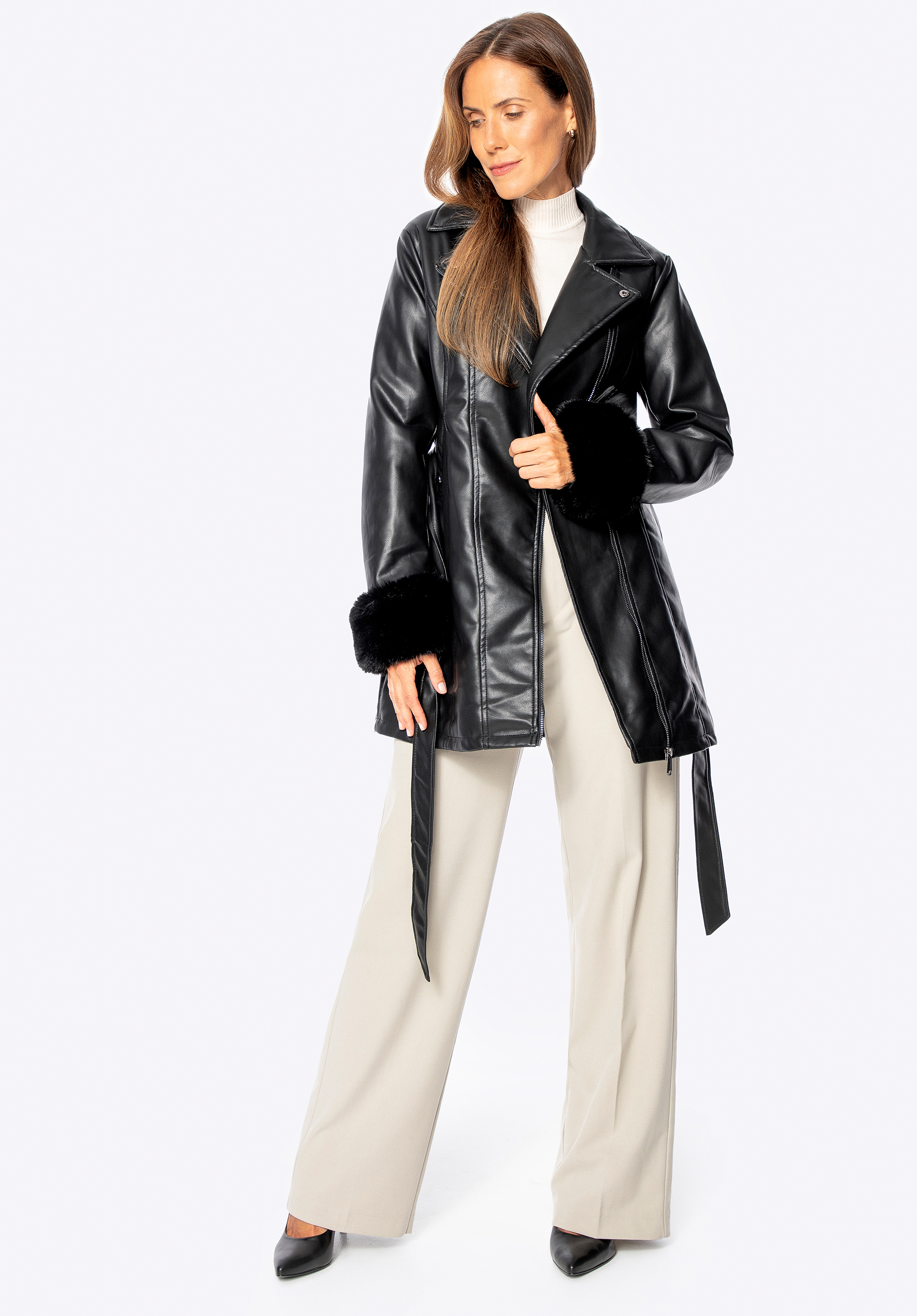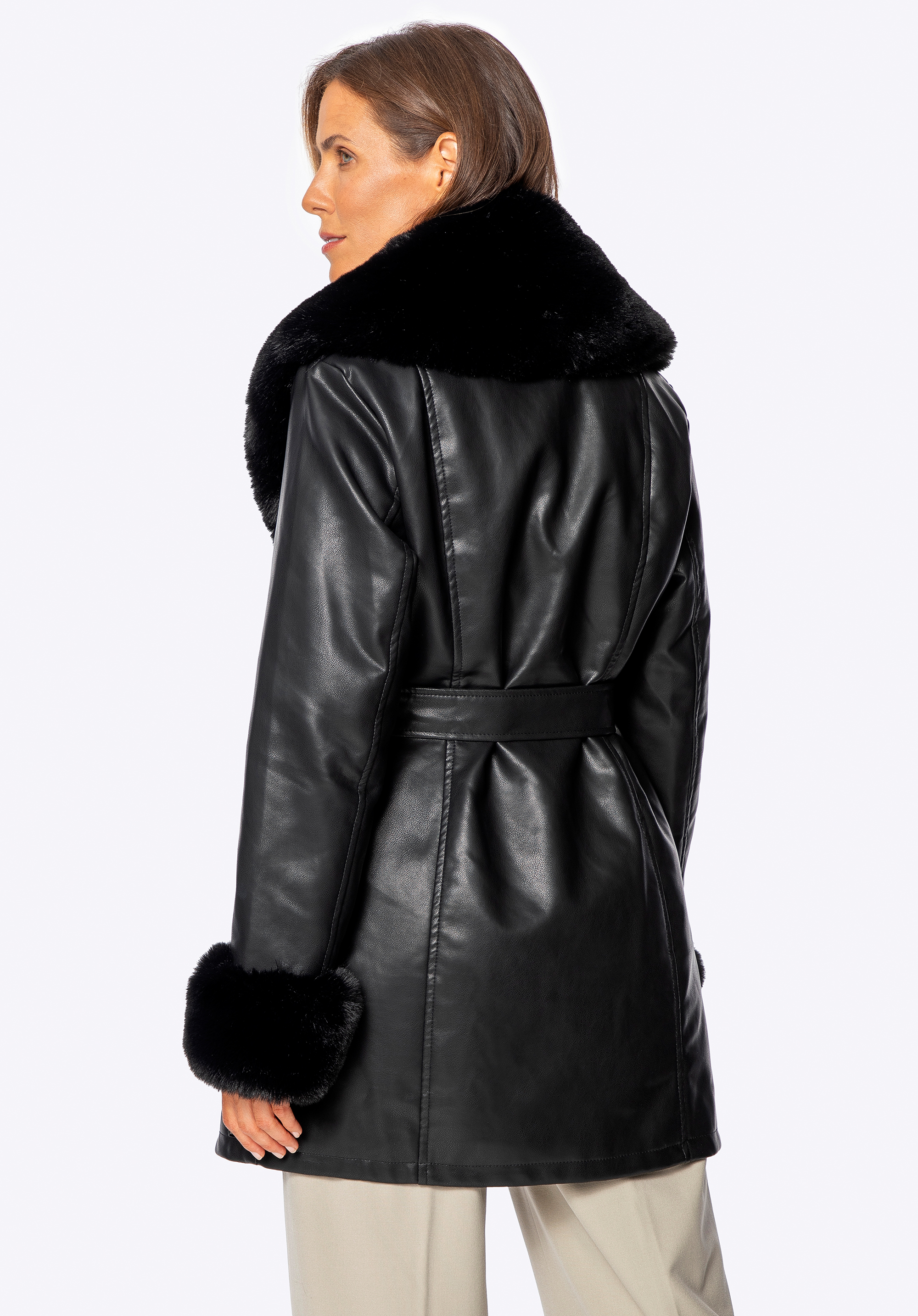 Elegancja z pazurem – płaszcz z ekoskóry z futerkiem
