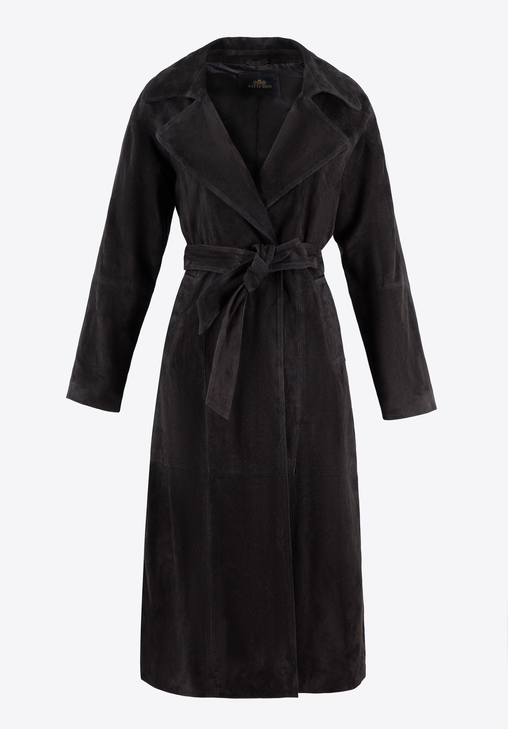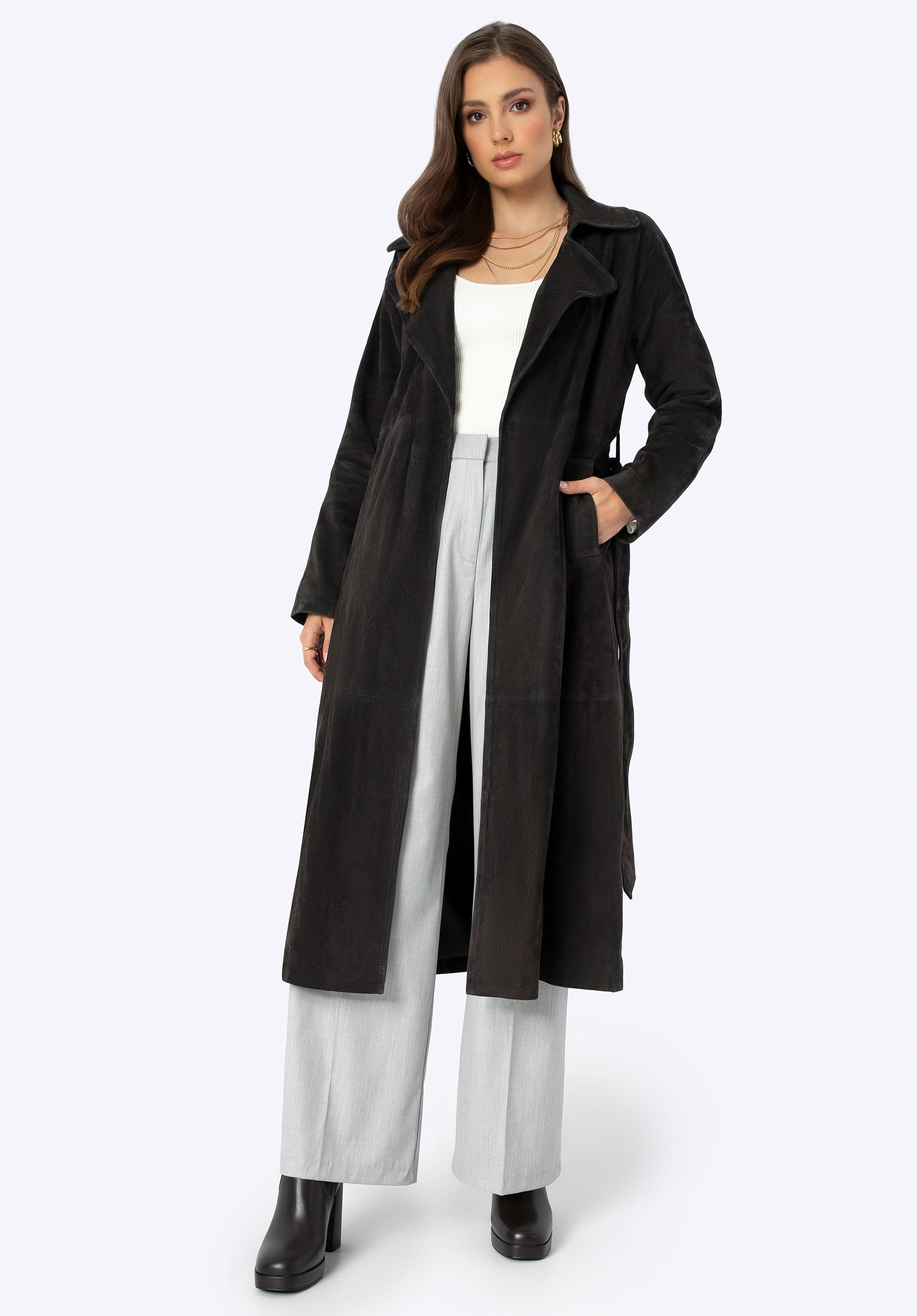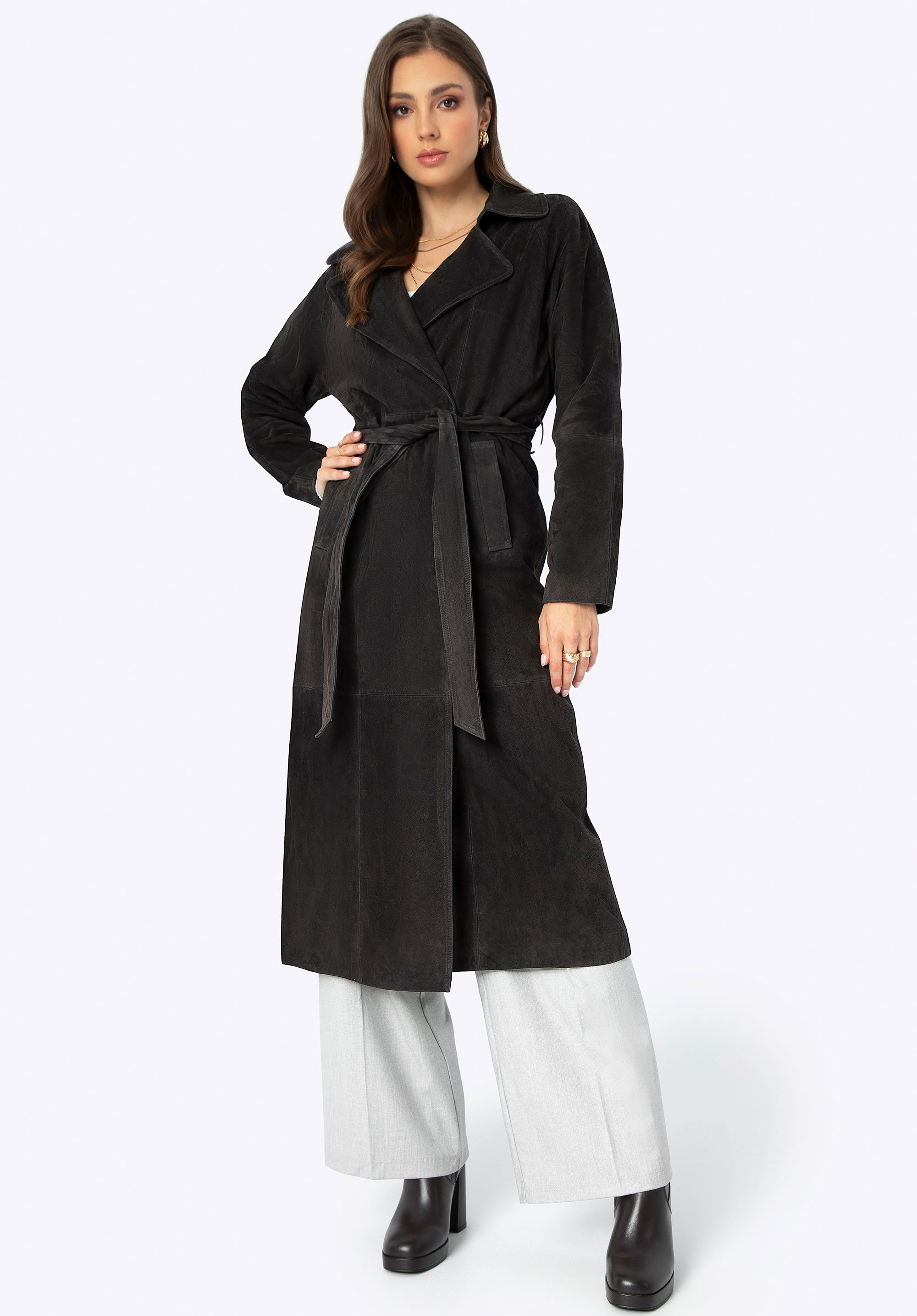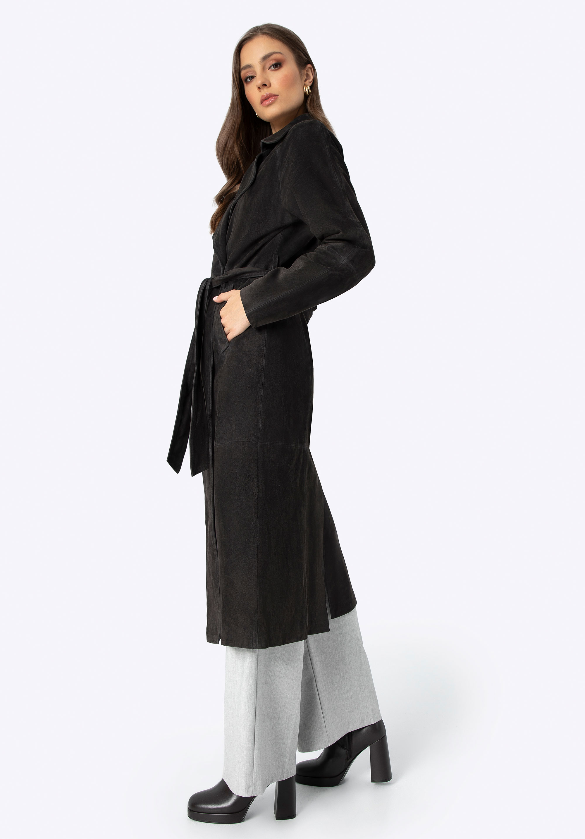 Płaszcz damski zamszowy ze skóry owczej ciemny brąz