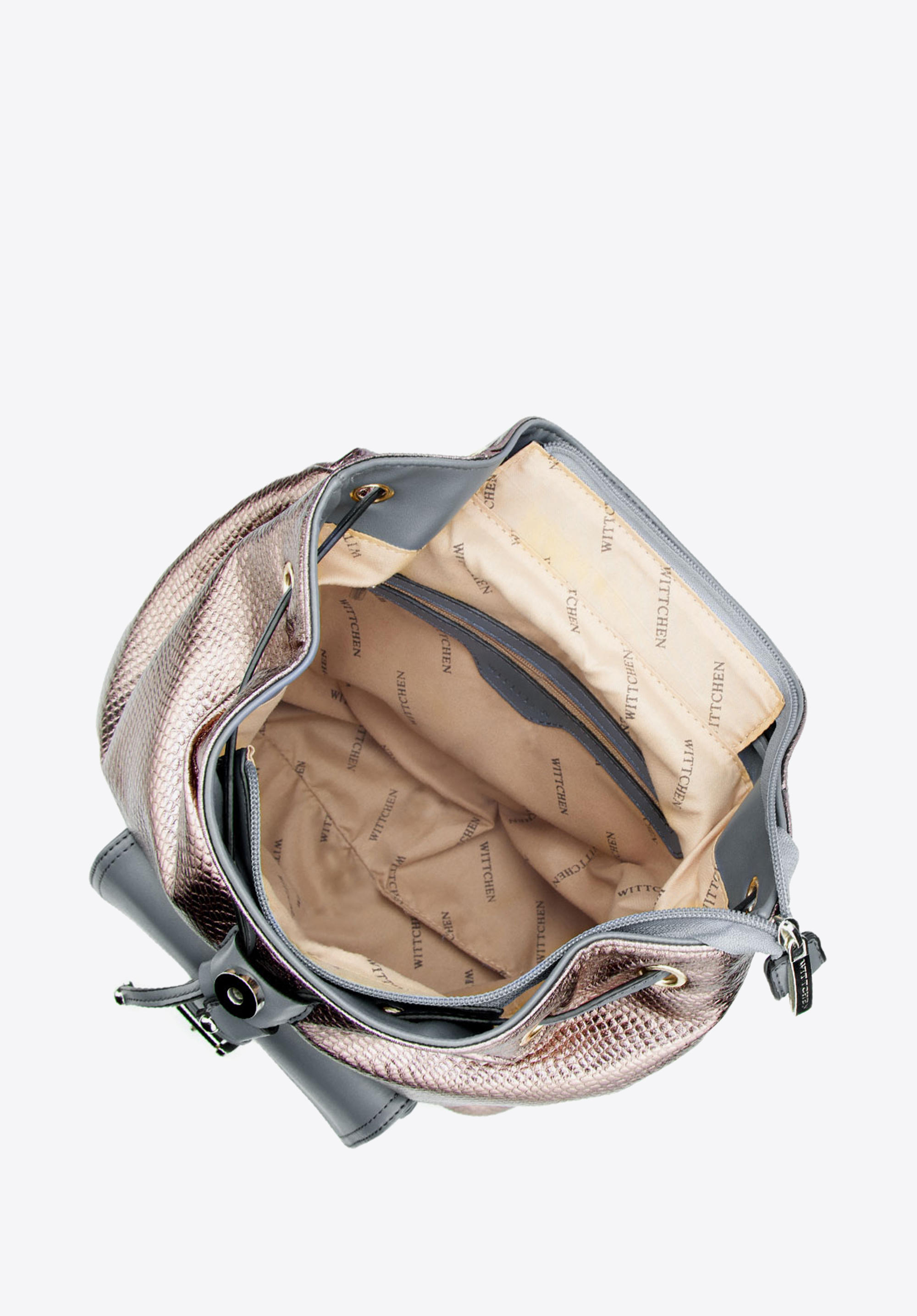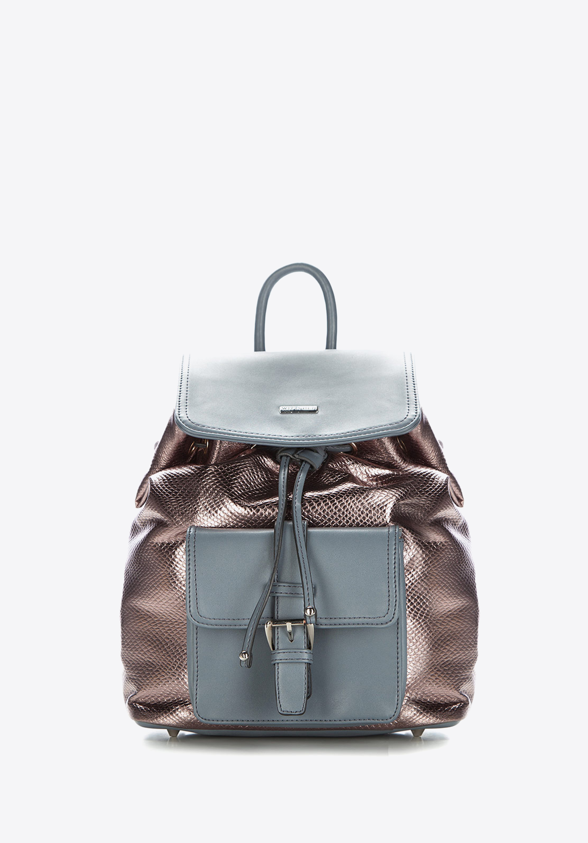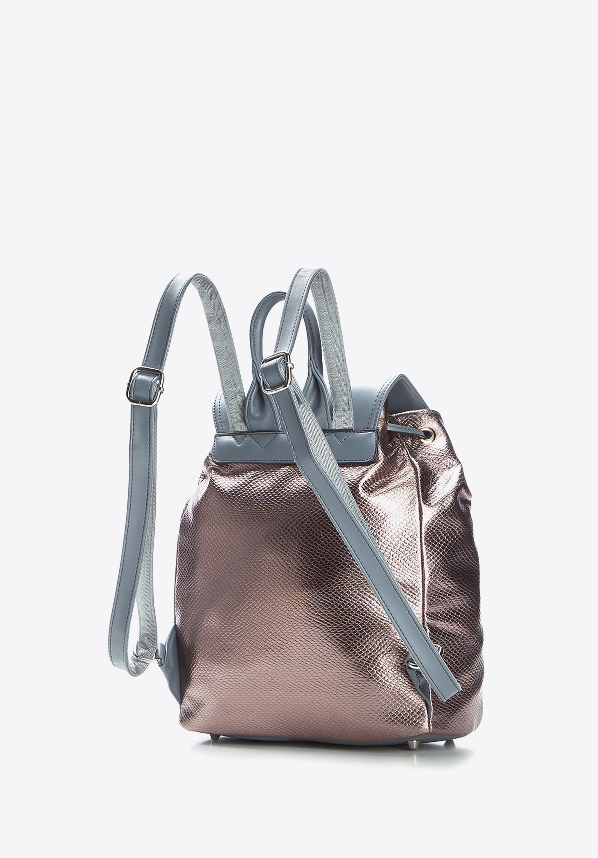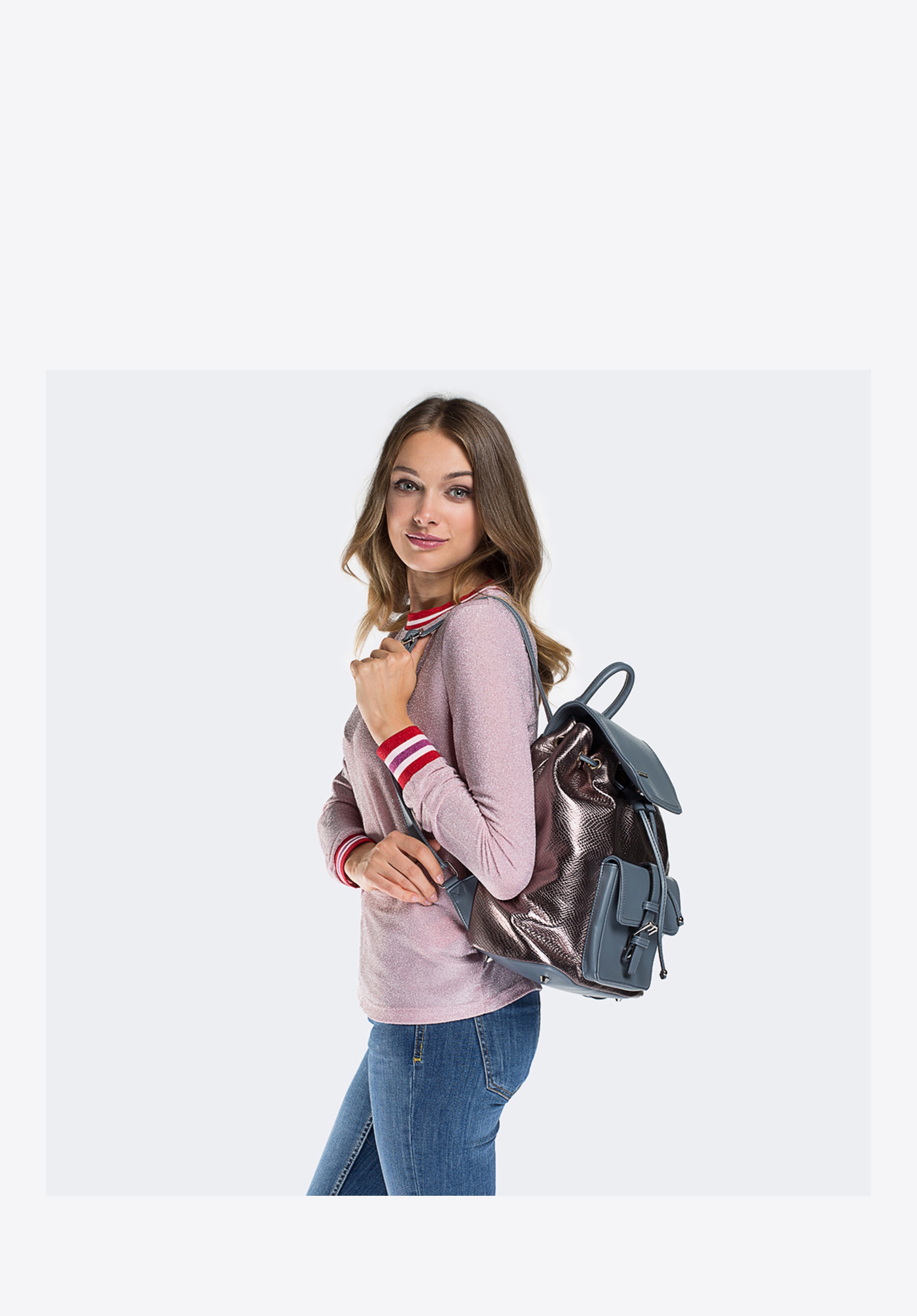 motywem zwierzęcym znakomicie wygląda na błyszczącym materiale. Ciekawym rozwiązaniem w modelu jest zastosowanie innej faktury w obrębie klapy, przedniej kieszeni, pasków, uchwytu, ściągaczy, a także podstawy.