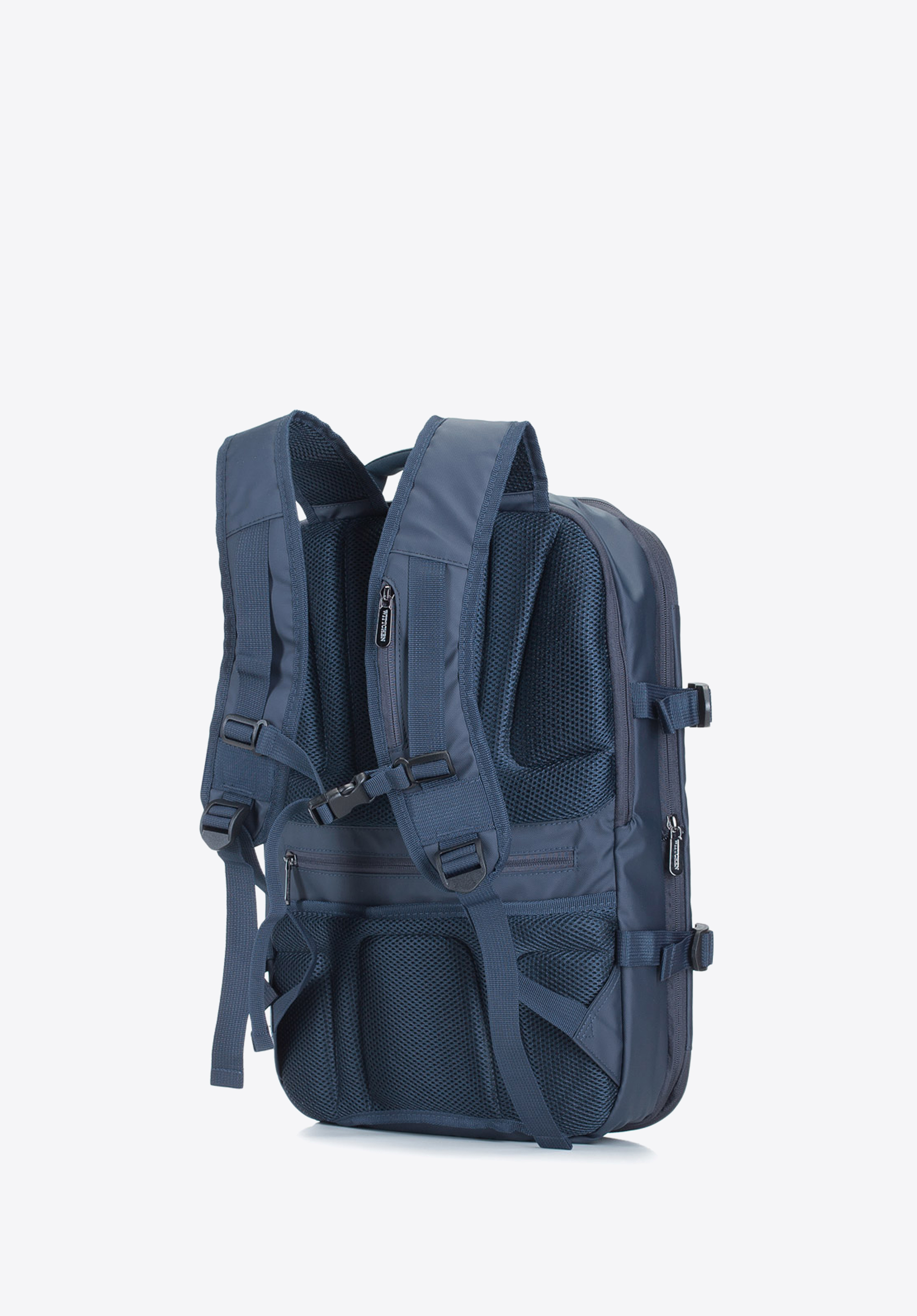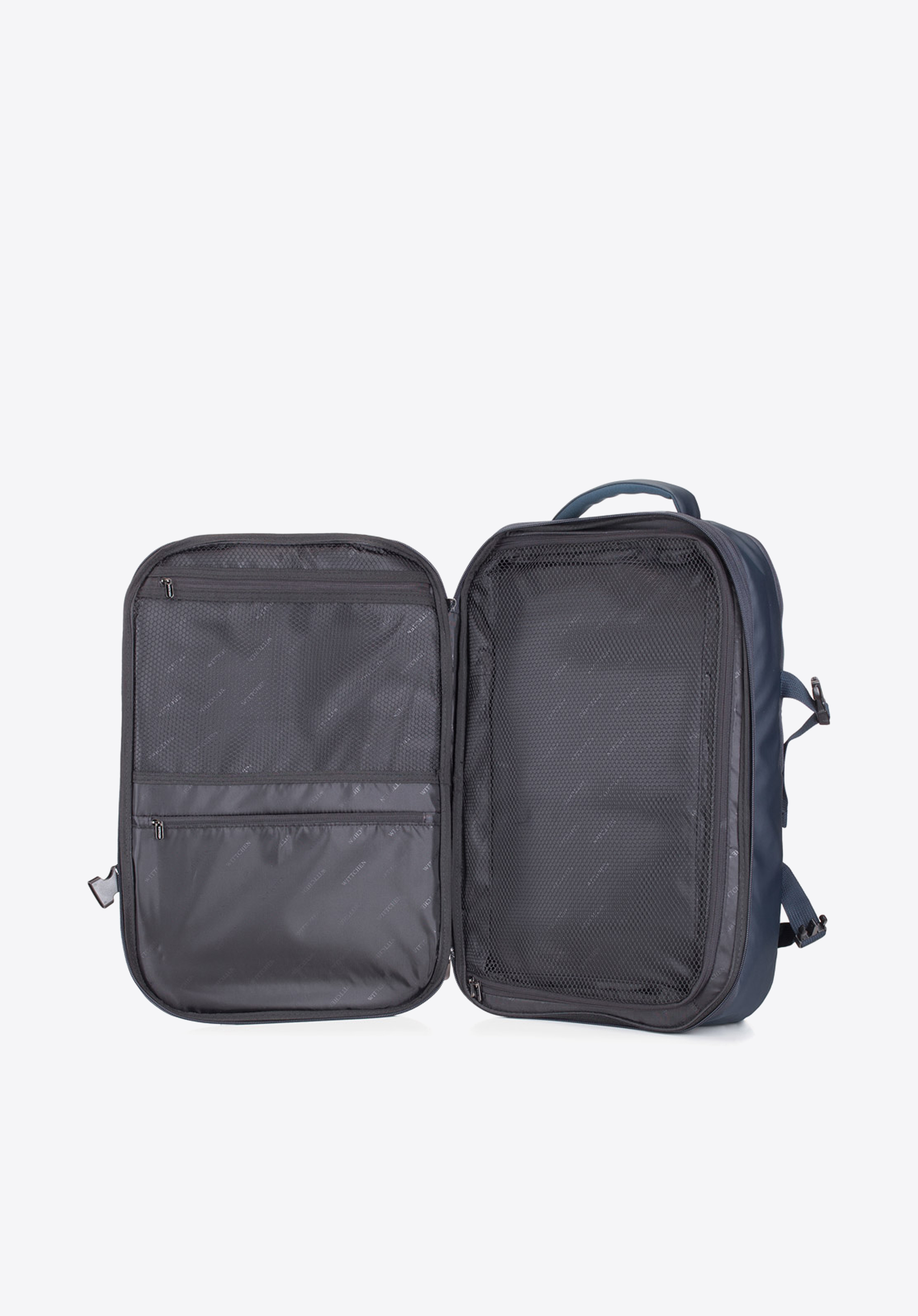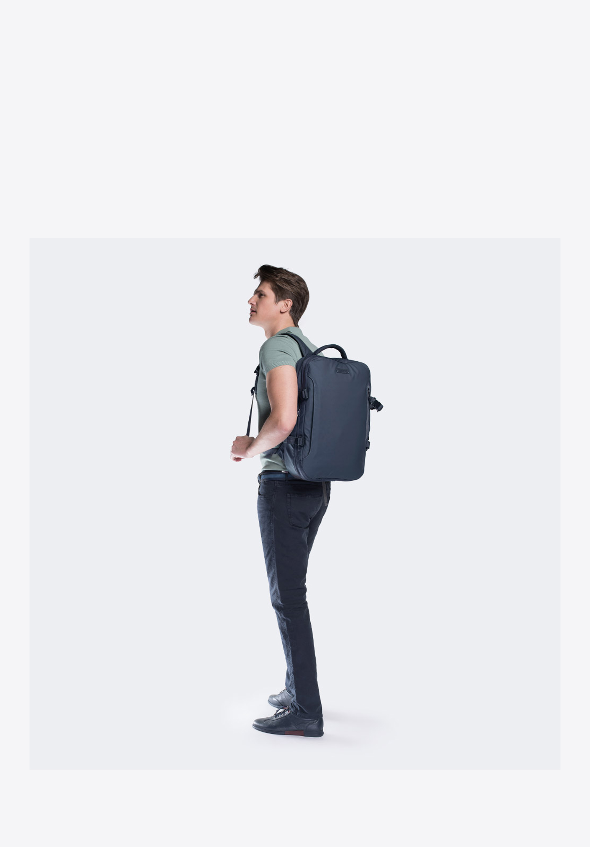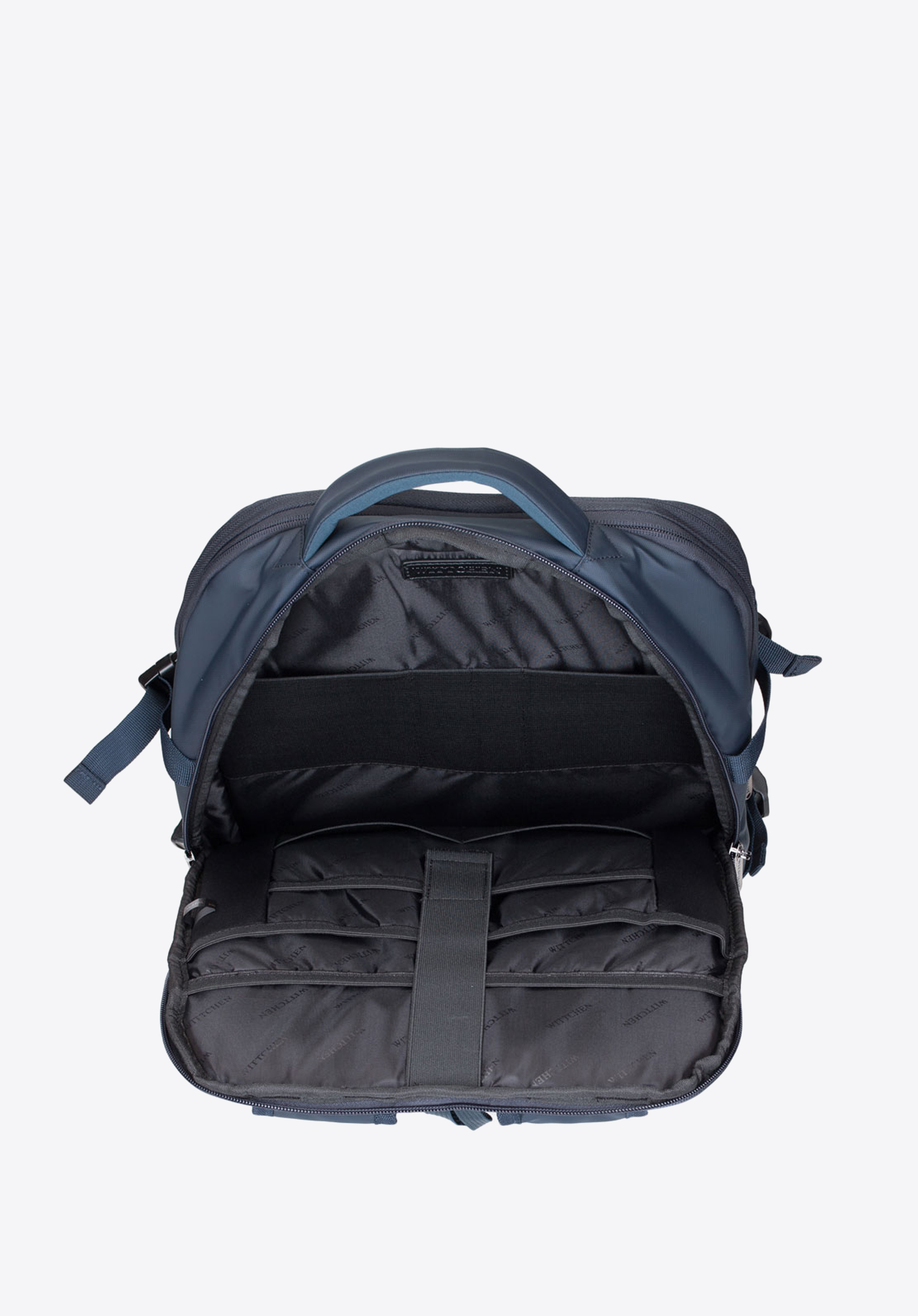 Unikatowy plecak na laptopa, stworzony z subtelnie fakturowanej skóry ekologicznej, pozwala na przechowanie sporej ilości bagażu i akcesoriów. Dla optymalnej ochrony zawartości, konstrukcję plecaka zabezpieczają regulowane paski zapinane na szelki. Prosta forma posiada wiele funkcjonalnych udogodnień. Z tyłu miękkie poduszki, pokryte siatką, pełnią funkcję podpórki pod plecy, która dodatkowo zapewni skórze oddychalność. Plecak występuje w trzech uniwersalnych kolorach: granatowym, szarym oraz czarnym.