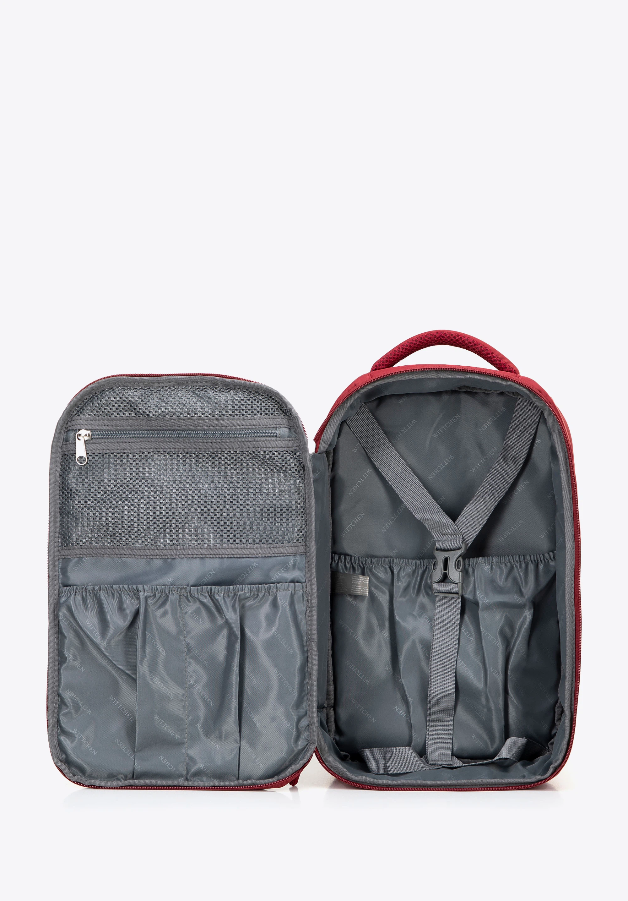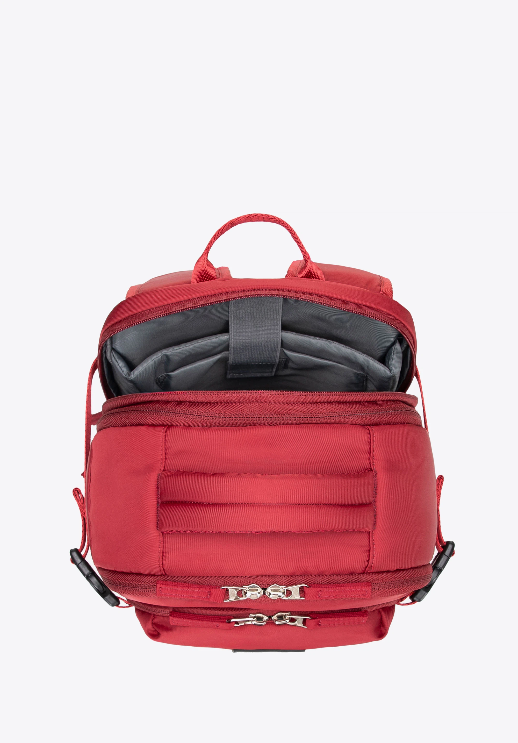 - Komora główna: Wnętrze głównej komory, otwierającej się jak walizka, posiada regulowane pasy, kieszeń na gumkę, siatkową kieszeń na zamek oraz dwie funkcjonalne przegródki.