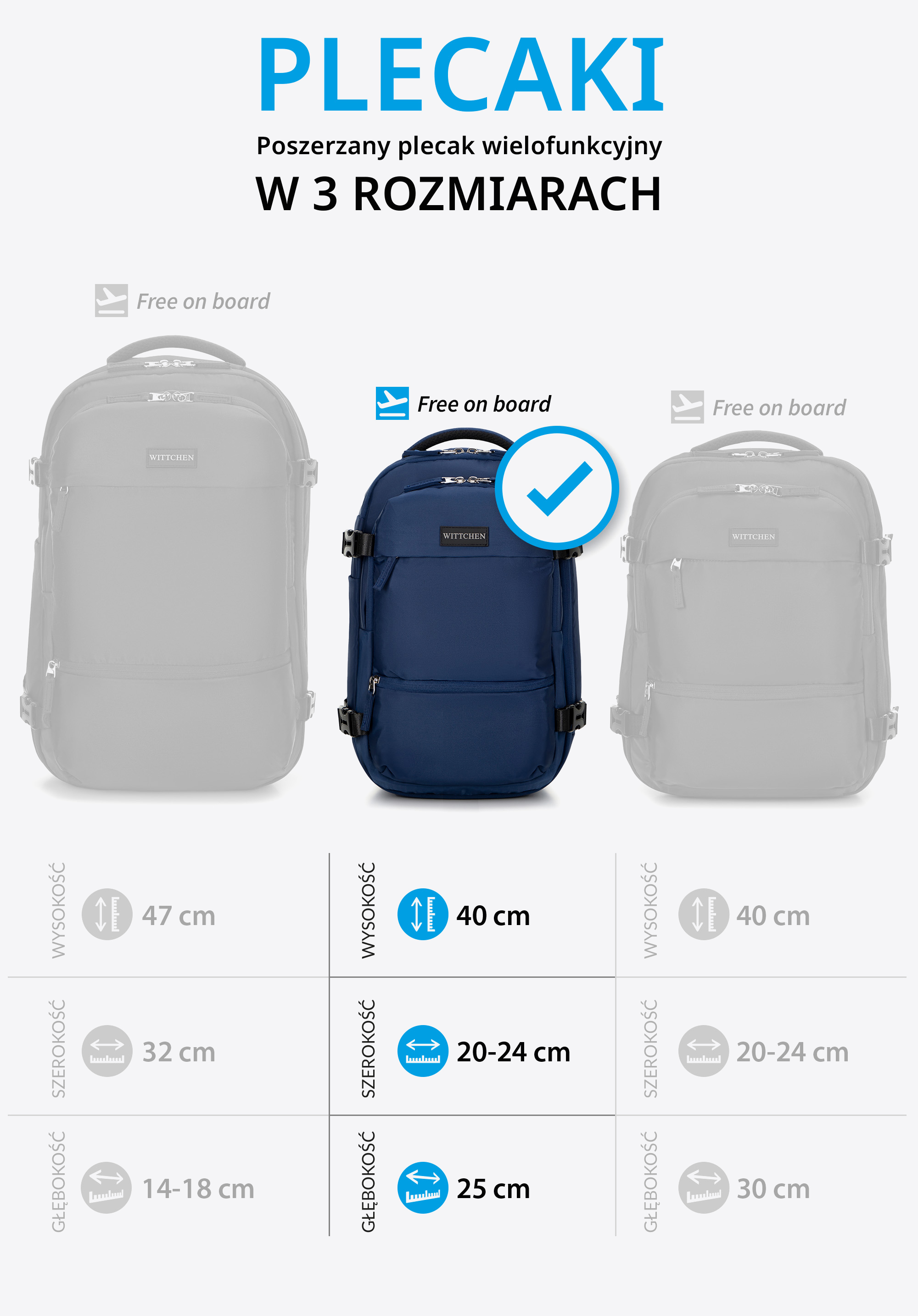 - Kompaktowy rozmiar (40 × 25 × 20 cm) sprawia, że plecak idealnie pasuje do wymogów bagażu podręcznego popularnych liniach lotniczych, w tym Ryanair. Wymiary odnoszą się do standardowej wersji, bez poszerzenia.