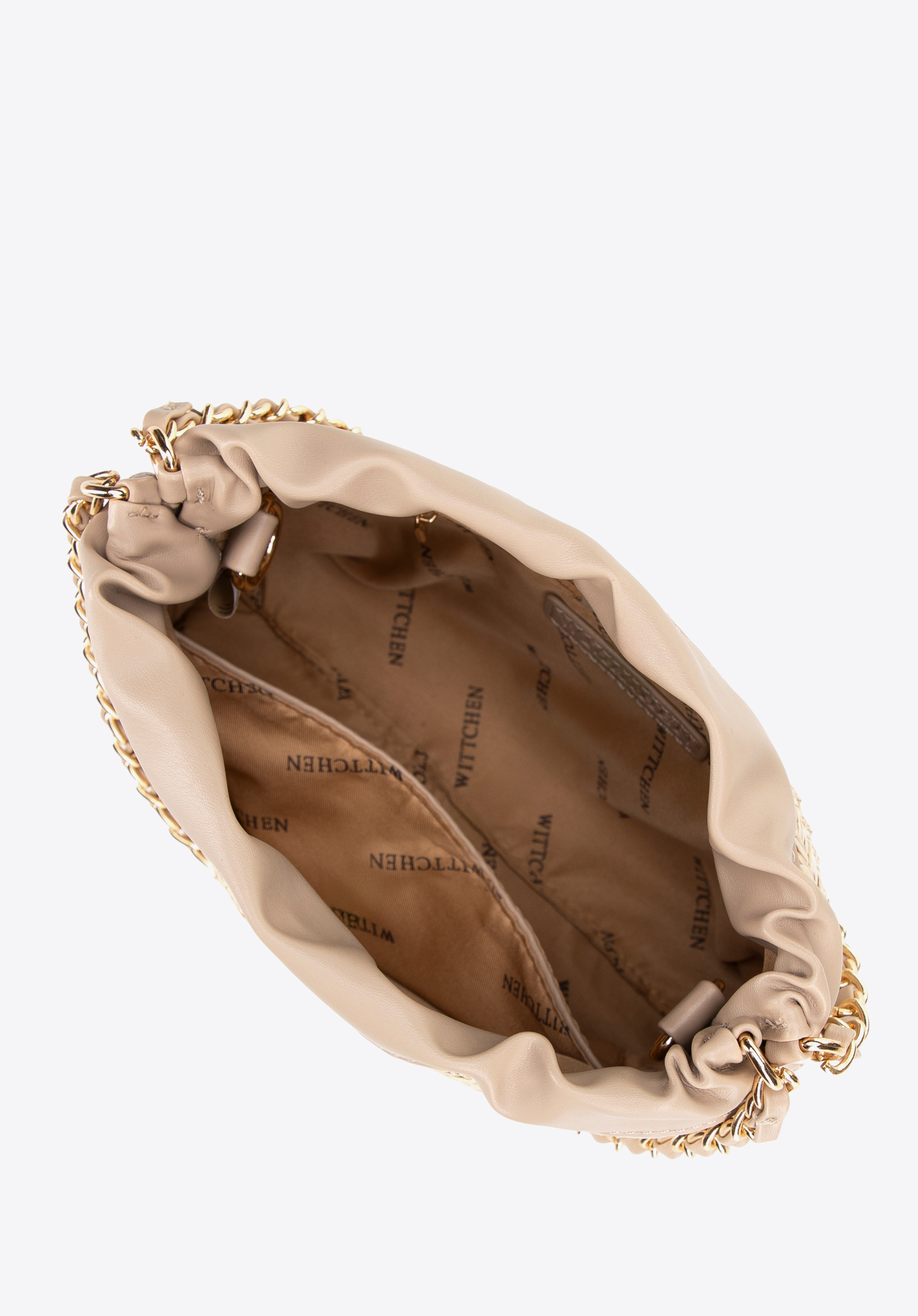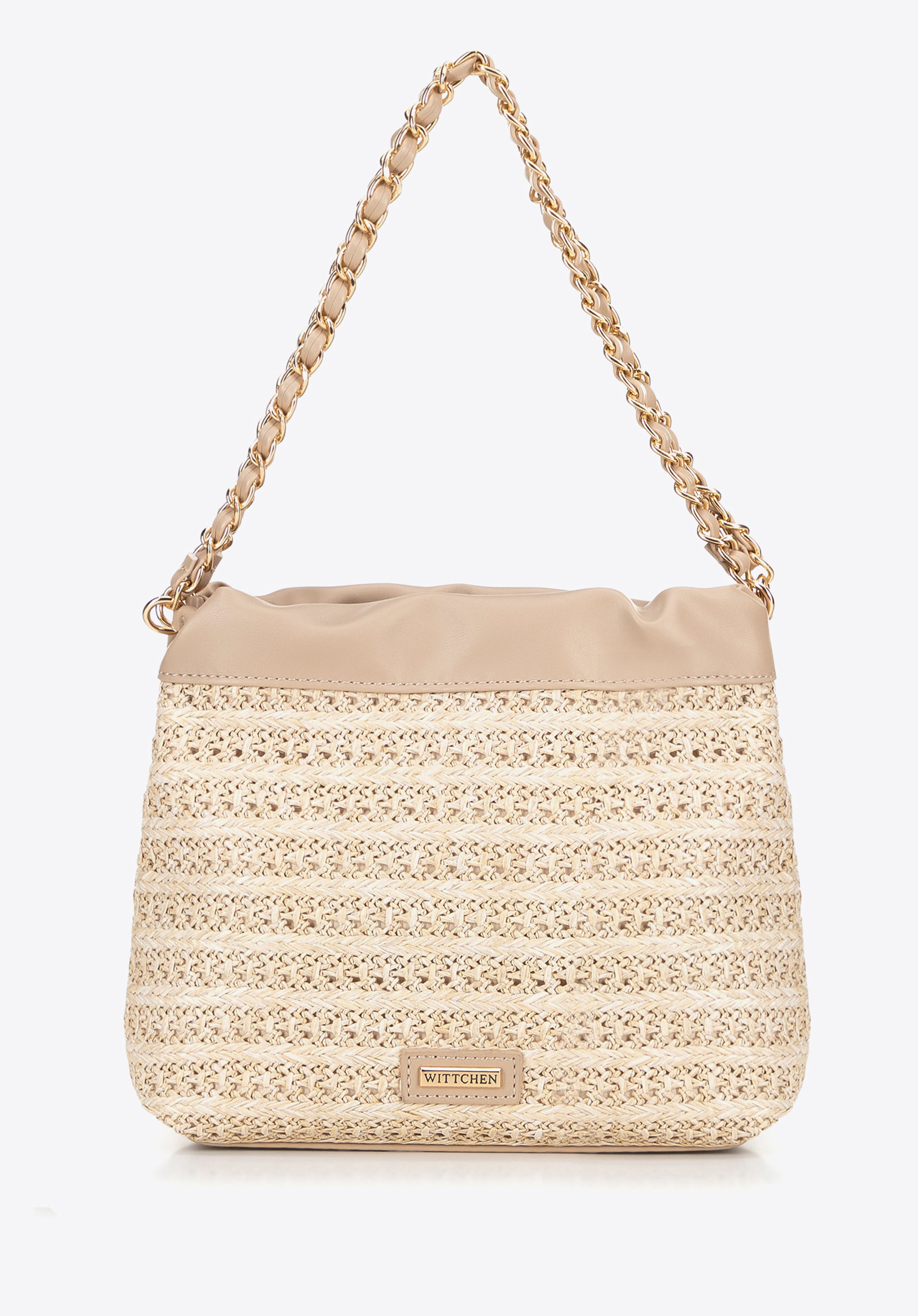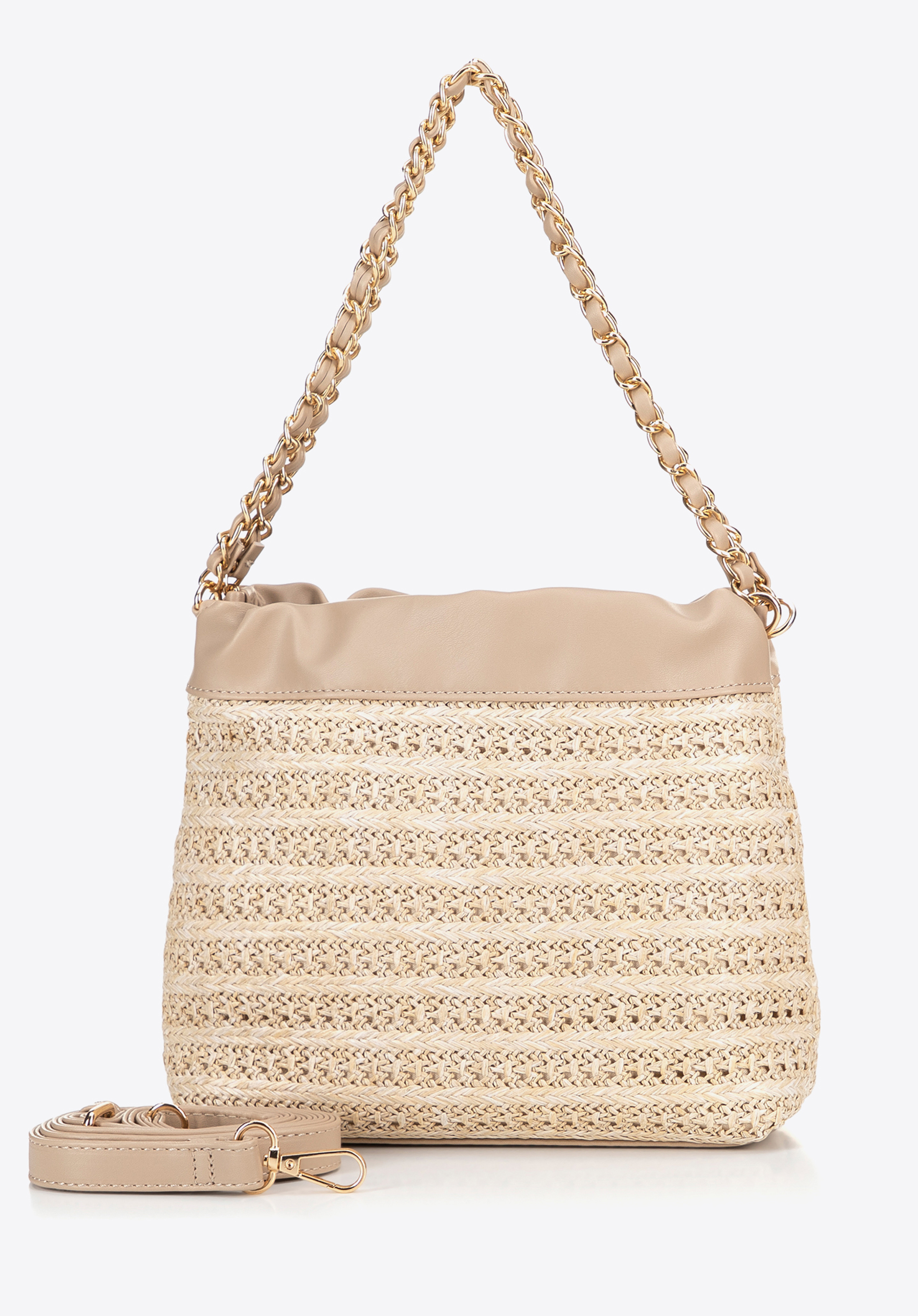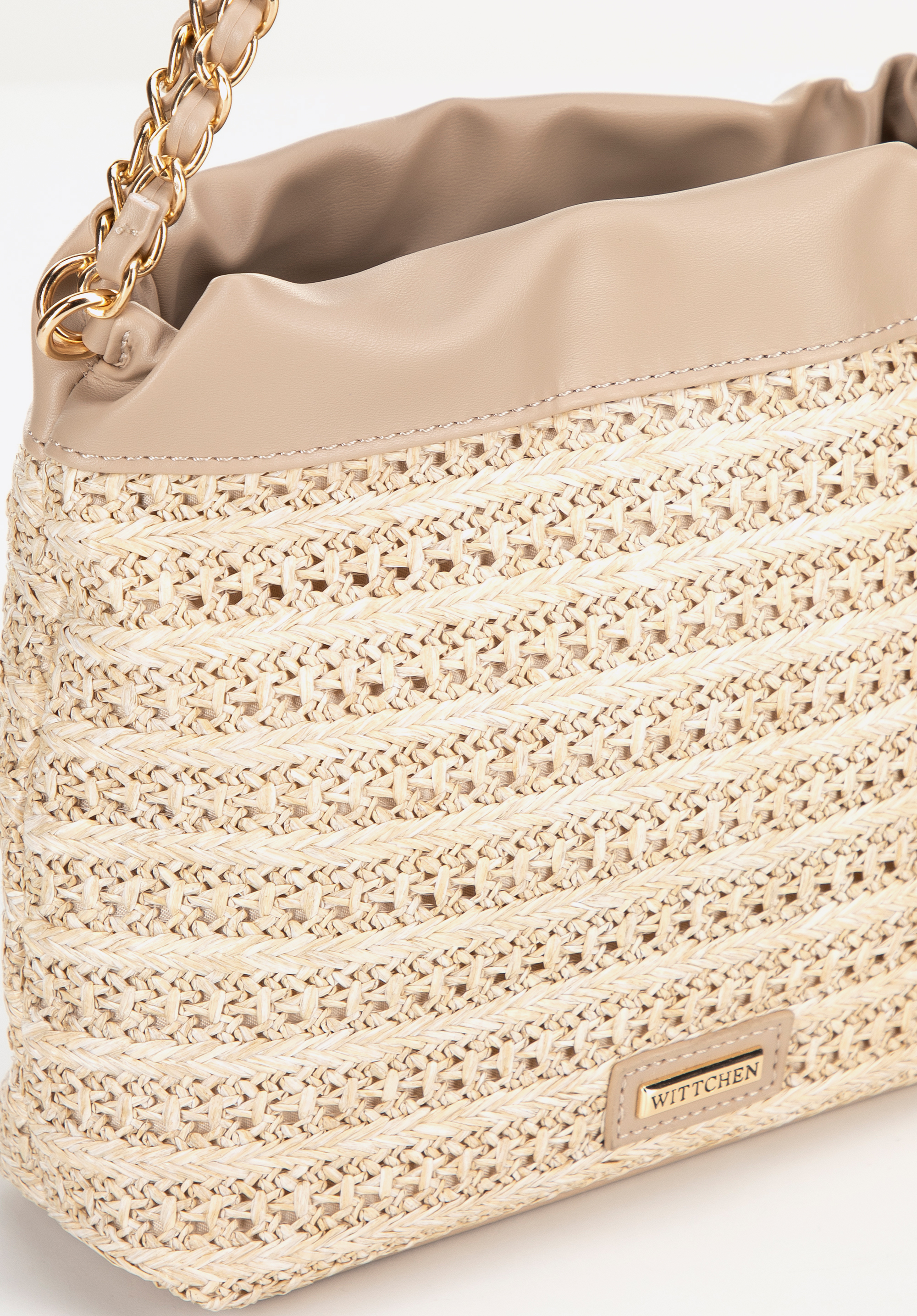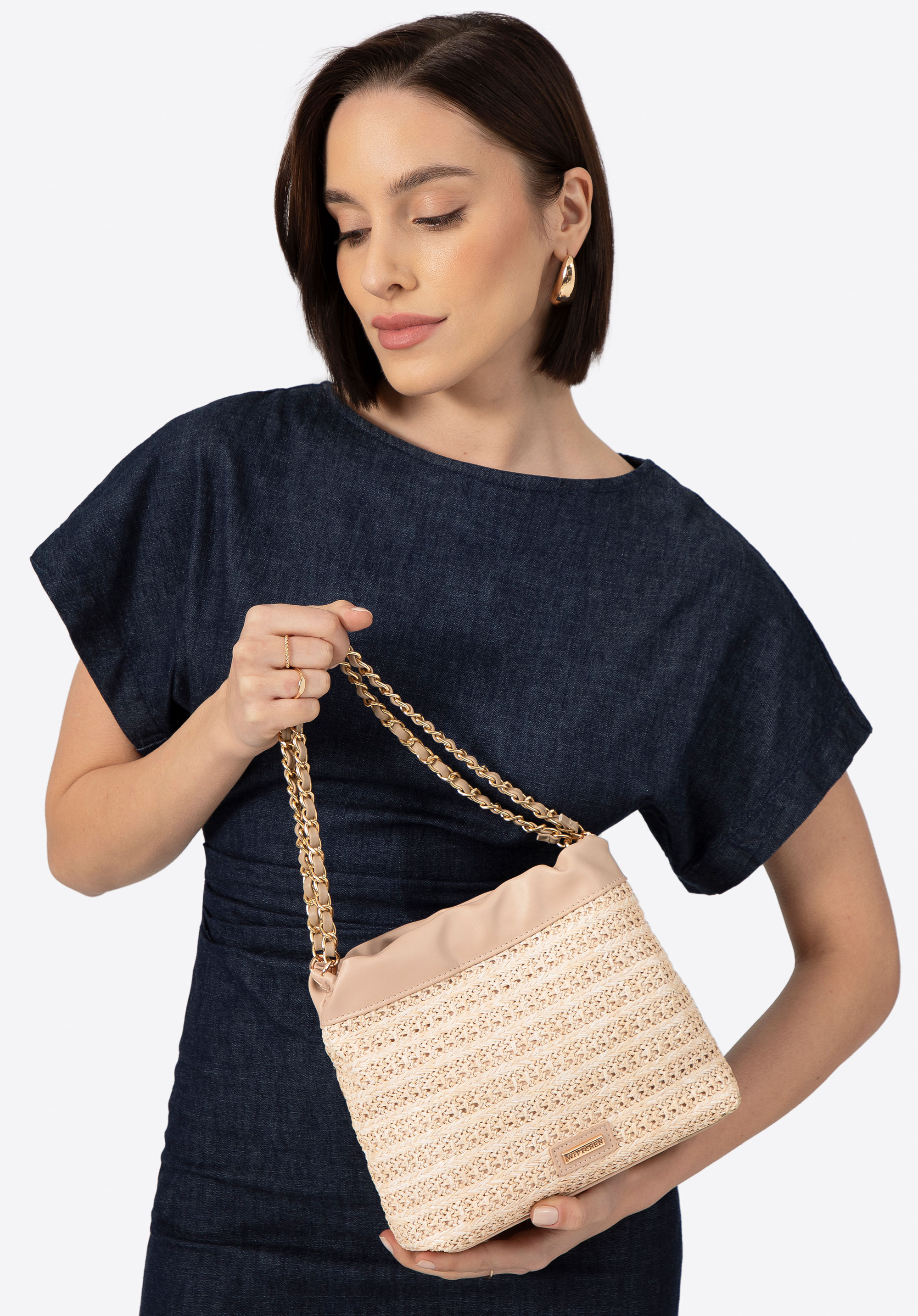 Elegancka torebka crossbody wykonana z połączenia polipropylenu (plecionka) oraz poliuretanu (ekoskóra) łączy w sobie funkcjonalność i nowoczesny design. Zamek magnetyczny zapewnia łatwy dostęp do wnętrza, które skrywa dwie przestronne kieszenie, w tym jedną zamykaną na zamek, idealne do przechowywania drobnych przedmiotów. Przeplatany łańcuszek dodaje całości subtelnej elegancji, a regulowany pasek zapewnia komfort noszenia.