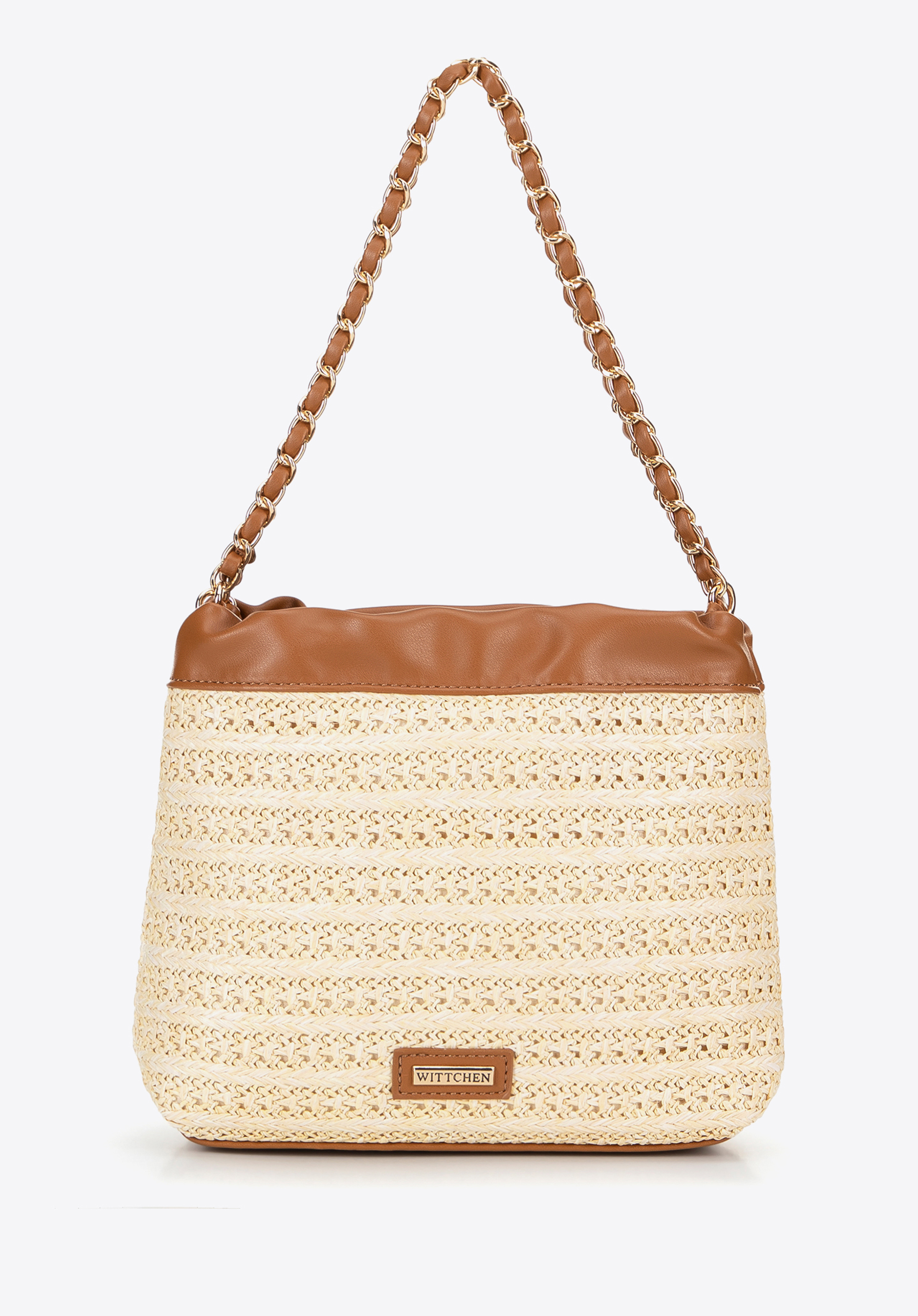 Elegancka torebka crossbody wykonana z połączenia polipropylenu (plecionka) oraz poliuretanu (ekoskóra) łączy w sobie funkcjonalność i nowoczesny design. Zamek magnetyczny zapewnia łatwy dostęp do wnętrza, które skrywa dwie przestronne kieszenie, w tym jedną zamykaną na zamek, idealne do przechowywania drobnych przedmiotów. Przeplatany łańcuszek dodaje całości subtelnej elegancji, a regulowany pasek zapewnia komfort noszenia.