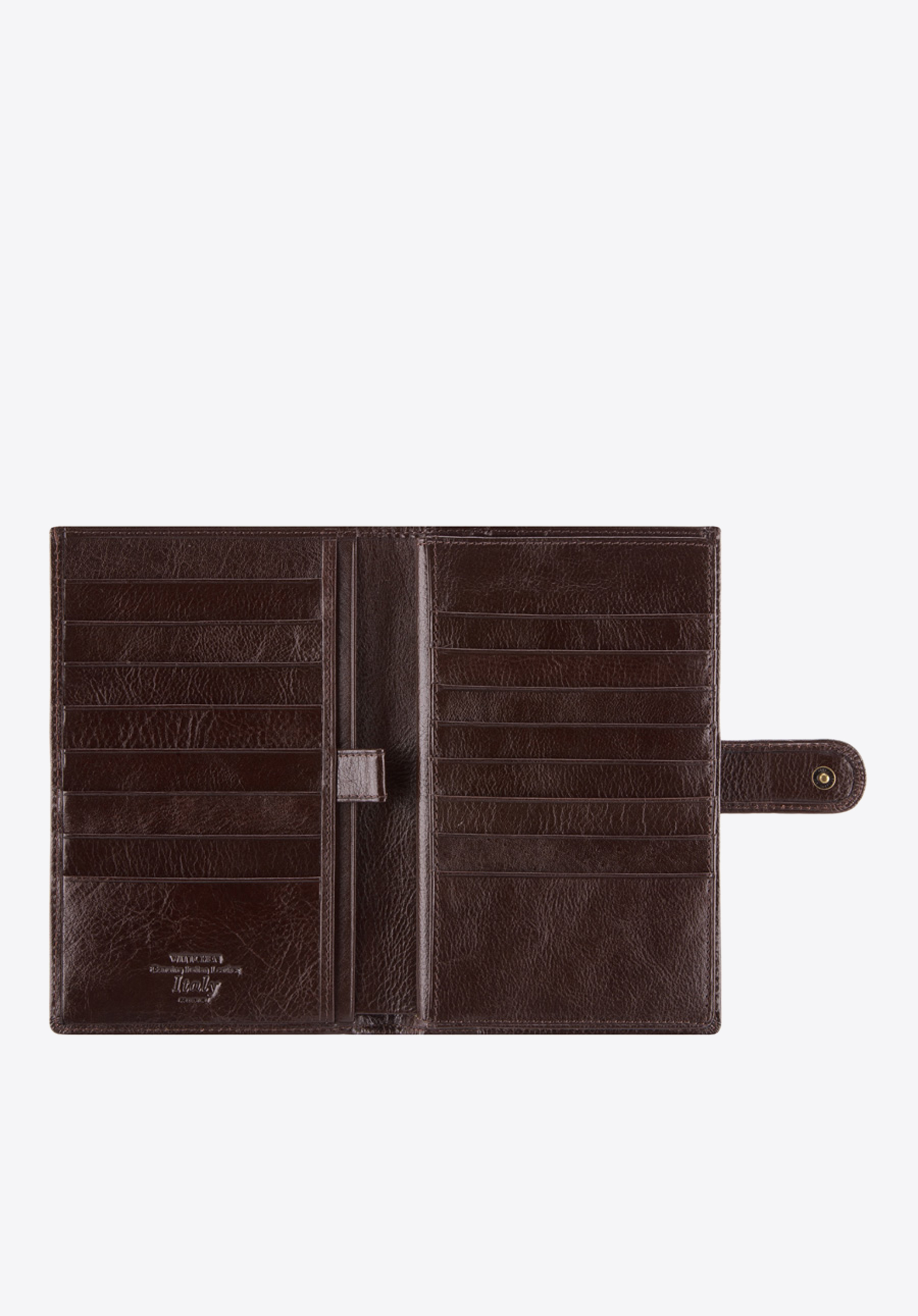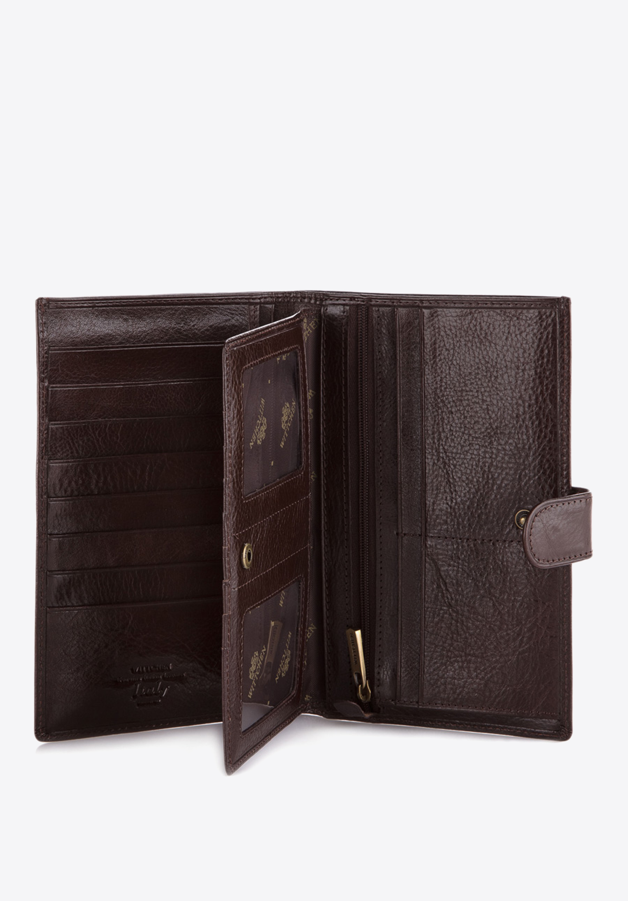 Duży skórzany portfel wykonany z wielkim kunsztem, idealny gadżet dla mężczyzn nowoczesnych oraz tych lubiących klasykę w modzie. Ten model to funkcjonalność zamknięta w stylowej i eleganckiej oprawie.