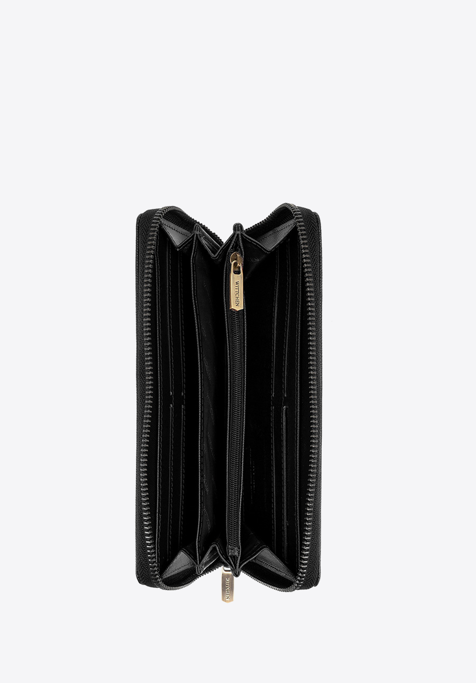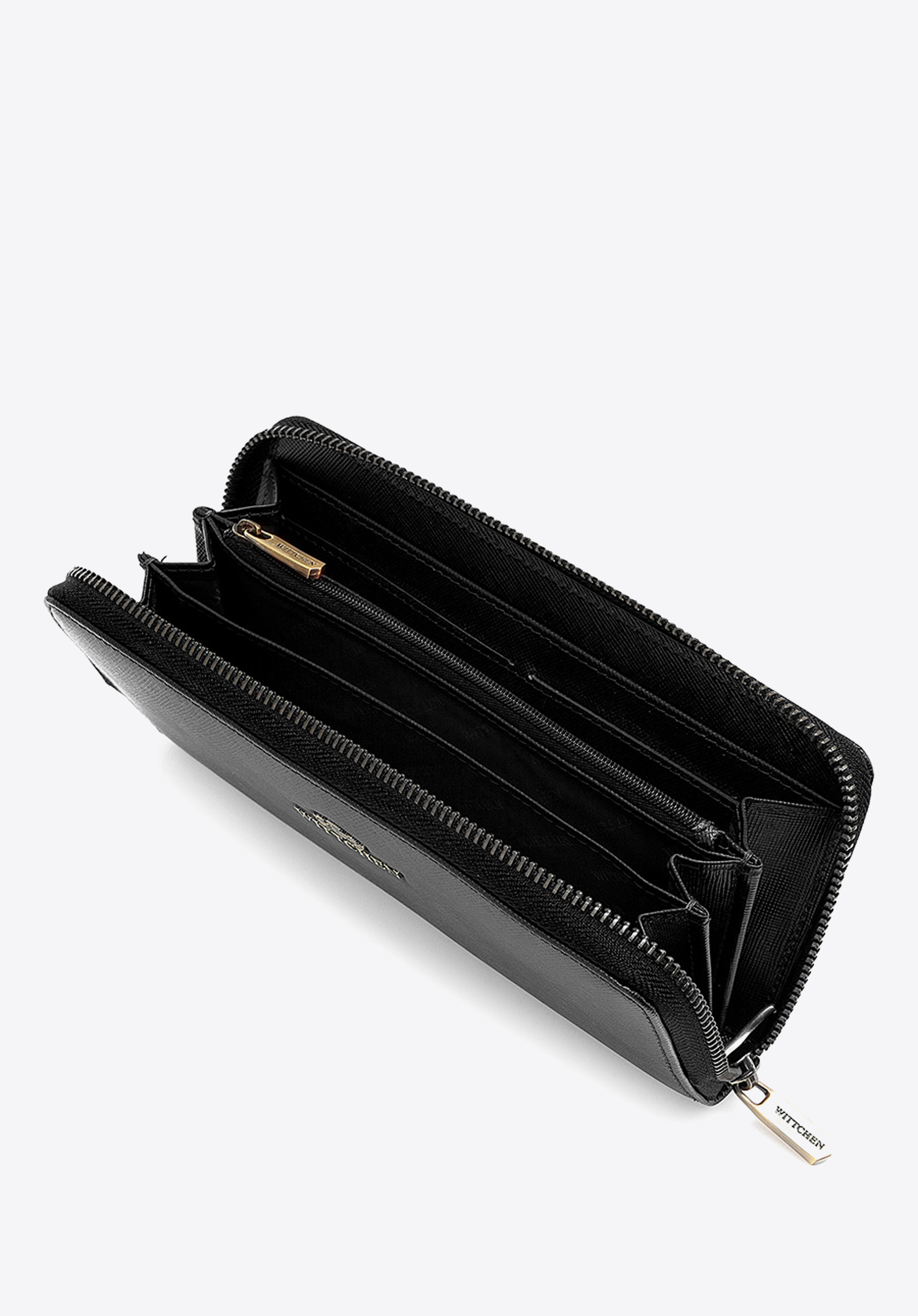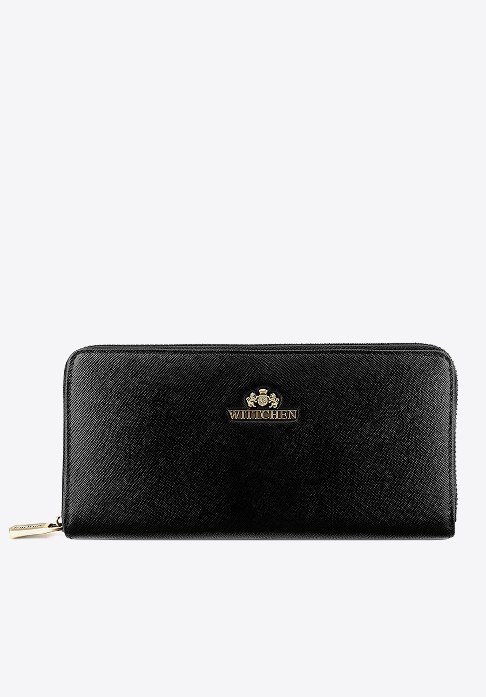 Duży portfel wykonany z matowej, strukturalnej skóry, z charakterystyczną mikrokratką. Prosty wzór wyróżniono umieszczonym z przodu logo - metalowa blaszka z herbem WITTCHEN w kolorze starego złota.