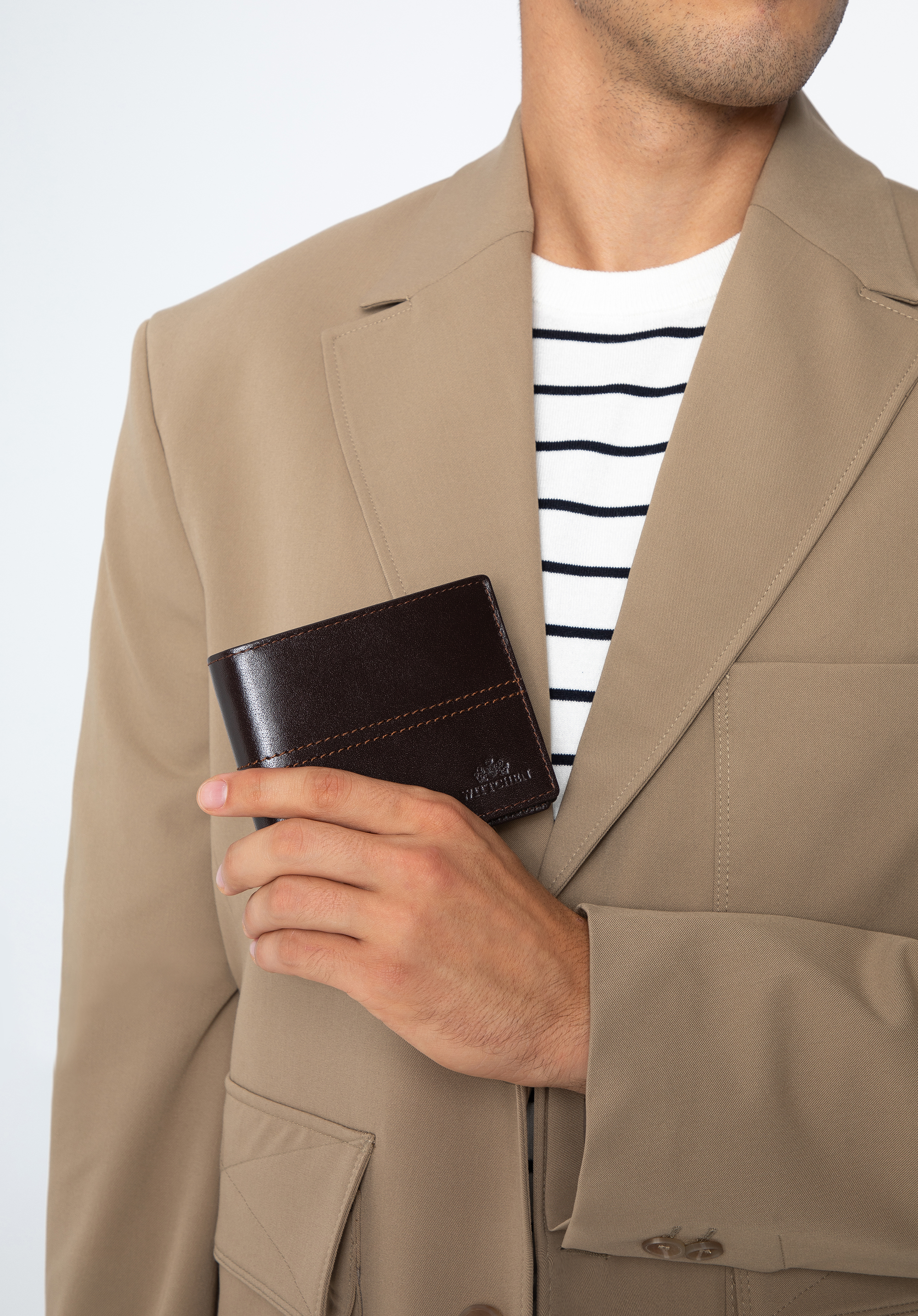 - bardzo odporny na zarysowania portfel męski wykonany z najwyższej jakości, miękkiej skóry cielęcej;