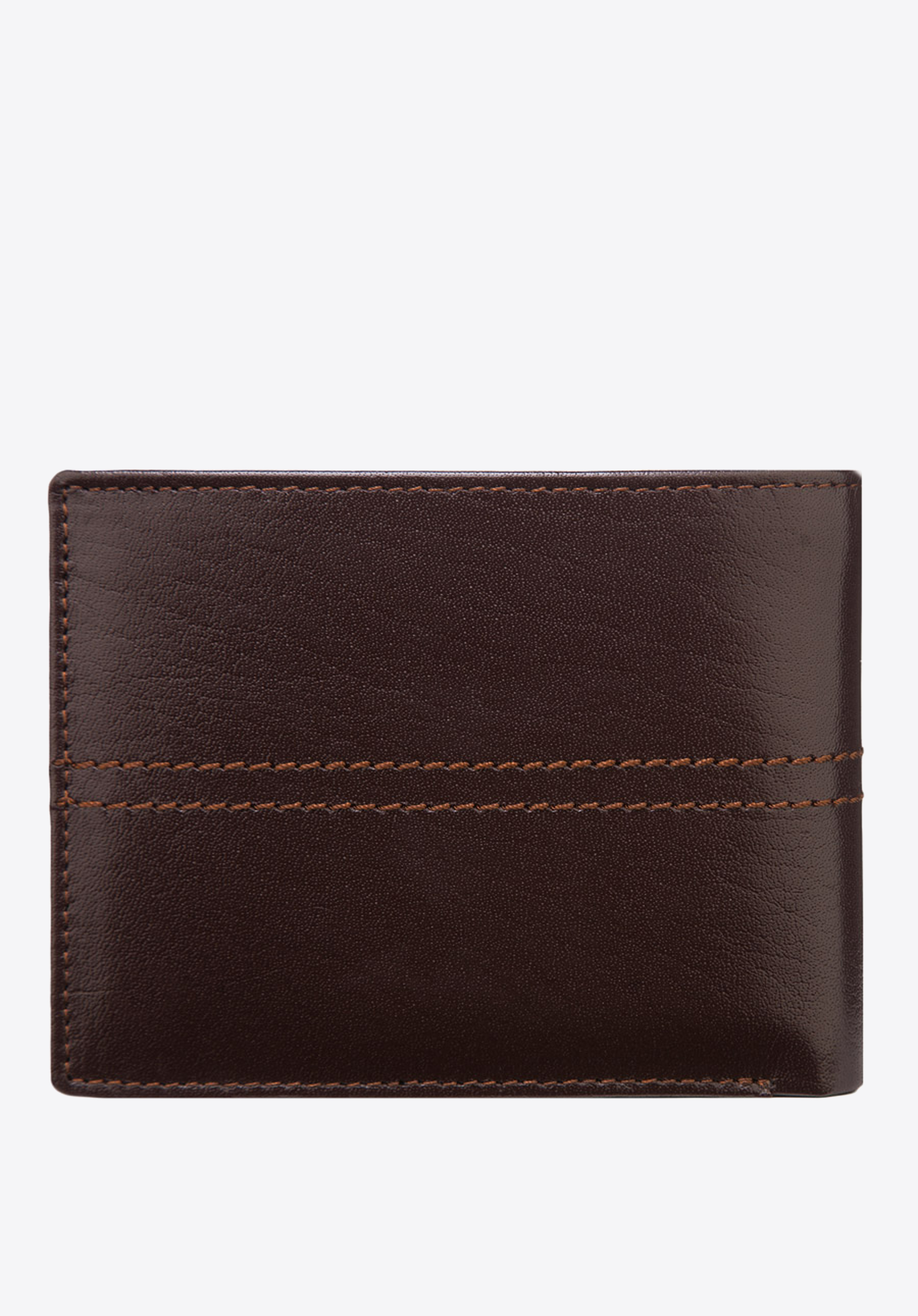 Portfel męski skórzany uszyty z wytrzymałej skóry licowej z widocznymi jarzmowaniami. Model dostępny w uniwersalnej kolorystyce, podkreślony przeszyciami docenią klienci za prosty design.