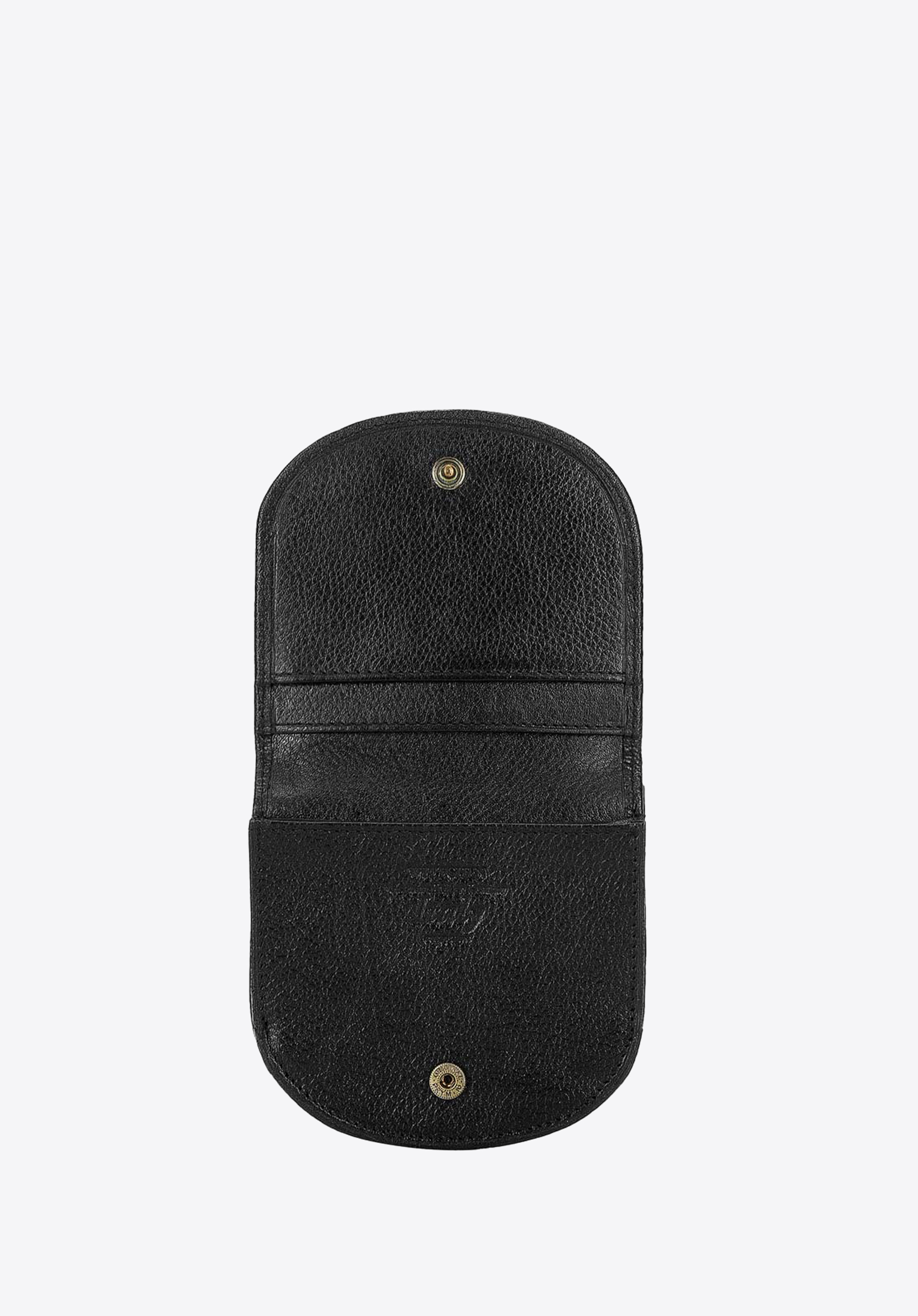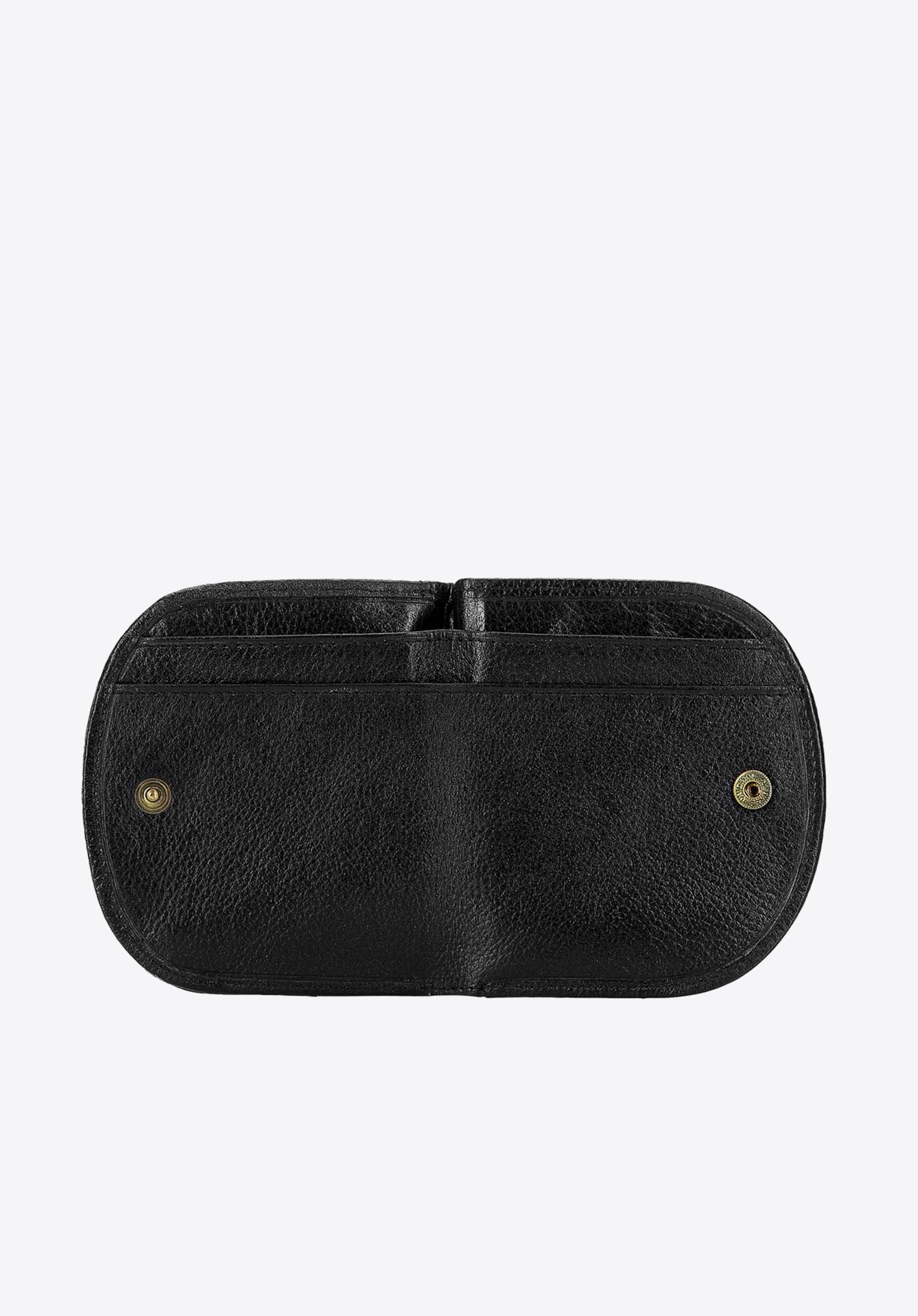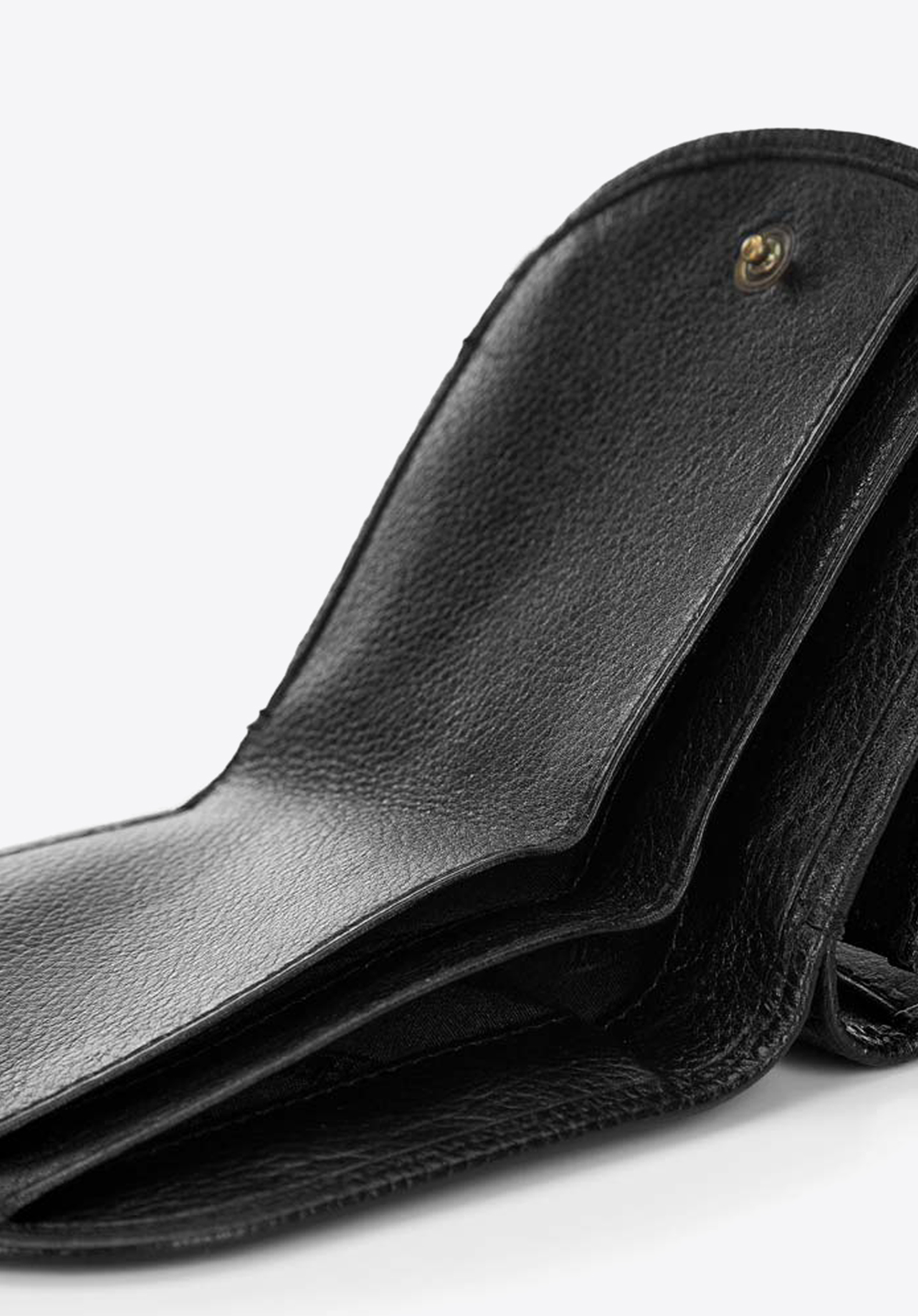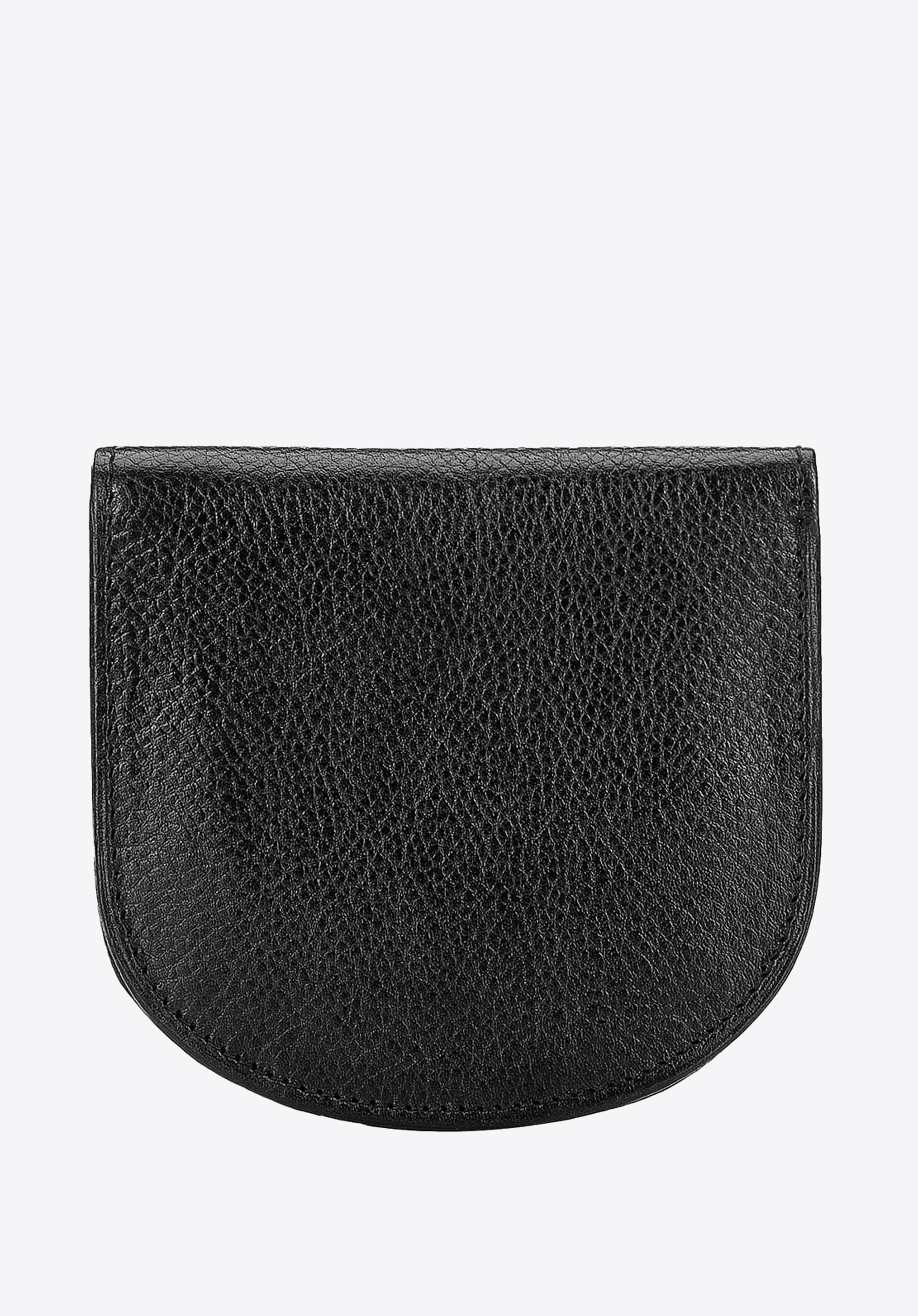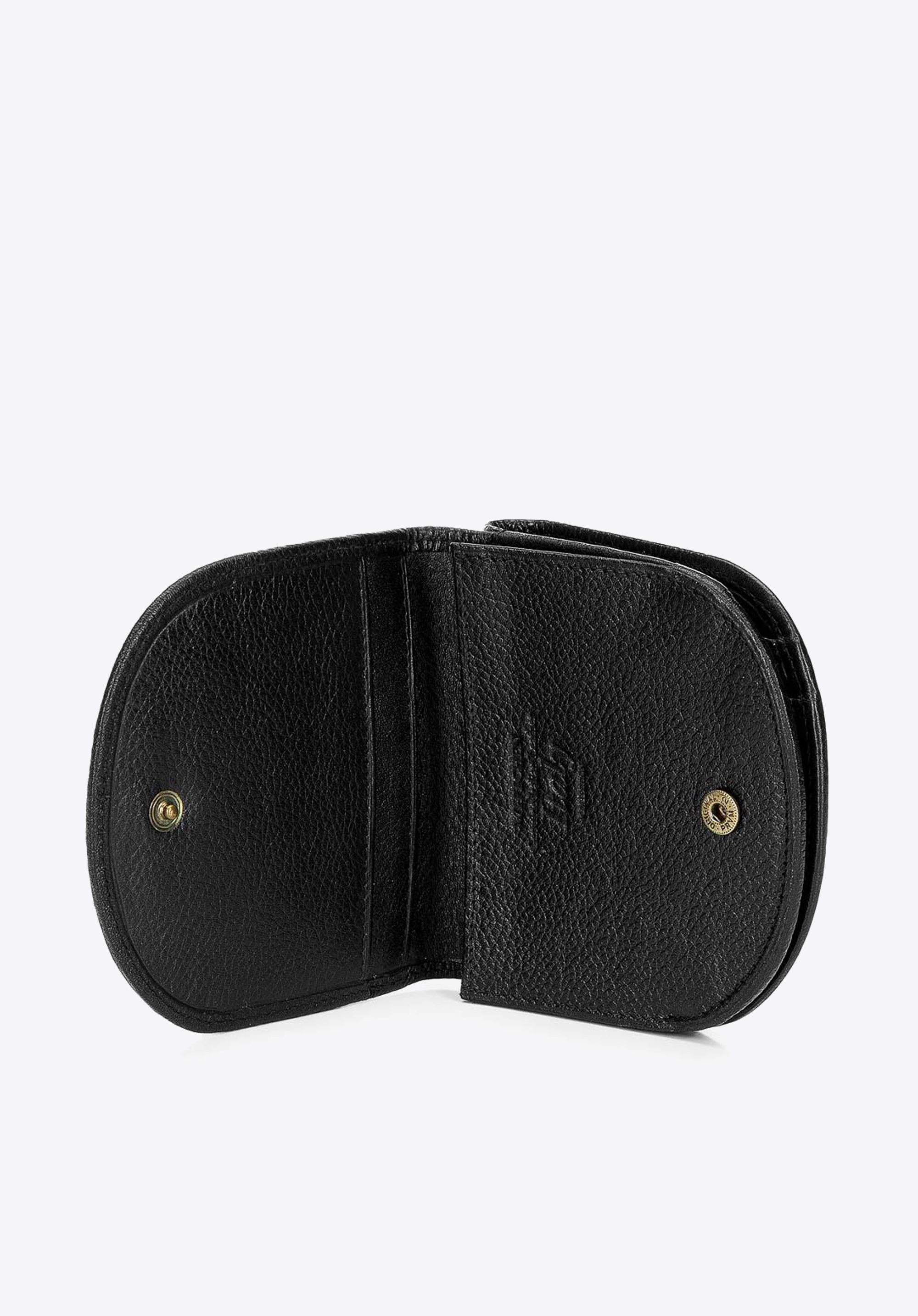 Zaokrąglony portfel zapinany na zatrzask.