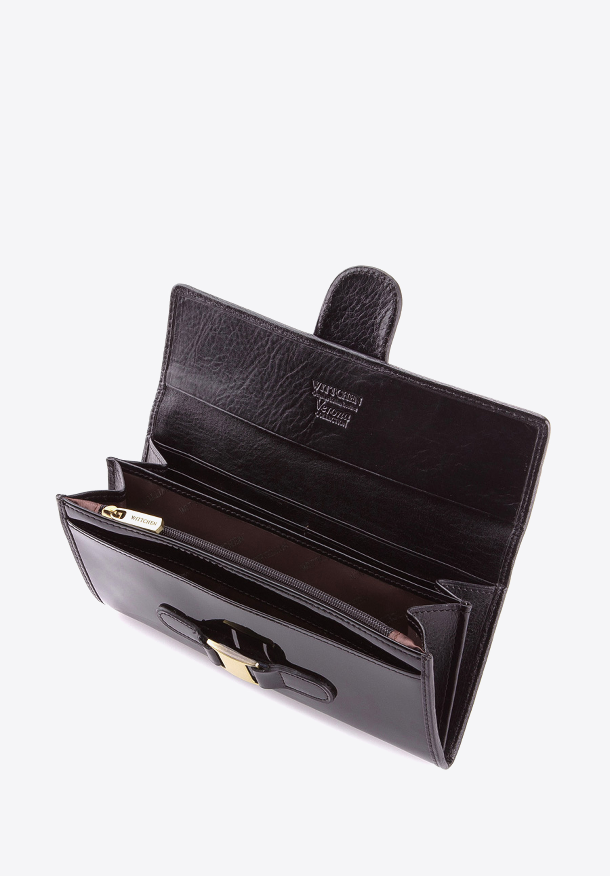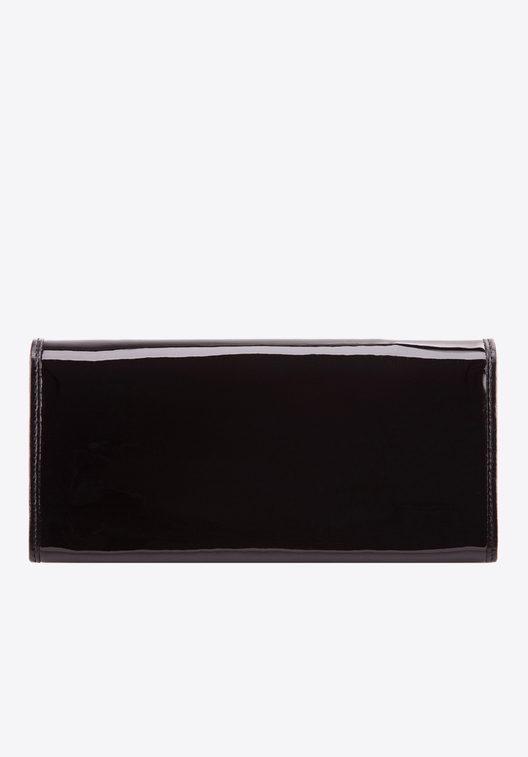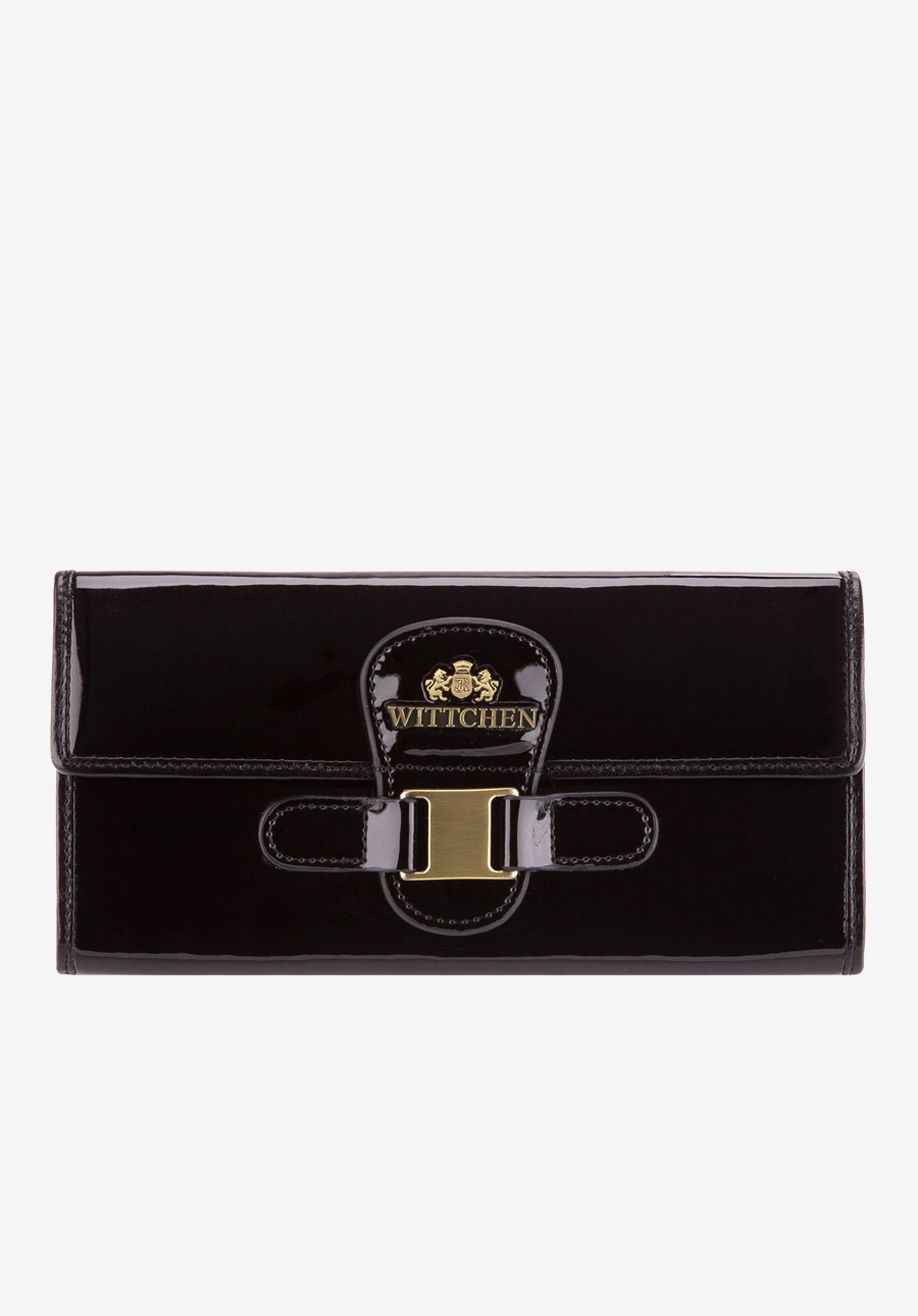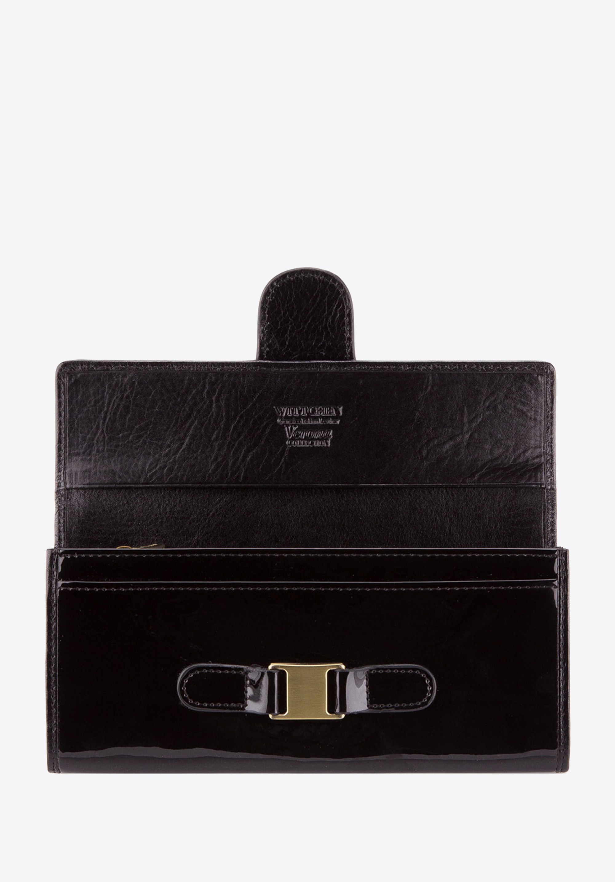 Duża skórzana portmonetka to propozycja dla Pań ceniących modele funkcjonalne i przykuwające uwagę. Elegancka i bardzo szykowna skóra lakierowana sprawia, że portmonetka prezentuje się wyjątkowo efektownie. Zastosowanie dwóch rodzajów skór - lakierowanej na zewnątrz oraz licowej wewnątrz i na obszyciach dodaje całości oryginalnego sznytu. Pojemne przegrody pomieszczą banknoty, karty płatnicze oraz dokumenty.